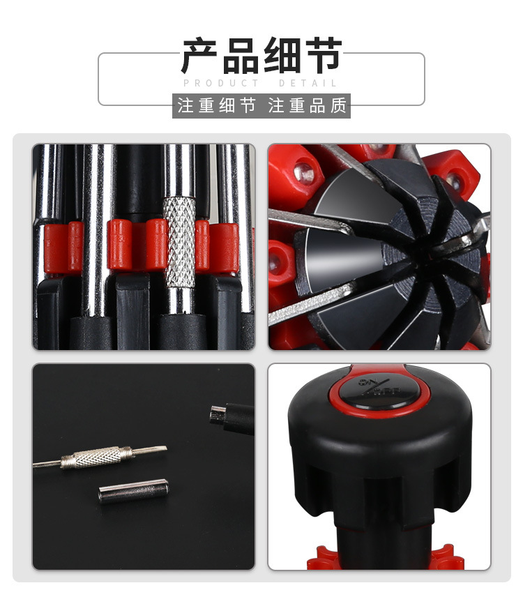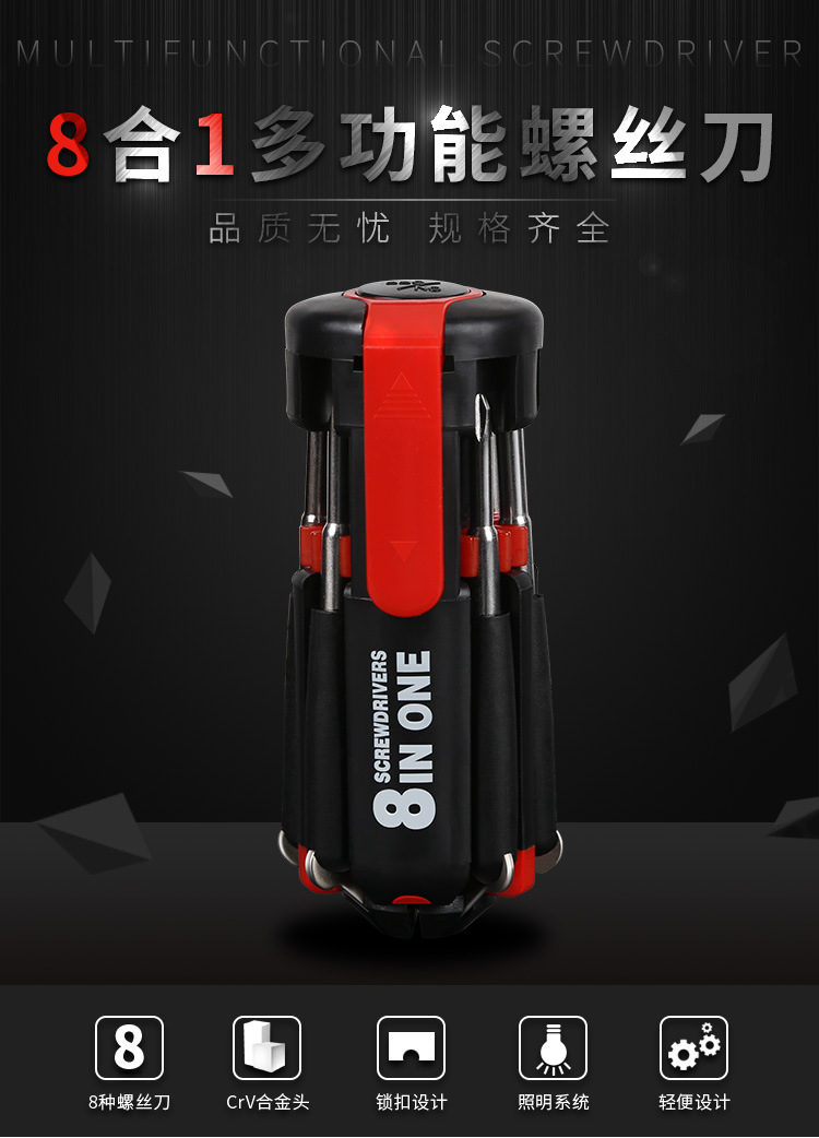 生活创意 非常实用的会亮光的8头螺丝刀,带有8个螺丝刀头,分为十字螺丝刀跟一字螺丝刀两种,螺丝刀的尺寸有些不同,可以用来旋不同的螺丝(修眼镜、拆电脑机箱等等)。.重要的特点是这款螺丝刀装上两节电池之后,多功能螺丝刀还会亮光,因此,也适合夜间及暗处使用。