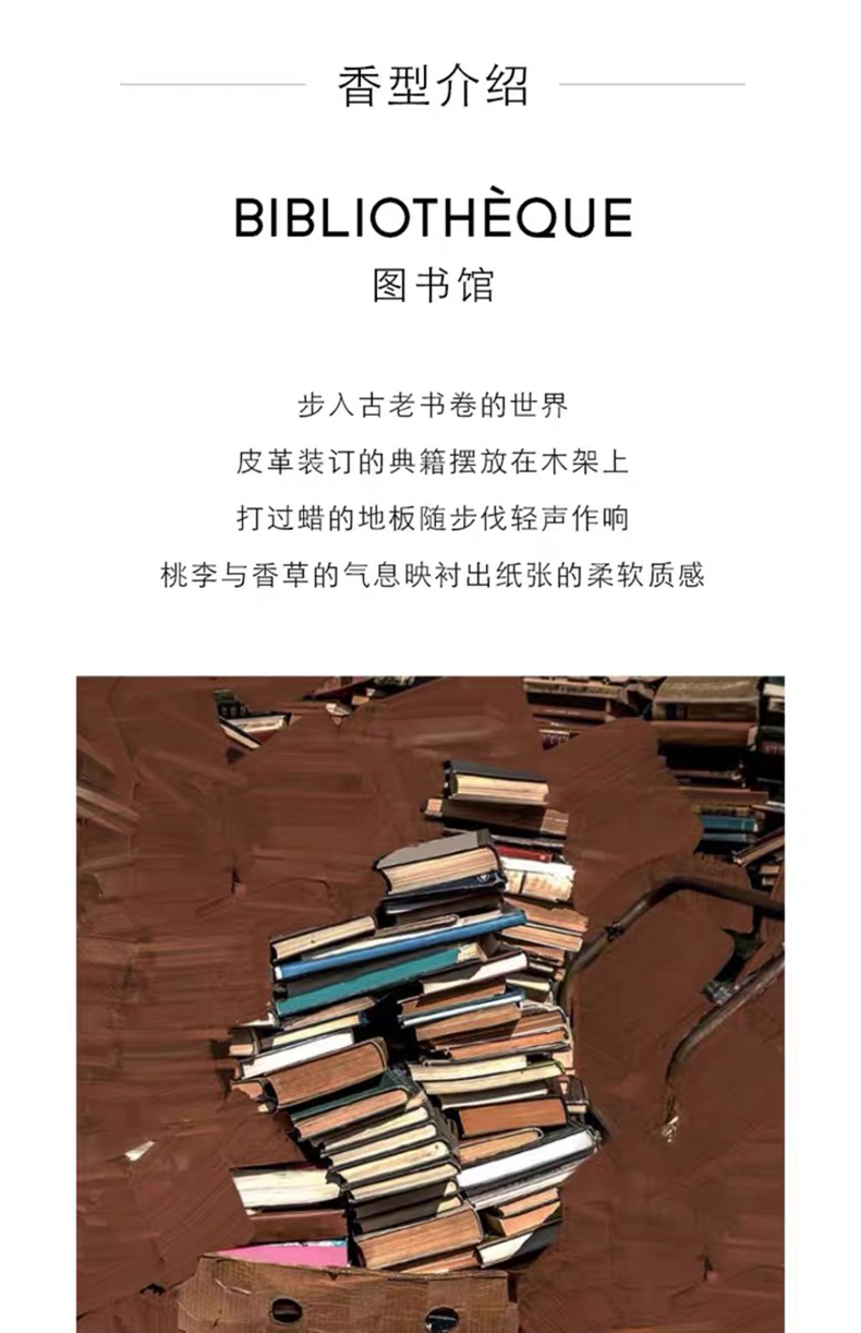 这是个布满古老书卷的世界,皮革装订的典籍被摆放在黑色木架上,散发出别样的气味,打过蜡的地板随着步子轻声作响,李子和香草的芬芳映衬出书间纸张的柔软质感。