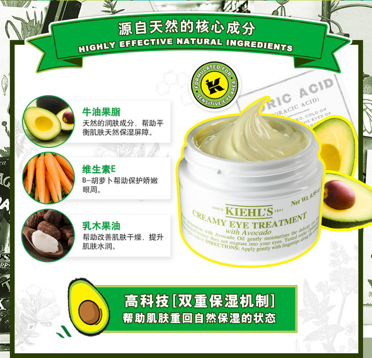 Kiehl's科颜氏牛油果保湿眼霜14g 舒缓眼周 双重保湿