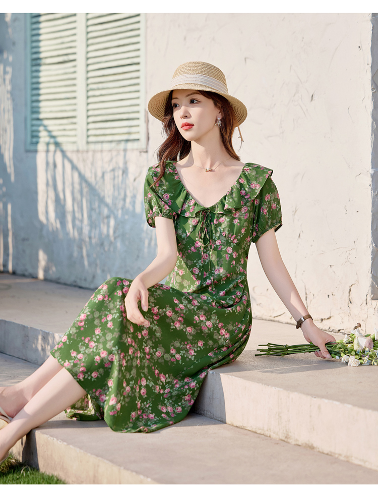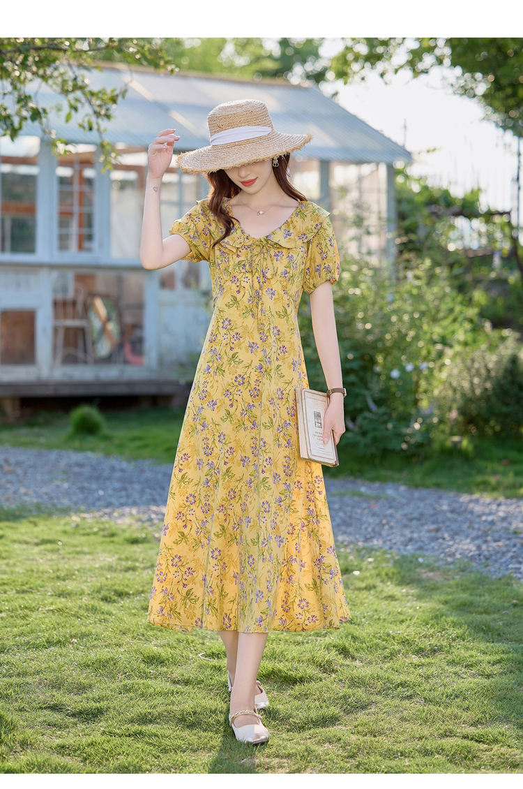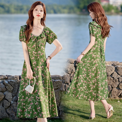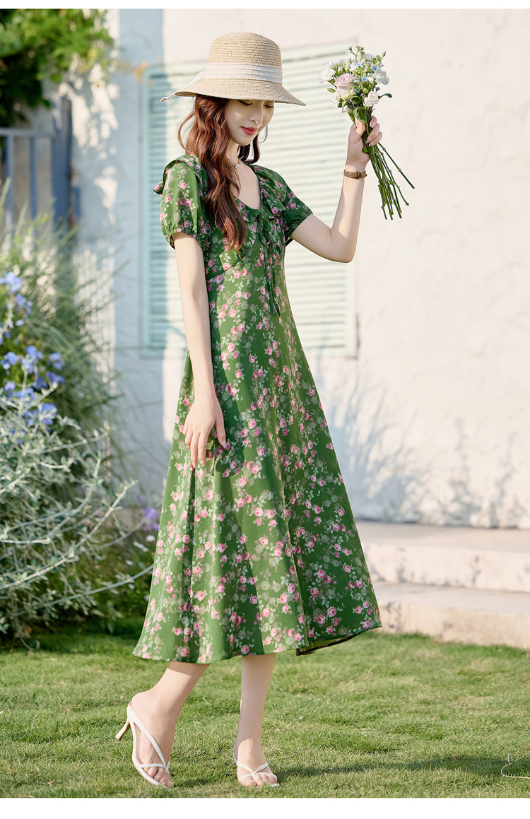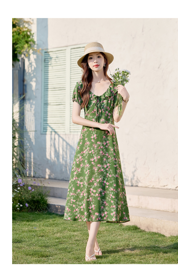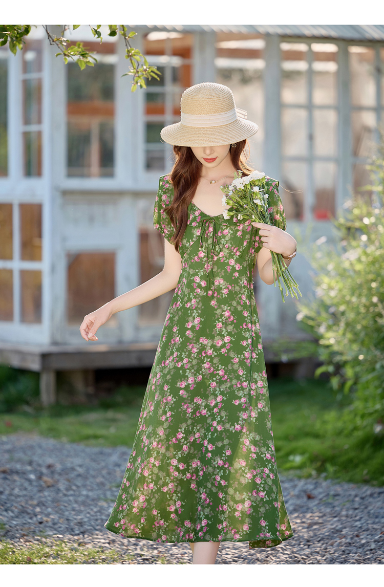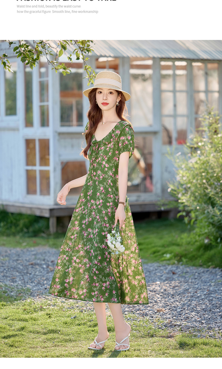 V领中长款碎花连衣裙,收腰显瘦修身过膝中长裙HR-HBLJRA1177