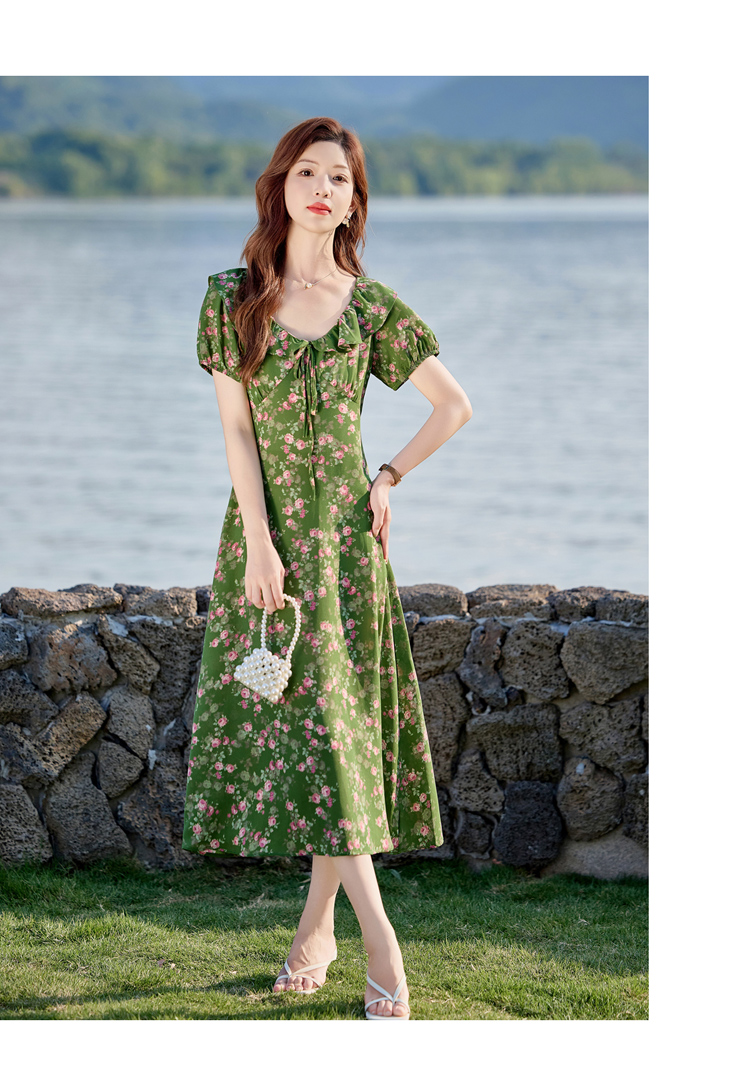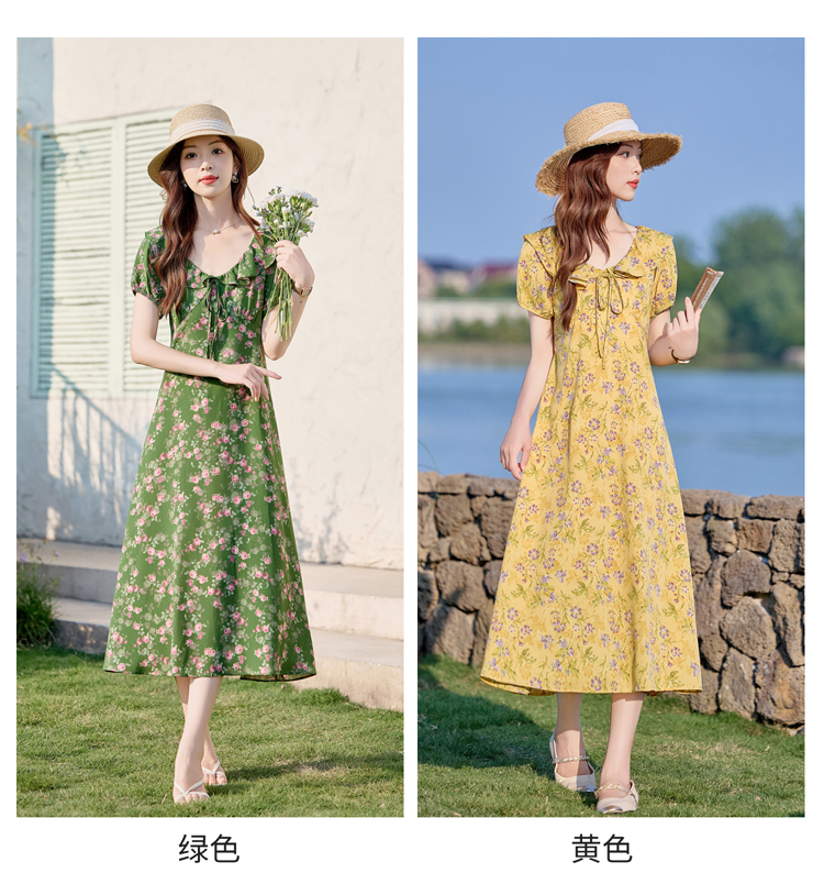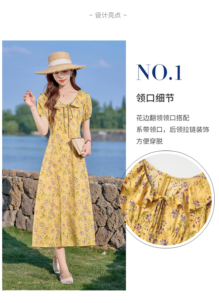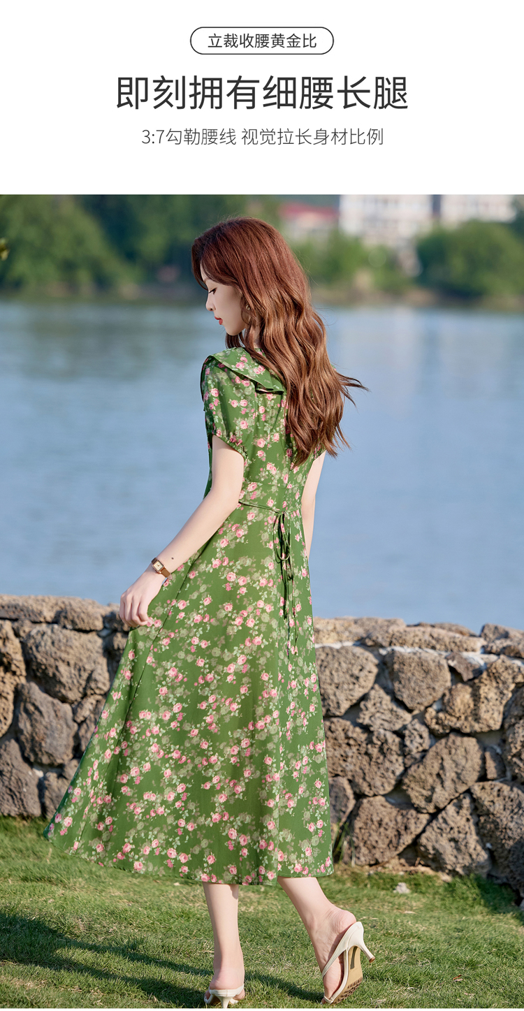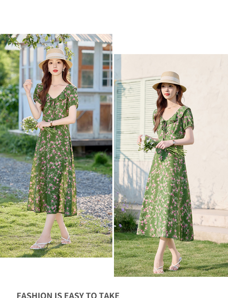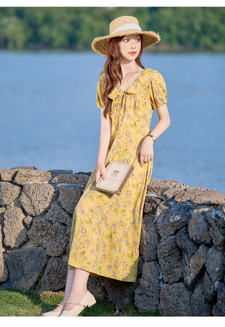V领中长款碎花连衣裙,收腰显瘦修身过膝中长裙HR-HBLJRA1177