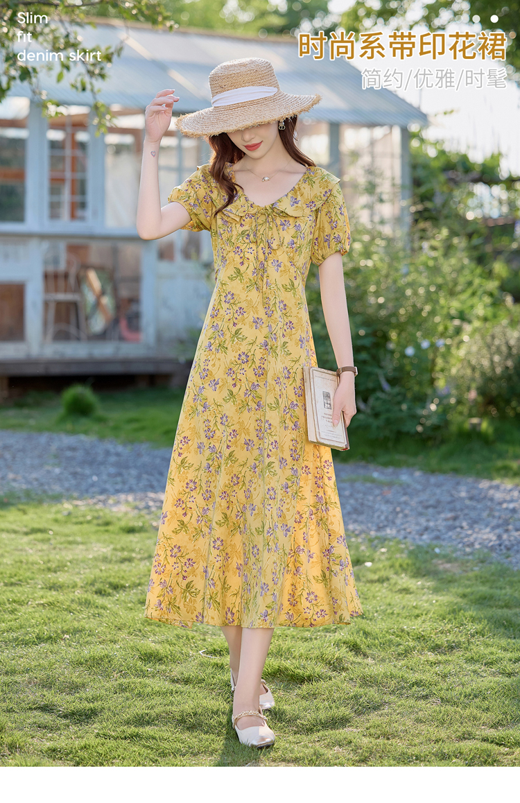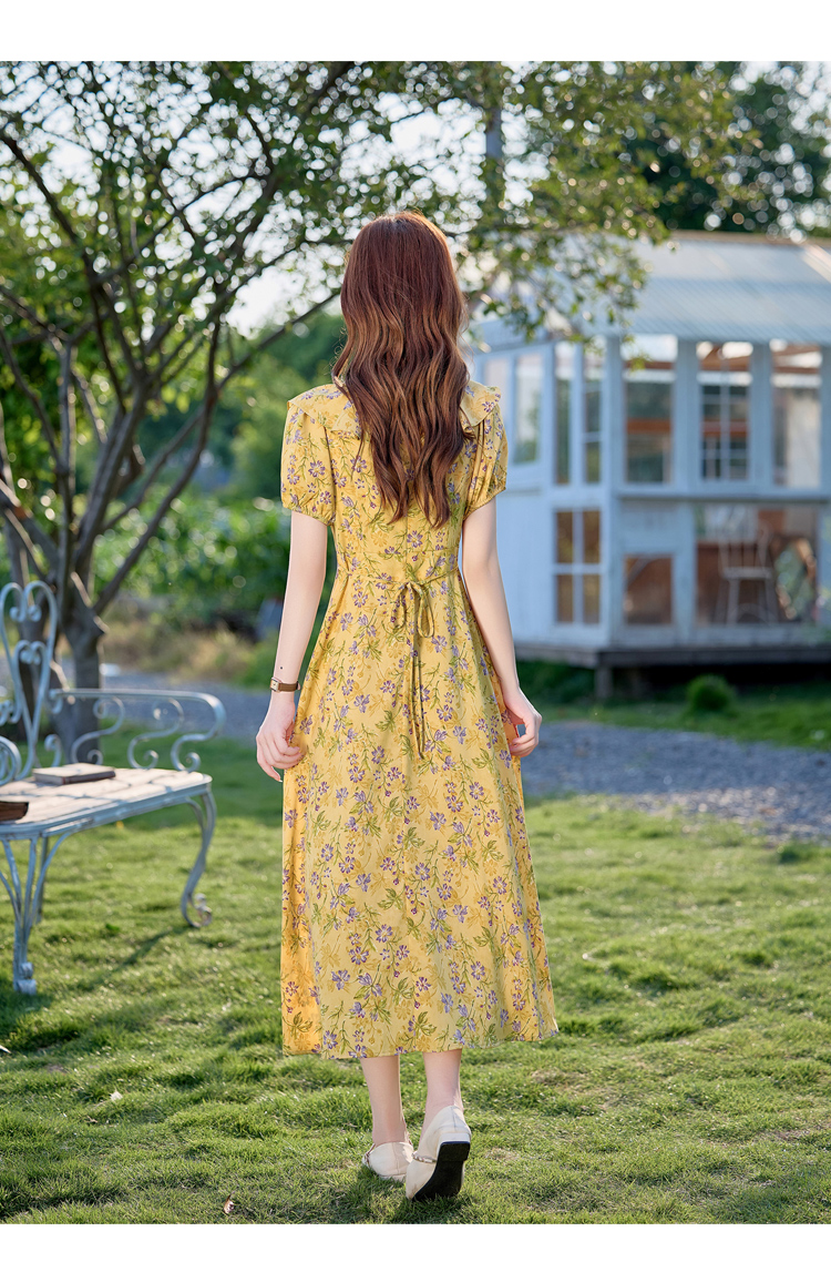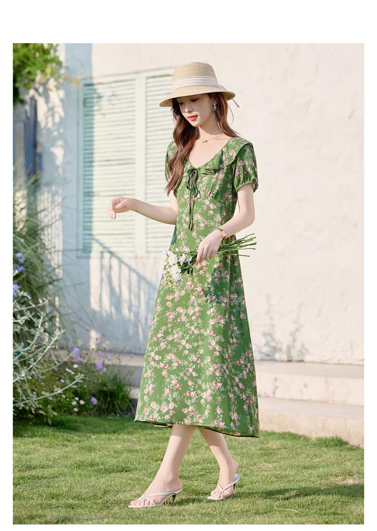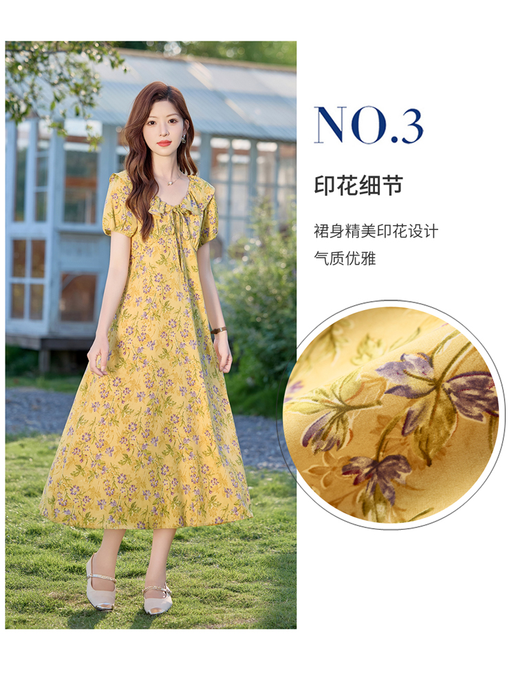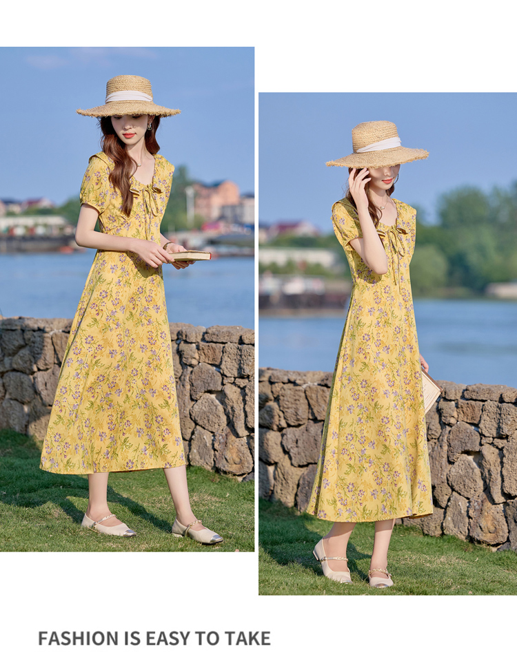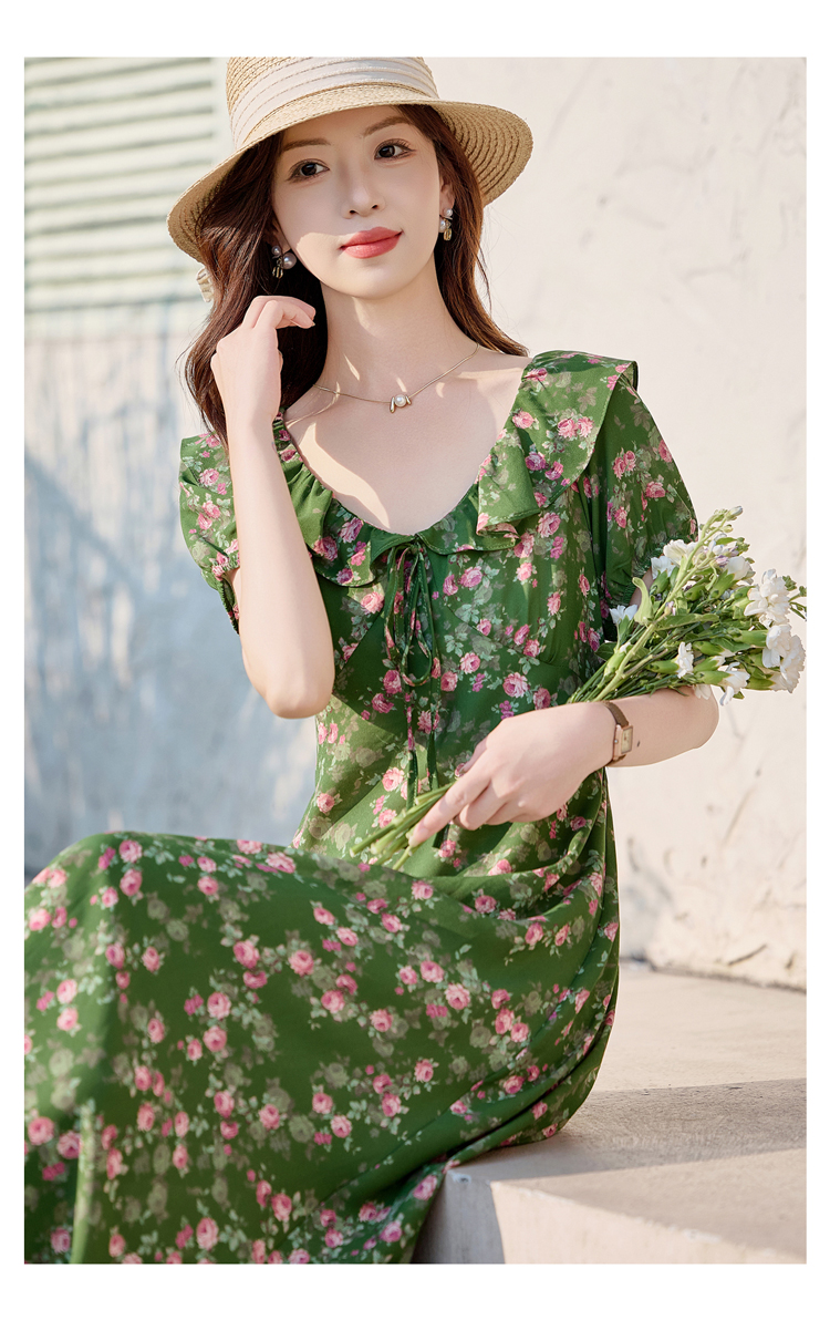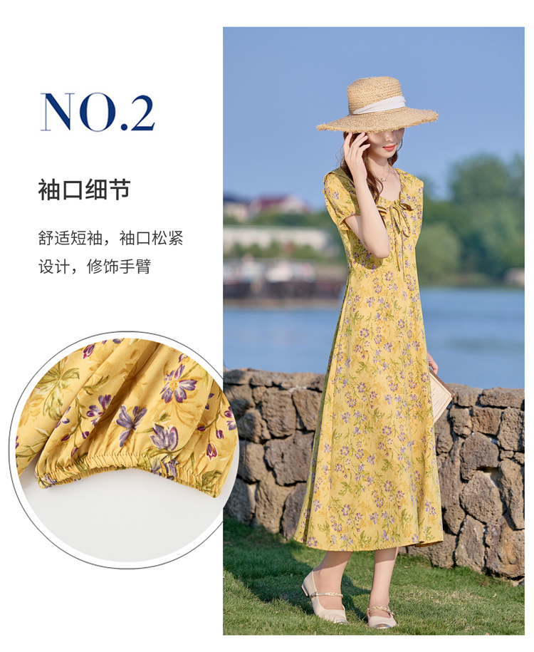 V领中长款碎花连衣裙,收腰显瘦修身过膝中长裙HR-HBLJRA1177
