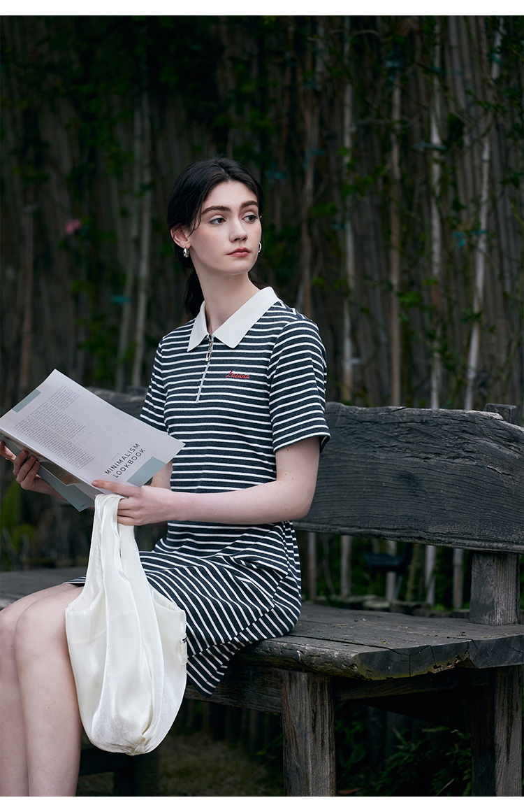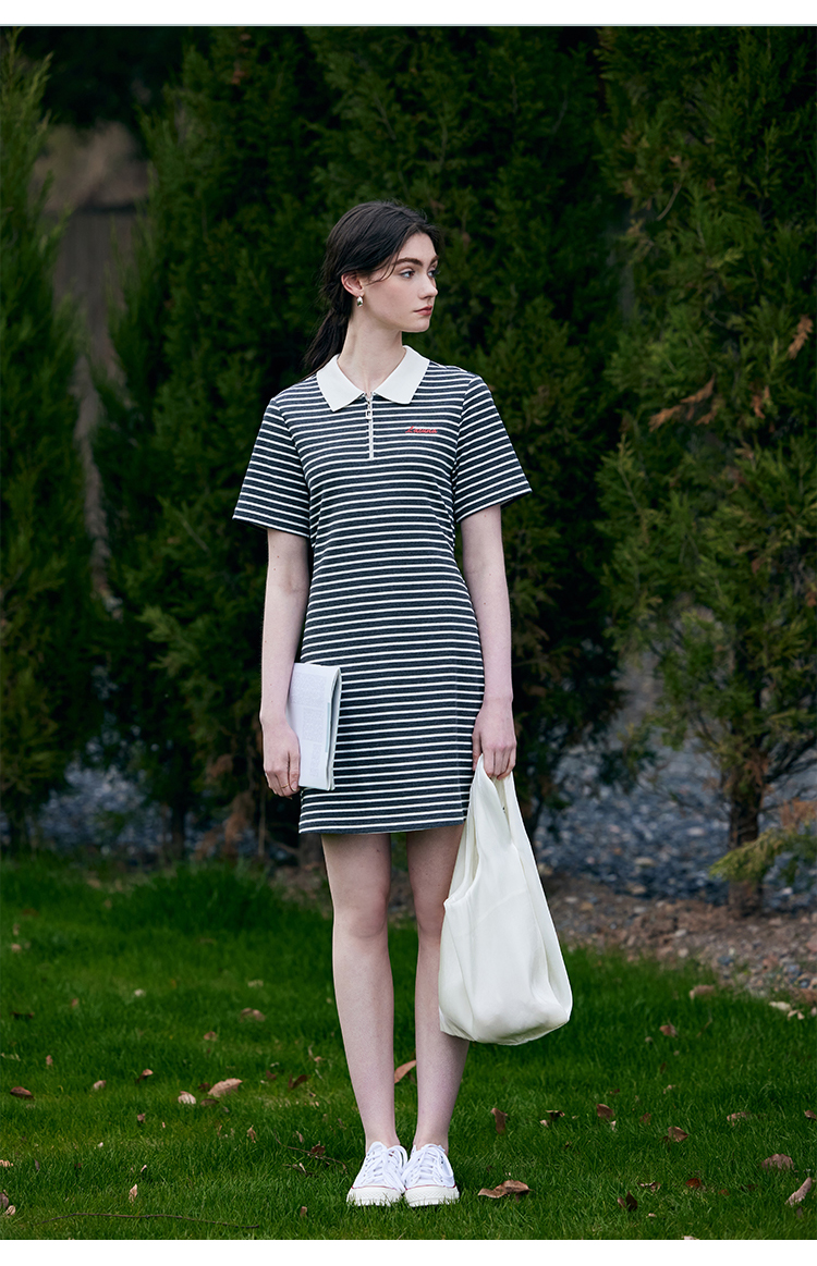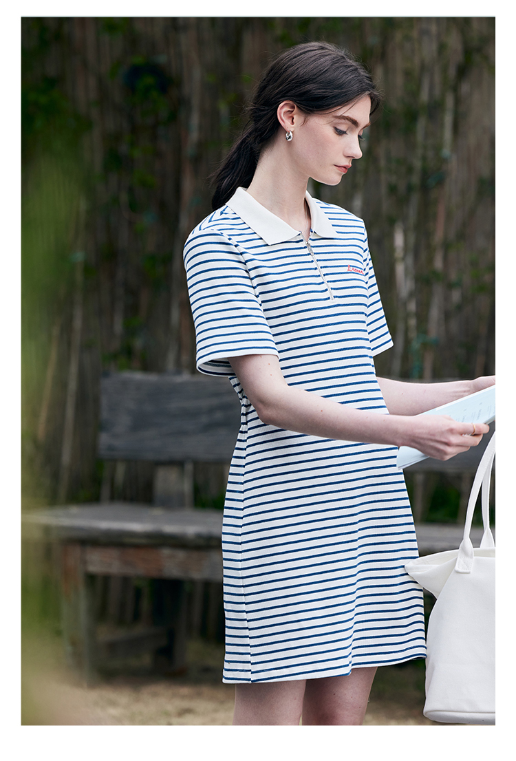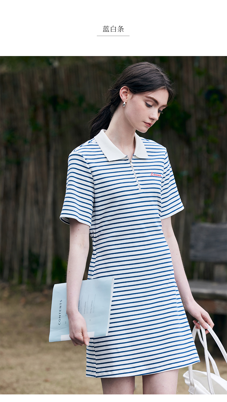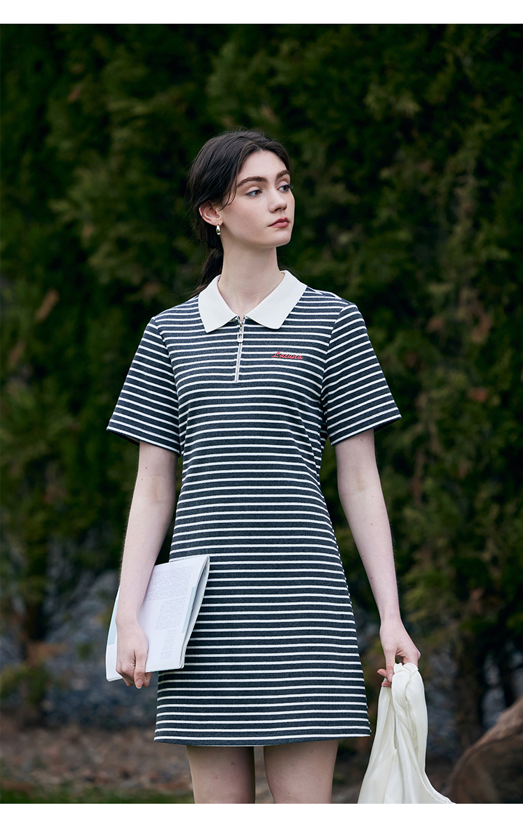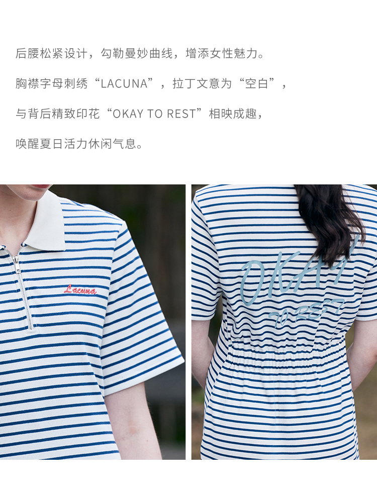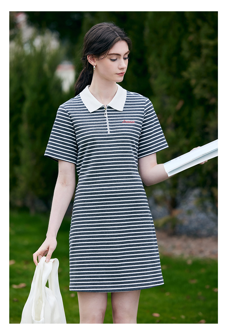 HeyDress条纹polo连衣裙女夏季翻领宽松直筒裙休闲小个子印花裙子