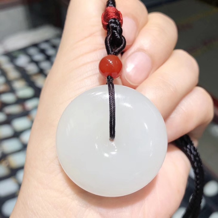 【羊脂玉平安扣】玉质细腻脂份浓郁,扣形饱满圆润,男女老少皆可佩戴,寓意:平安无事,一团和气,圆圆满满。规格:24.1x8.3mm,重量:10克