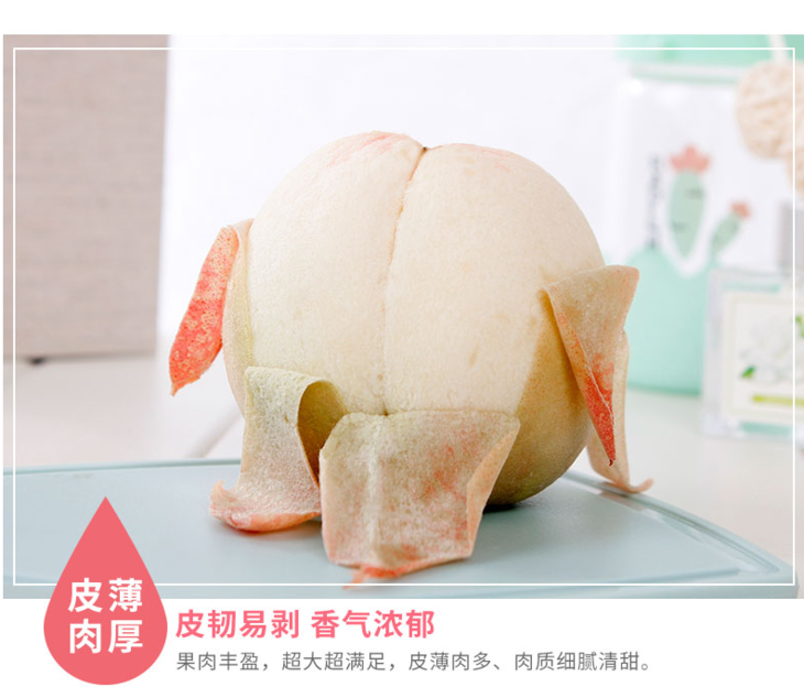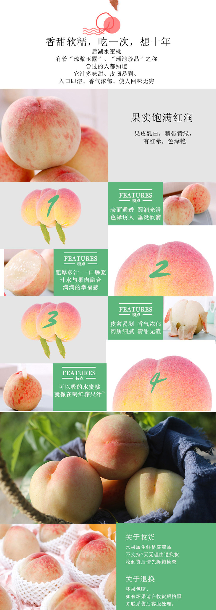 正宗水蜜桃可以直接剥皮,拿很远就能闻到浓郁的桃香,上面的毛柔软细嫩,最主要的是咬一口满口香甜,汁液四溅。吃水蜜桃,认准后湖牌~鲜嫩多汁~果肉致密~甜过初恋~香味浓郁~入口即化~