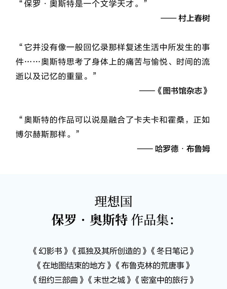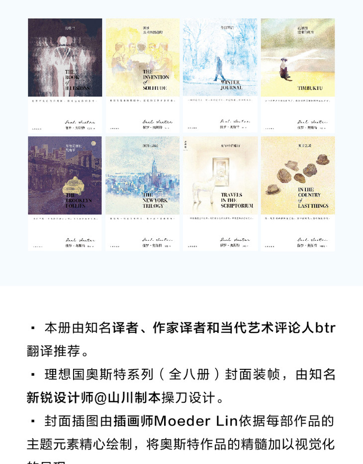 《4 3 2 1》《幻影书》《孤独及其所创造的》《在地图结束的地方》《布鲁克林的荒唐事》《纽约三部曲》《末世之城》《密室中的旅行》《冬日笔记》