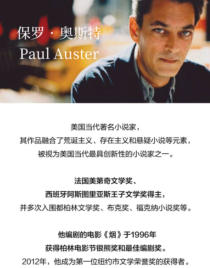 保罗•奥斯特(Paul Auster),1947年出生于新泽西的纽瓦克,著名小说家、诗人、剧作家、译者、电影导演,美国艺术与文学院院士,其作品融合了荒诞主义、存在主义和悬疑小说等元素,被视为美国当代*具创新性的小说家之一。奥斯特著作等身,代表作包括小说《纽约三部曲》《幻影书》《布鲁克林的荒唐事》《巨兽》,以及回忆录《孤独及其所创造的》,评论集《饥渴的艺术》等,曾获法国美第奇文学奖,西班牙阿斯图里亚斯王子文学奖,美国约翰•科林顿文学杰出贡献奖,并多次入围都柏林文学奖、布克奖、福克纳小说奖等,作品已被翻译成四十余种文字。他编剧的电影《烟》于1996年获得柏林电影节银熊奖和*佳编剧奖,2012年,他成为第*位纽约市文学荣誉奖的获得者。