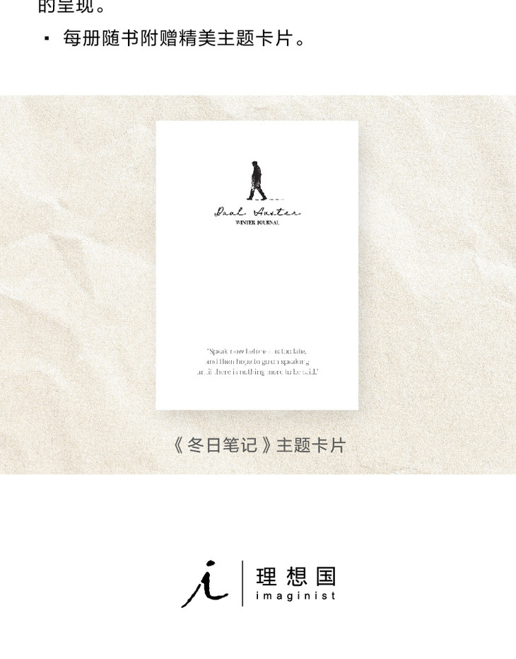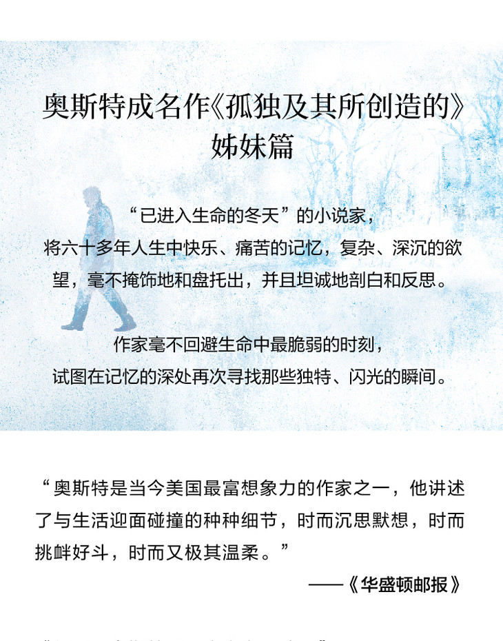 在生命的第六十三个冬天,一个几乎没有太阳、多风多雨的寒冬,保罗·奥斯特坐在桌前,写了一部关于身体的个人史和回忆录,俨然一次穿越冬季之旅。在三十年前的《孤独及其所创造的》中,奥斯特以感人的笔触反思了孤独、父性与写作者的意识,而《冬日笔记》是更为坦诚的自我剖白和省思,他将六十多年人生中快乐、痛苦的身体记忆,复杂、深沉的情感欲望,与父母之间的羁绊,包括那些*脆弱的时刻,毫不掩饰地和盘托出,试图在记忆的沟壑深处再次寻觅独特、闪光的瞬间。
