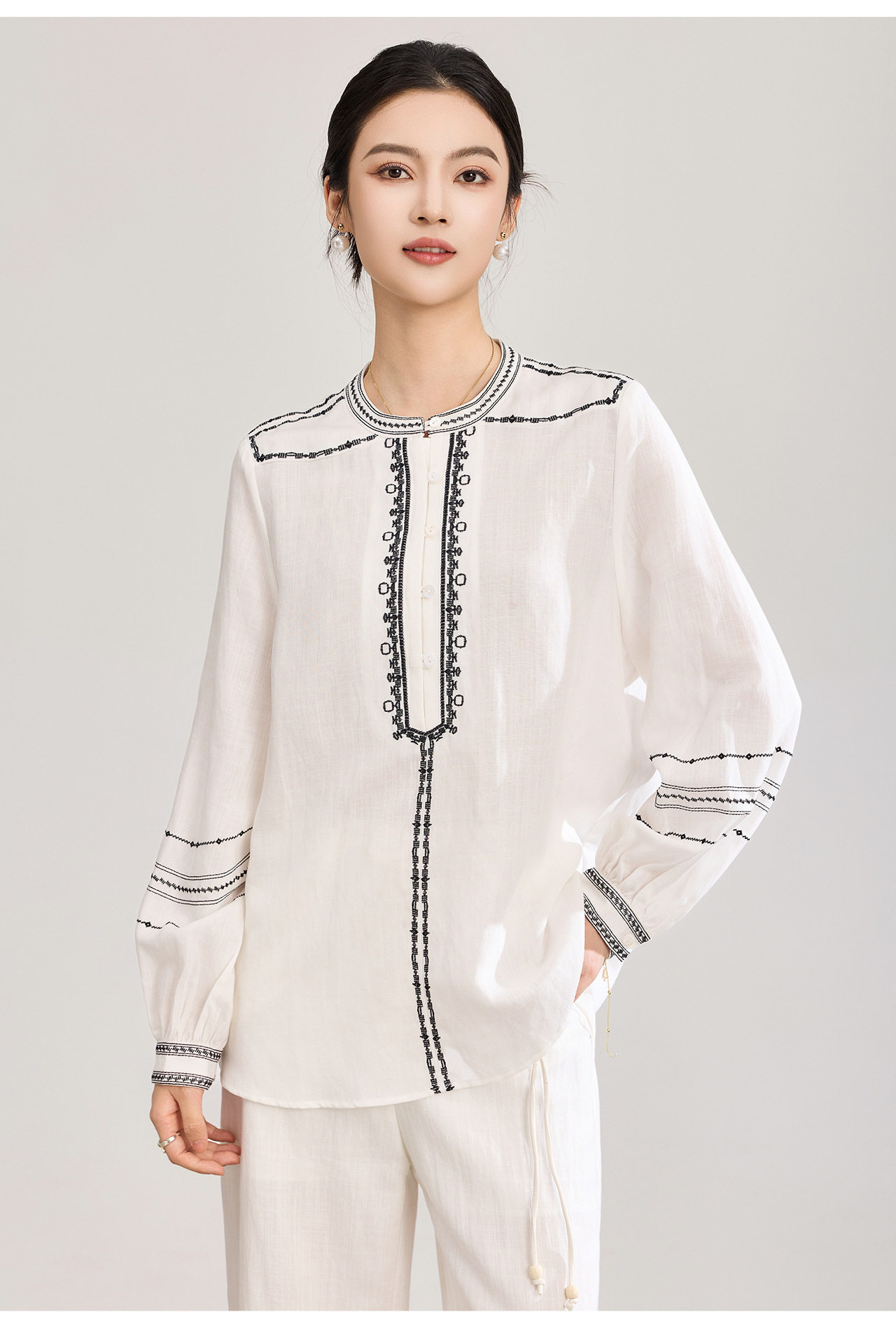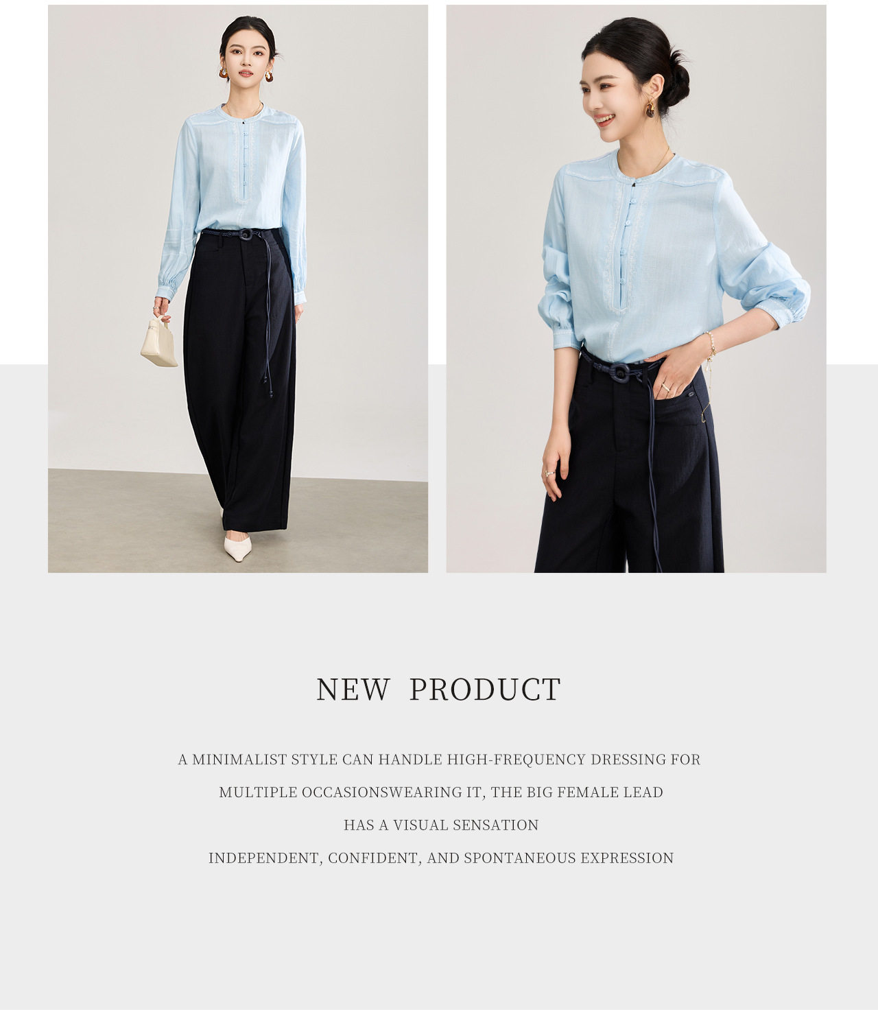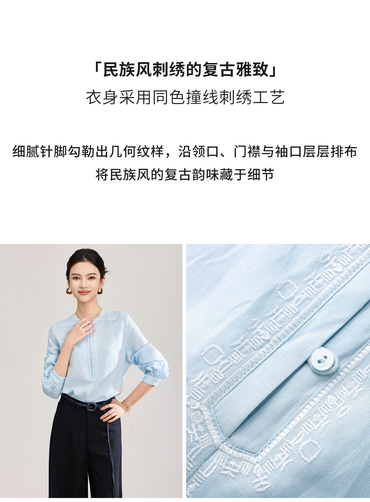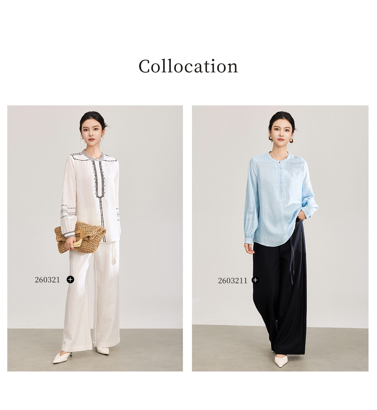 「高货wl」全新升级【铂金会员330/天猫439/差价109】(00957)洛诗琳法式氛围感撞色上衣2026新款天丝亚麻圆领衬衫女