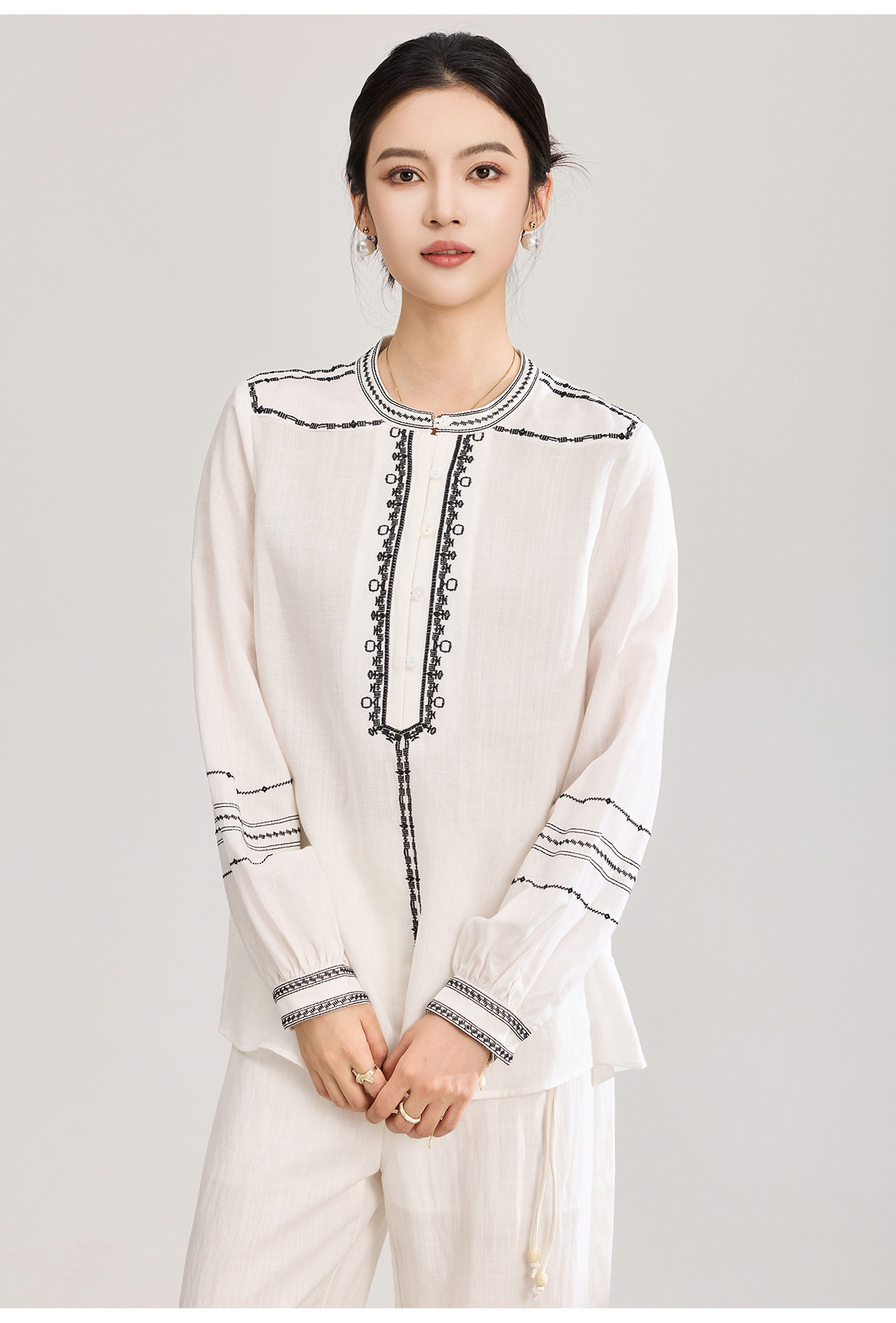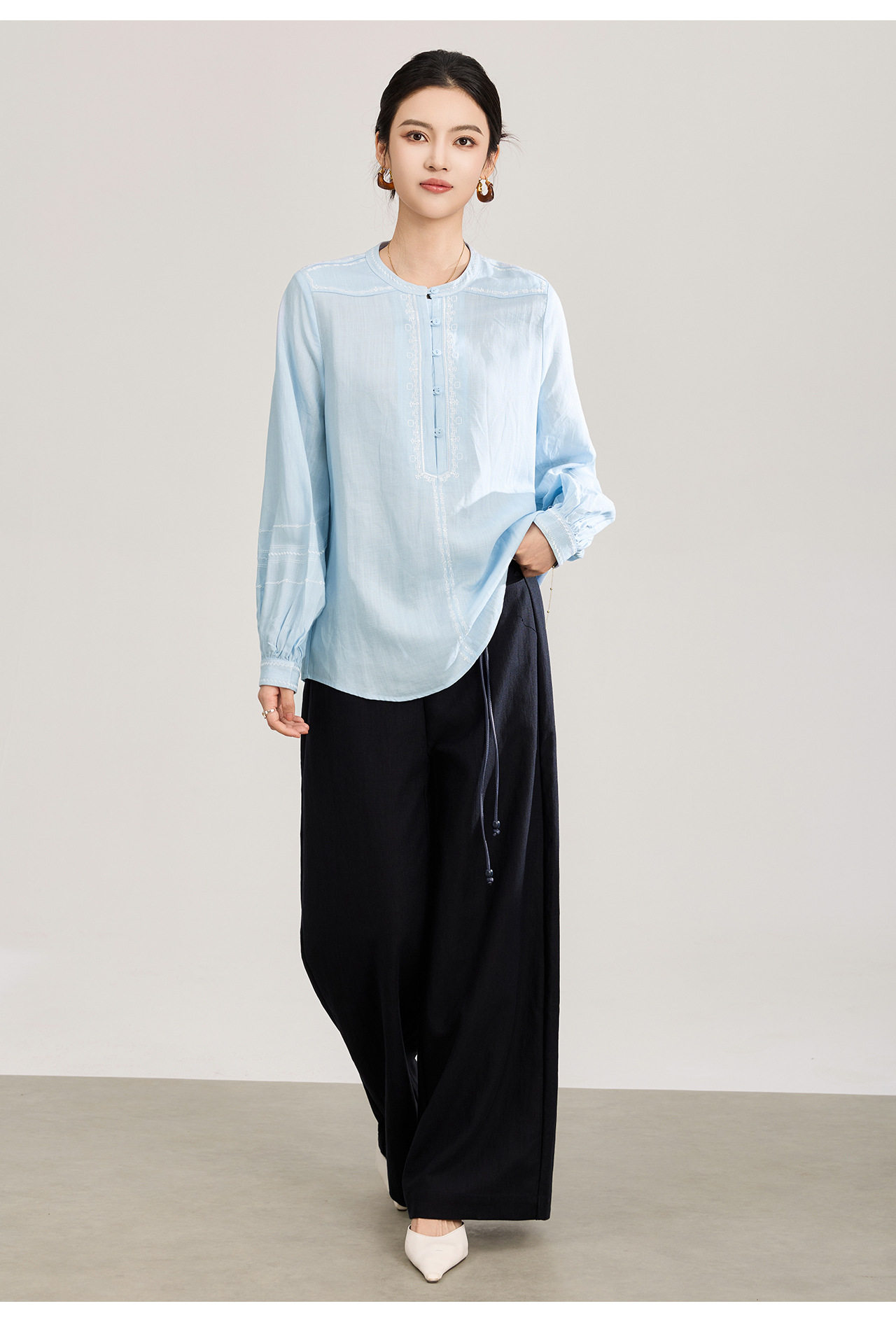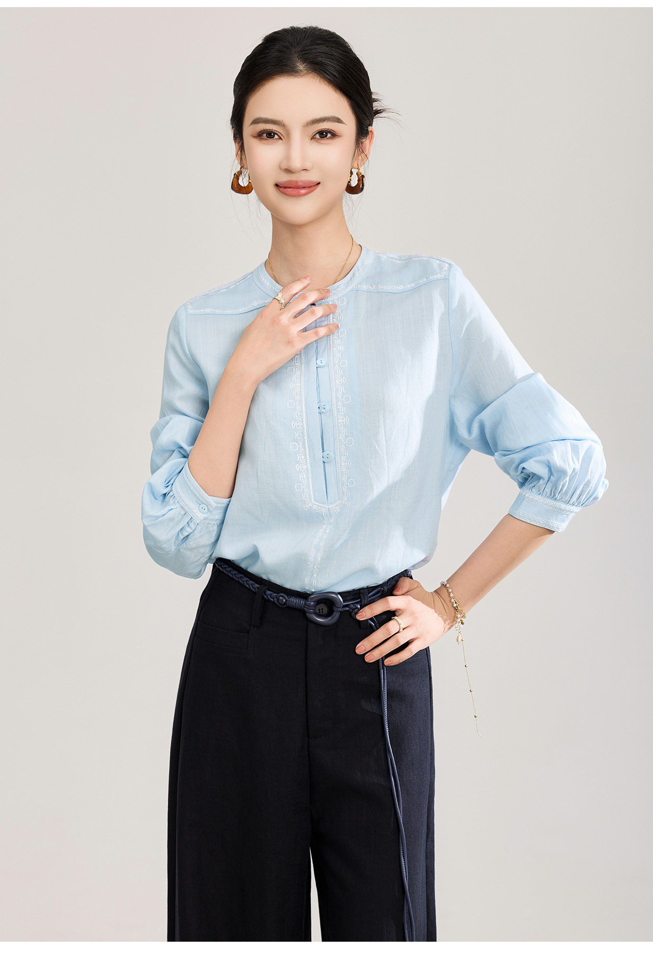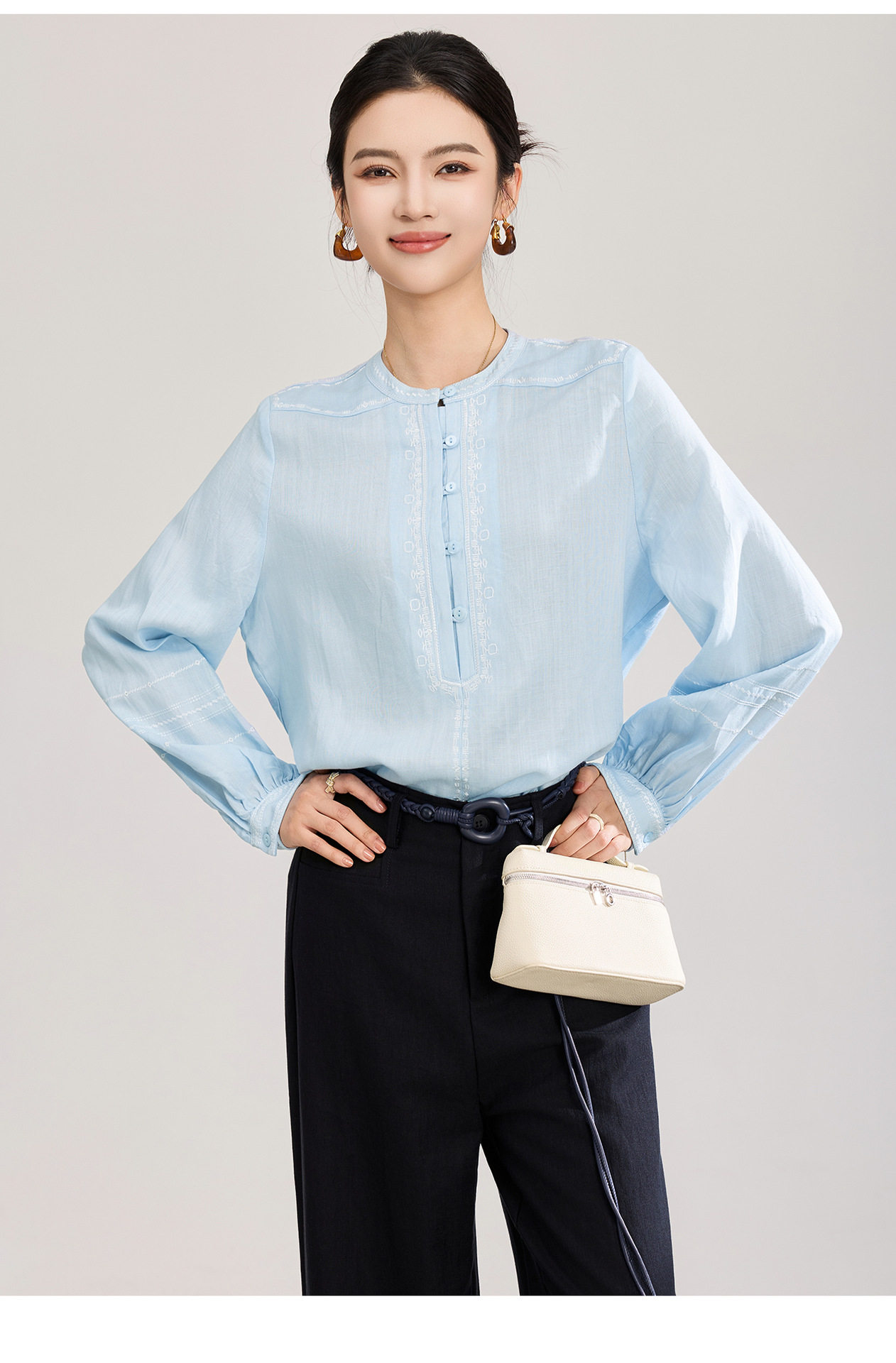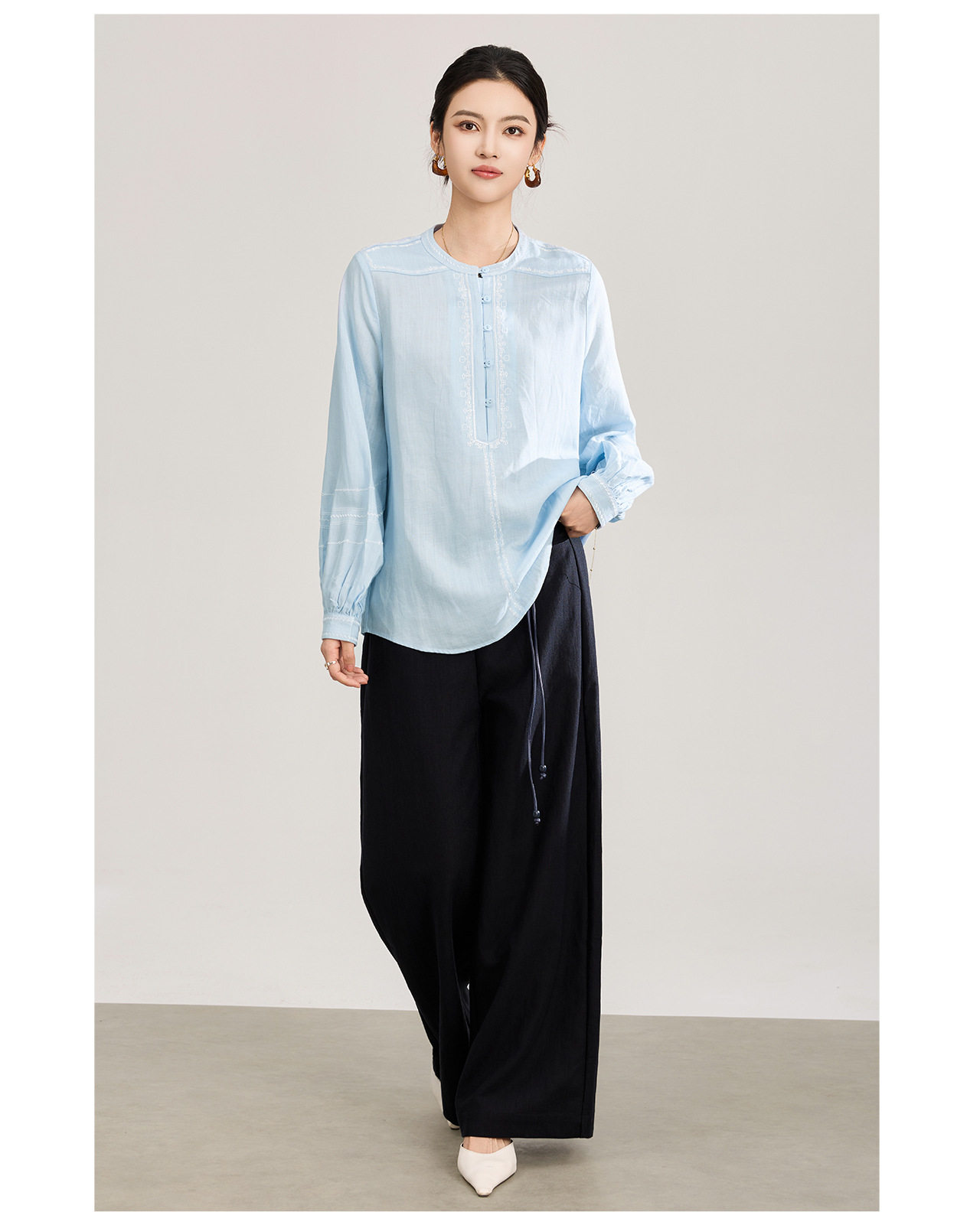 「高货wl」全新升级【铂金会员330/天猫439/差价109】(00957)洛诗琳法式氛围感撞色上衣2026新款天丝亚麻圆领衬衫女