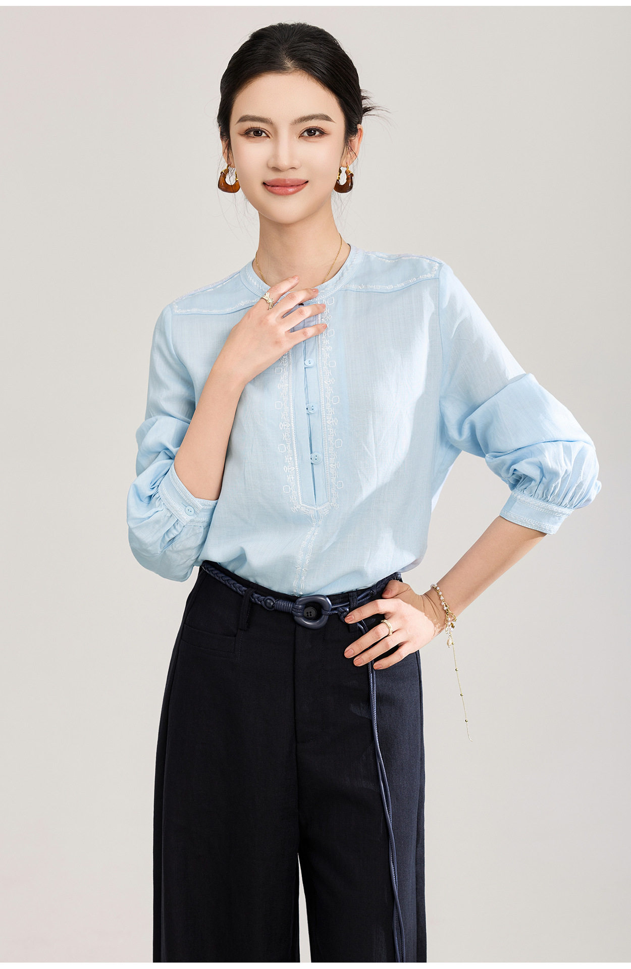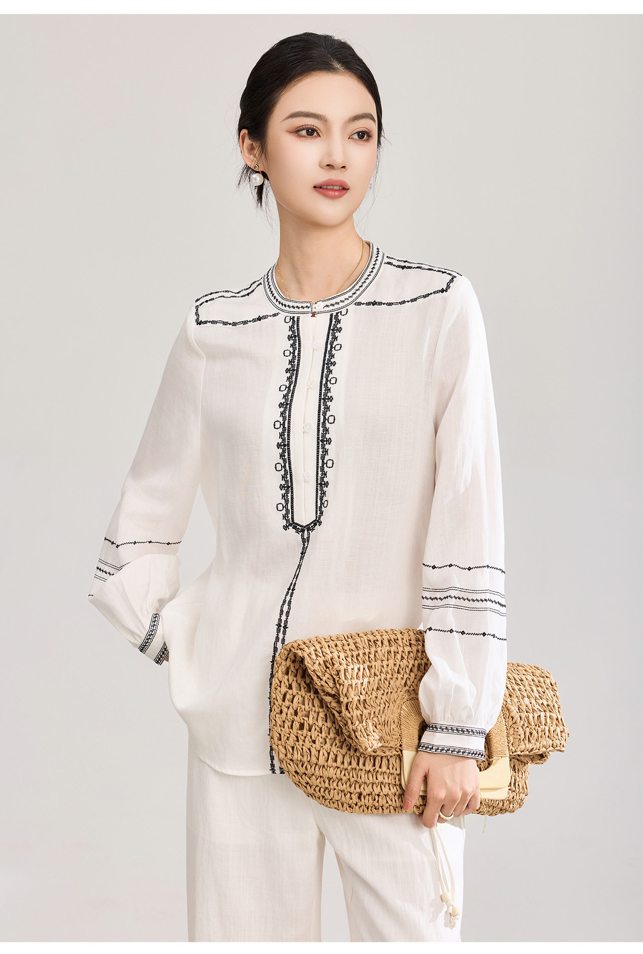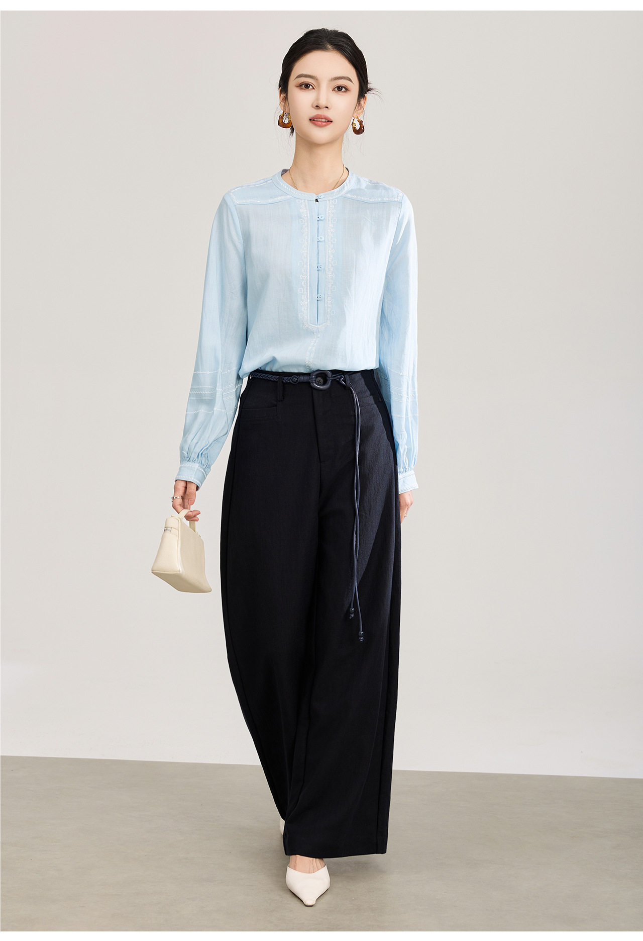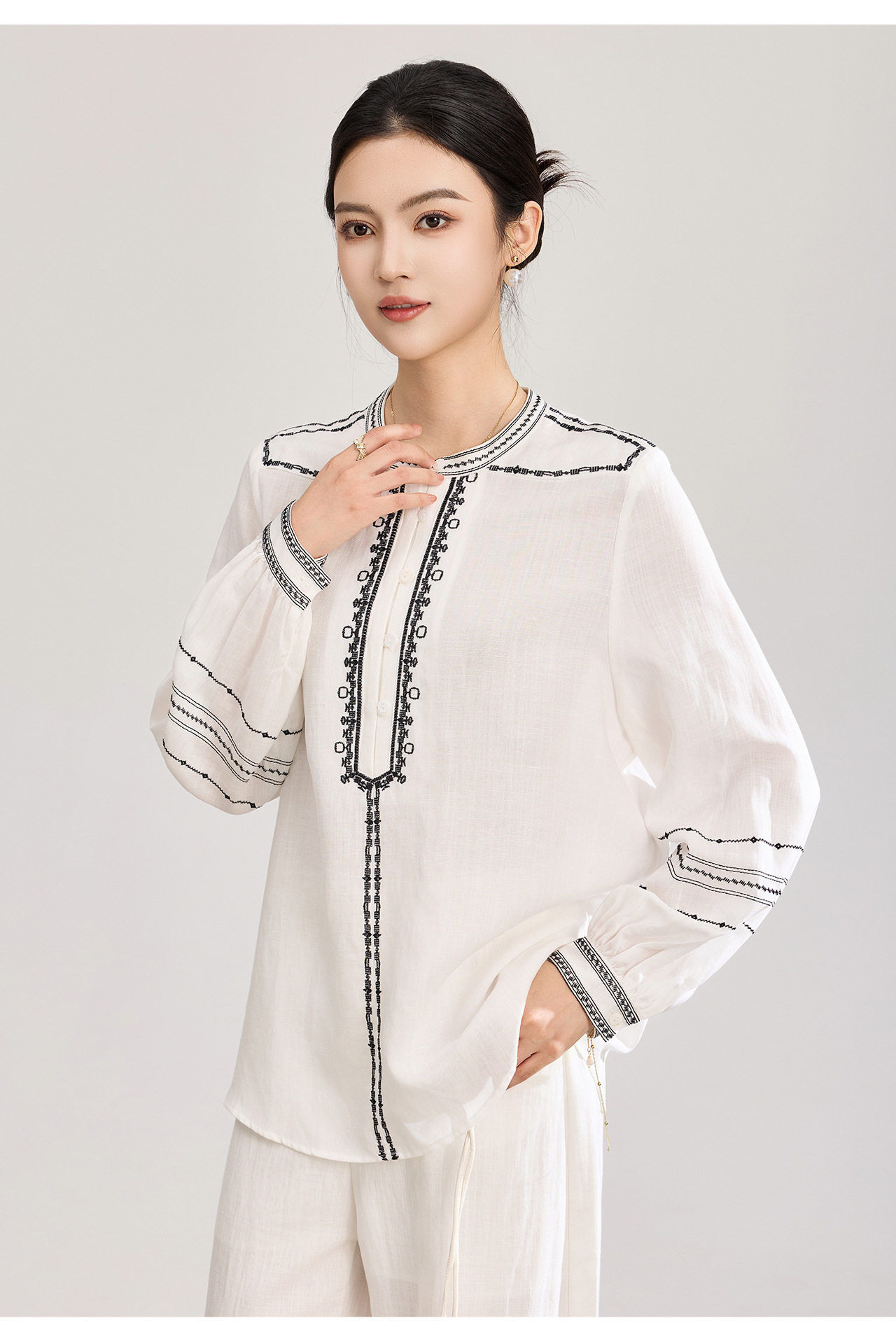 「高货wl」全新升级【铂金会员330/天猫439/差价109】(00957)洛诗琳法式氛围感撞色上衣2026新款天丝亚麻圆领衬衫女