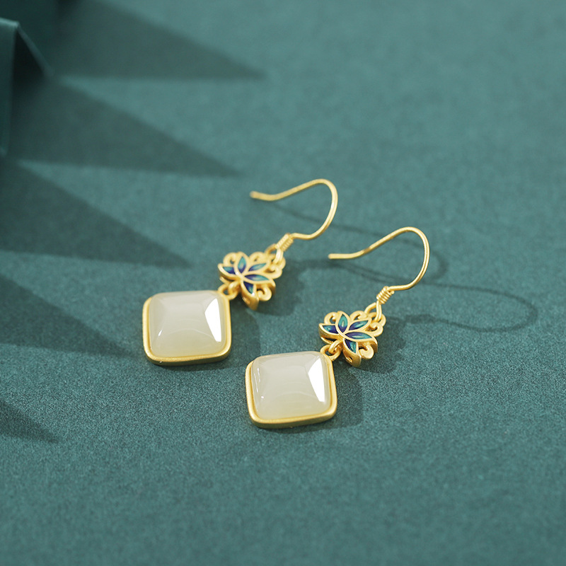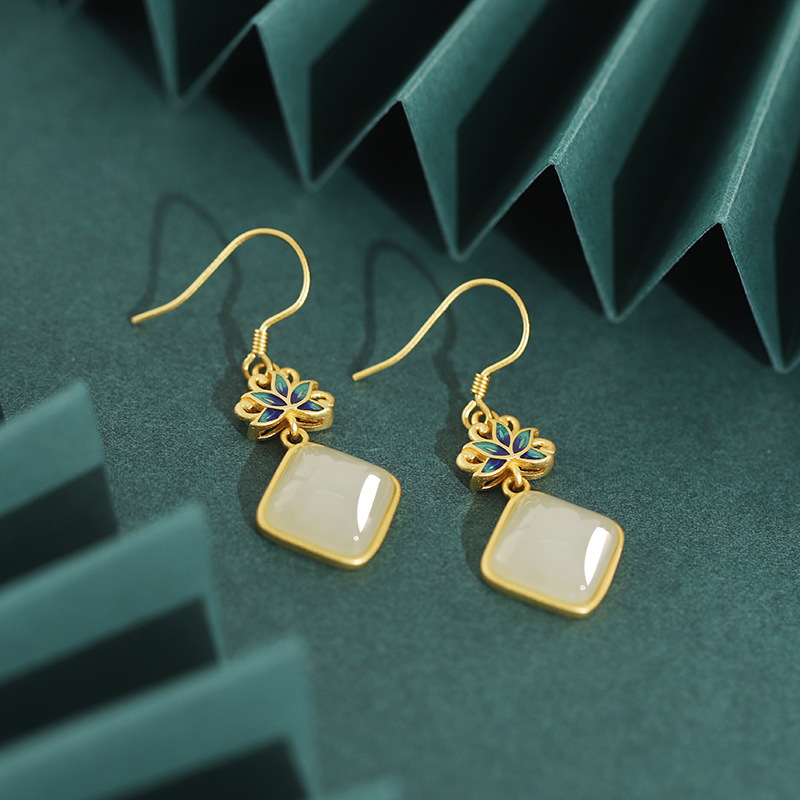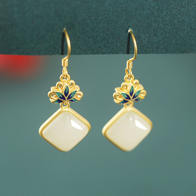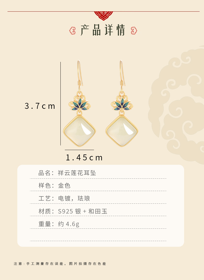 莲花和田玉925银耳环,珐琅渐变色花朵古风耳饰ES595
