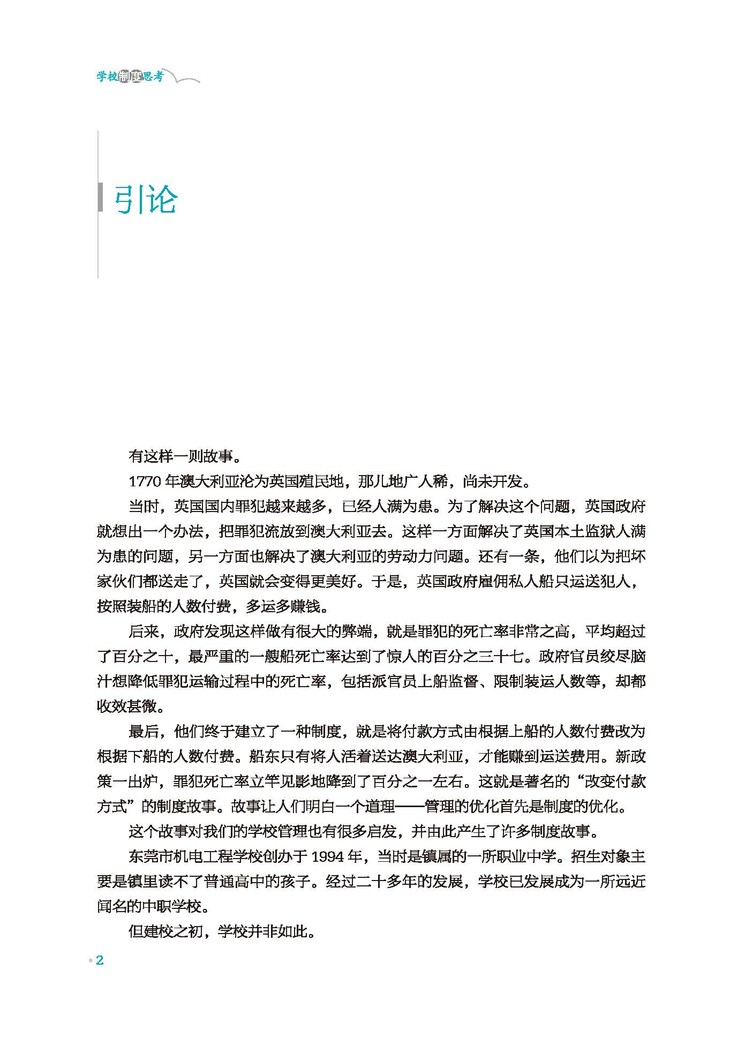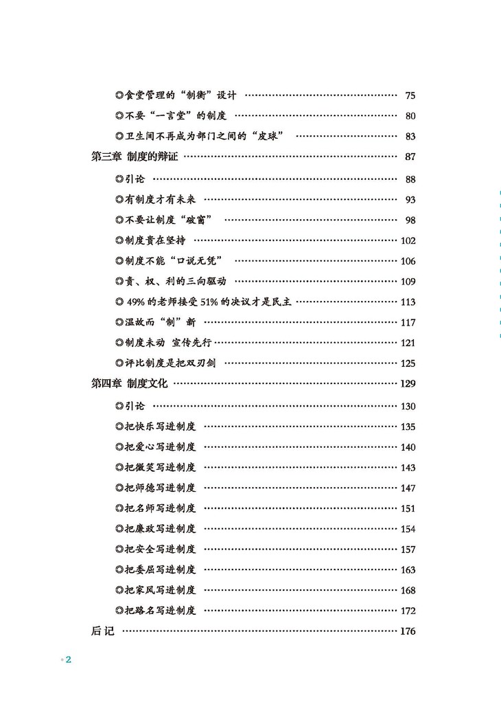 本书作者长期担任一所中职学校校长,不断探索实践“制度管校”“制度治校”“制度兴校”,积累下来了大量的现代学校制度建设经典案例。本书就是一本探索学校制度建设经典案例汇编,共收录了50个案例。结构上由六辑组成,分别是:第一辑:“再差的生源,也能够建立起一个文明的校园”;第二辑:“把权力交给制度”;第三辑:“大家的事大家定”;第四辑:“制度的辩证思维”;第五辑:“制度的建模”;第六辑:“制度背后的故事”。每个案例都再现了该校出台一项制度的背景故事、制度的创新点、制度的科学性、制度对学校管理带来立竿见影的效果与启发。 本书适合学校管理层或从事学校管理工作的研究机构及学者阅读使用。