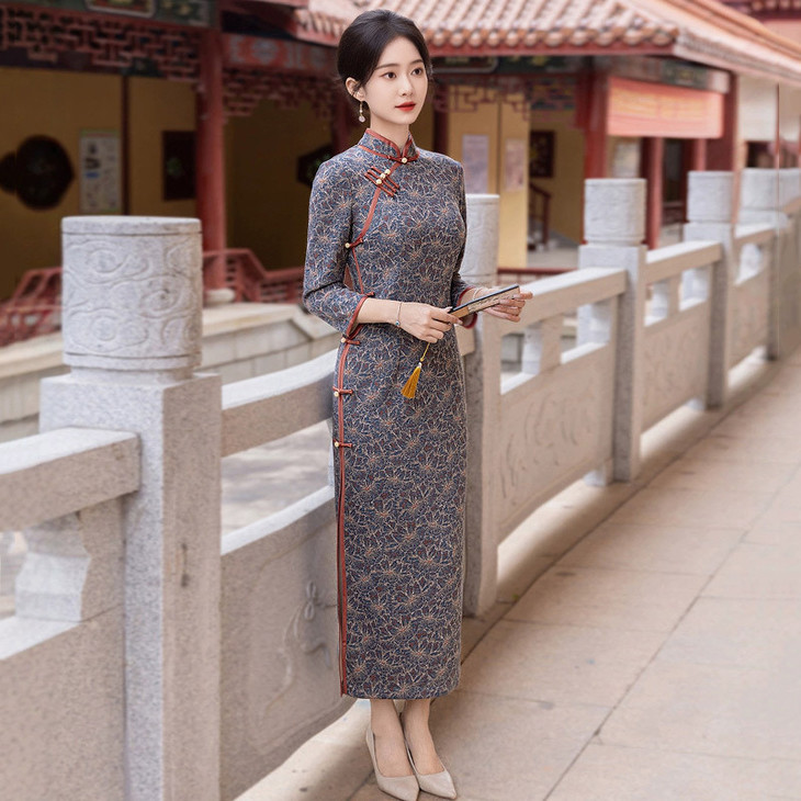 春季国风新中式长款苏州长袖旗袍改良年轻款女高级感复古旗袍60894 商品图0