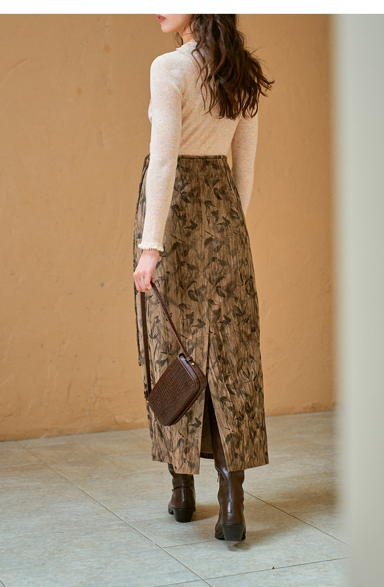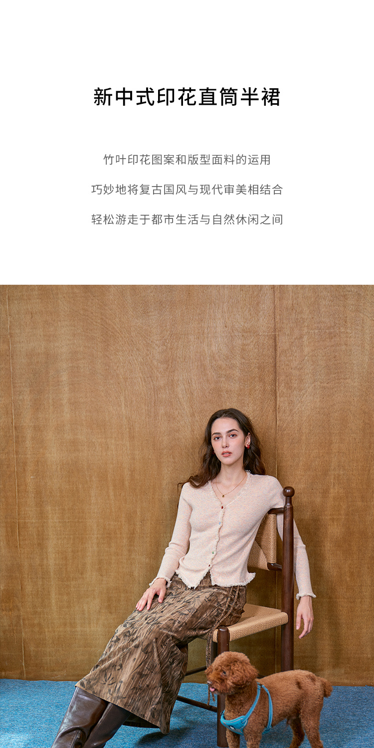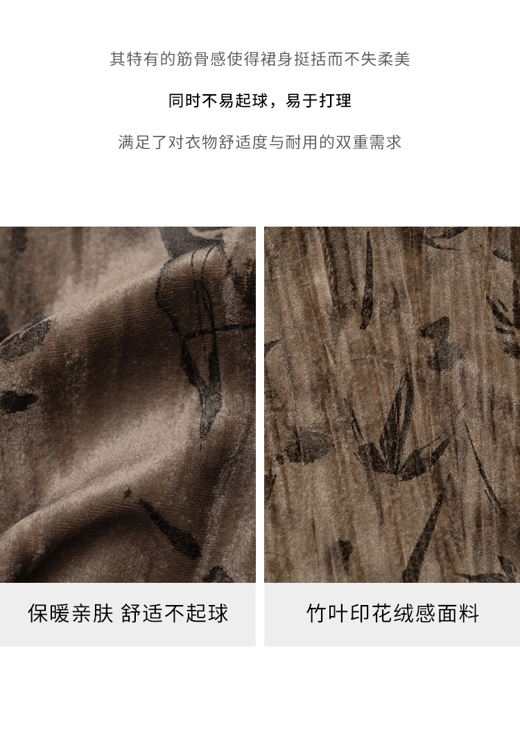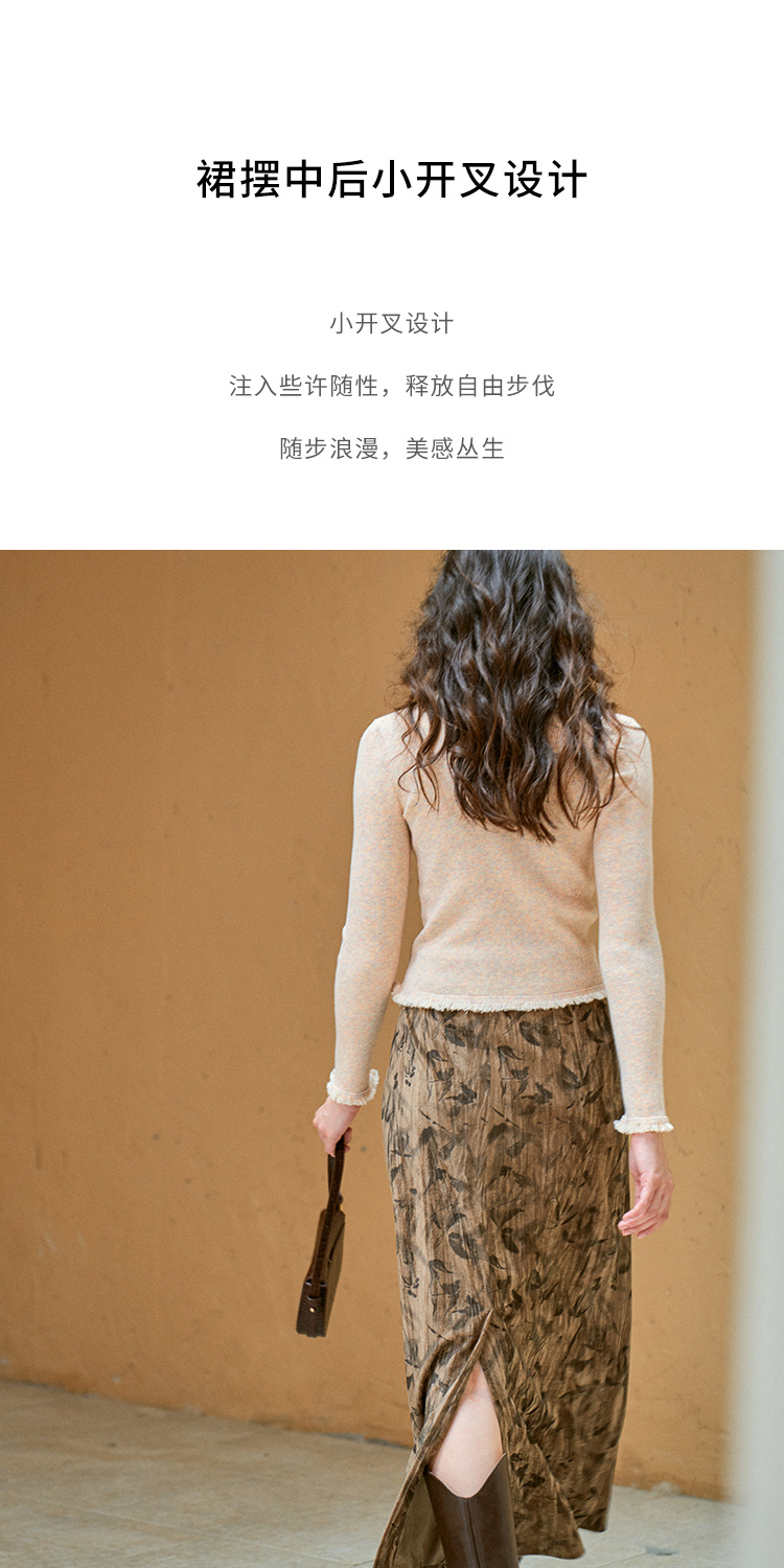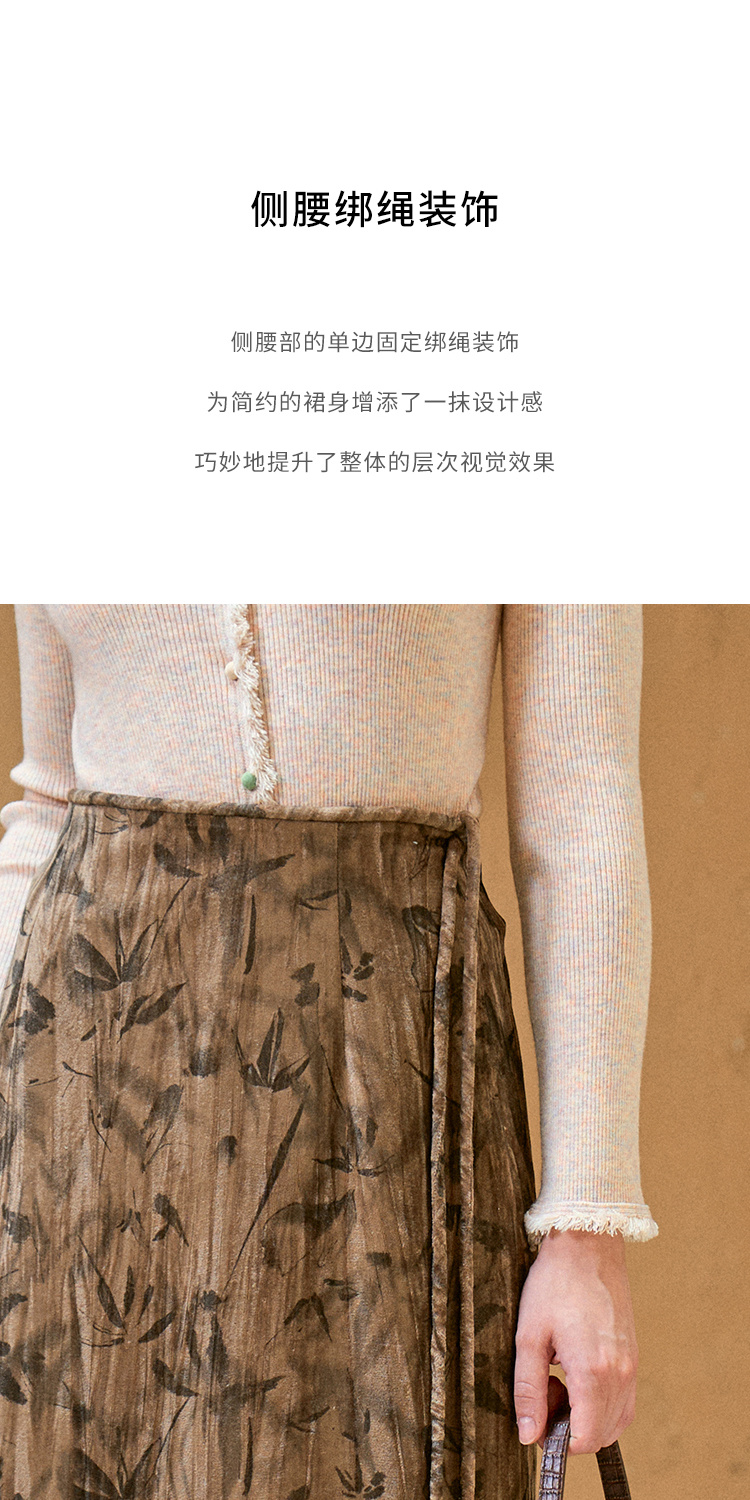 HeyDress新中式竹叶印花半身裙女秋季垂坠气质开叉直筒a字裙子