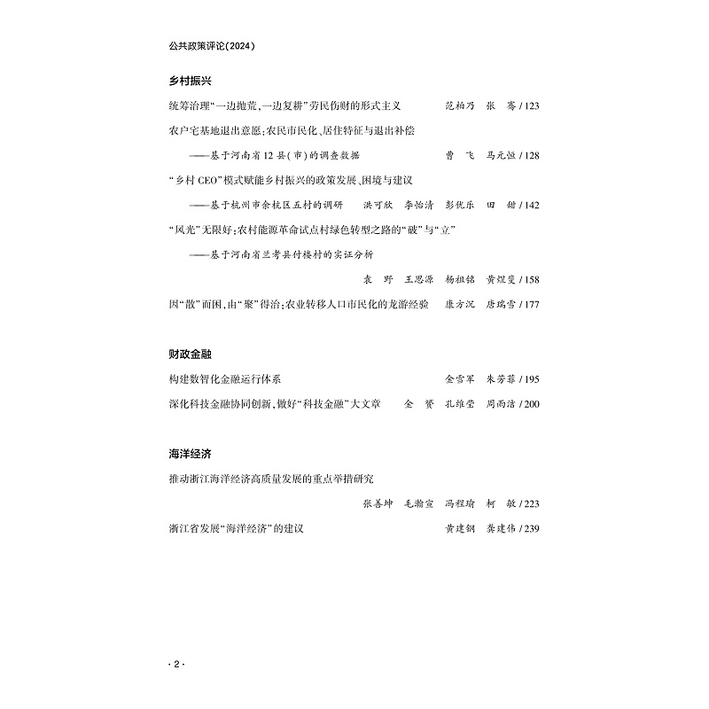 《公共政策评论》是浙江省公共政策研究院、浙江大学公共政策研究院不定期汇编出版的一种探讨公共政策理论与实践的学术文集。《公共政策评论(2024)》以“经世致用,天下为公”为宗旨,以当今国内外公共政策前沿理论与实践问题为研究和讨论主题,追求科学性与学术性、理论与实践的结合,从政府治理和公共政策的视角,分别对数字经济、社会治理、财政金融、深化改革、乡村振兴、文化发展等六大领域进行深入探讨。致力于为有志于国内外公共政策研究的人士构建平等的高层次学术交流平台。