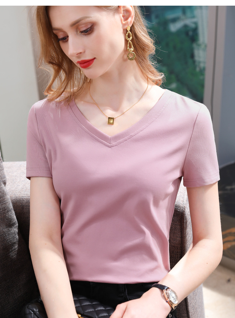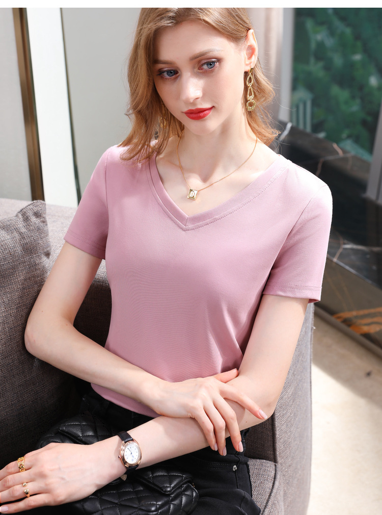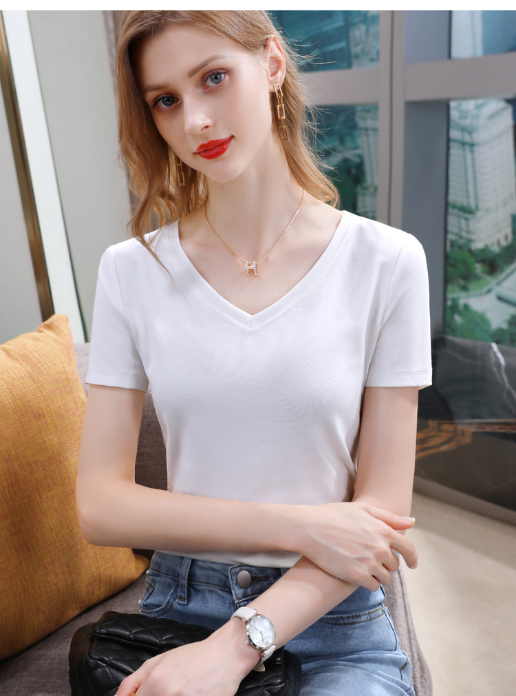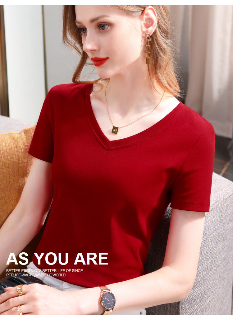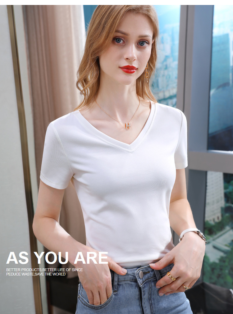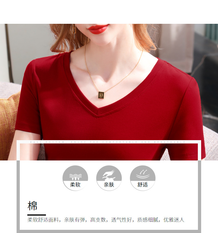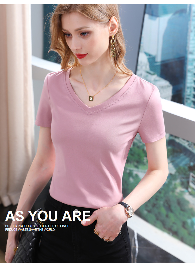 短袖t恤女新款女装简约v领棉体恤纯色大码收腰上衣CN94 29166 WX-171