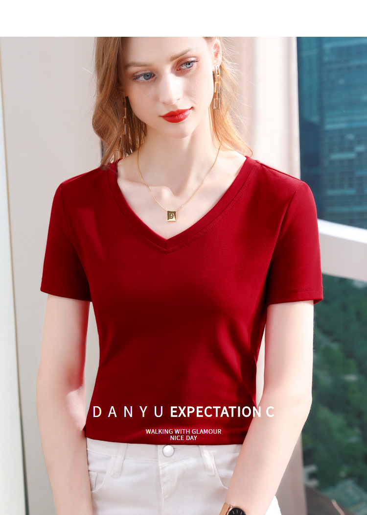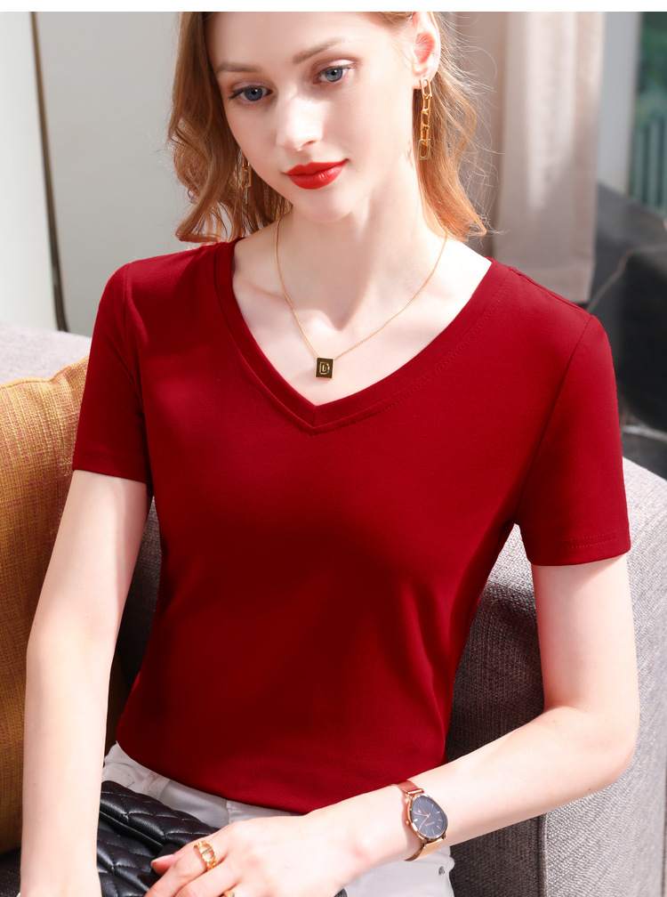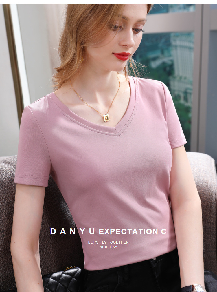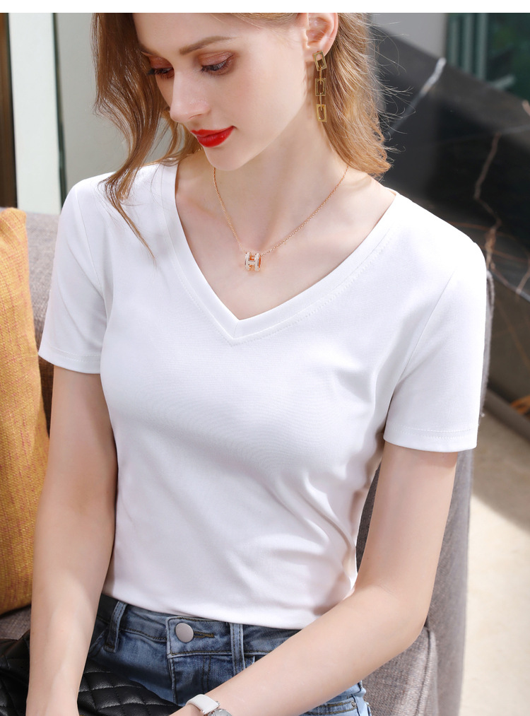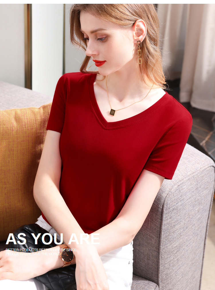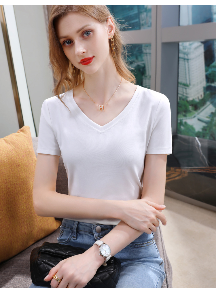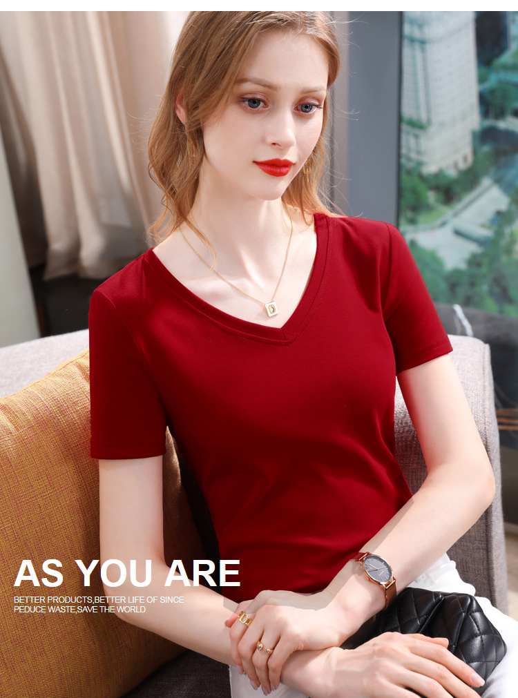 短袖t恤女新款女装简约v领棉体恤纯色大码收腰上衣CN94 29166 WX-171