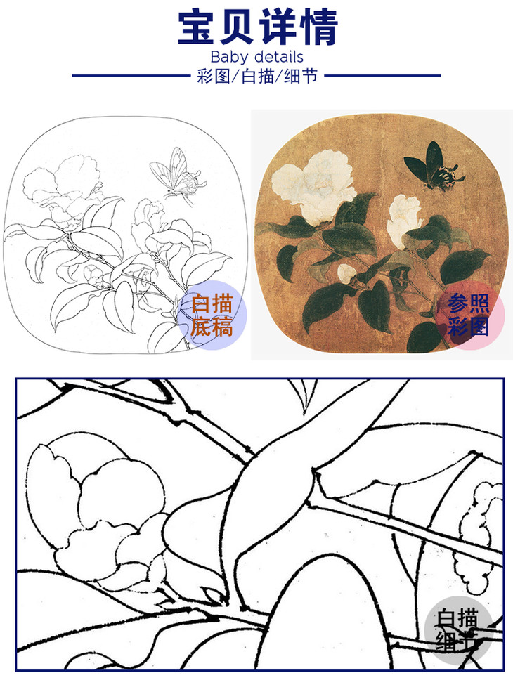 宋画小品工笔花鸟白描底稿-宋 佚名-《山茶蝴蝶图》-多种白描尺寸可选-X024