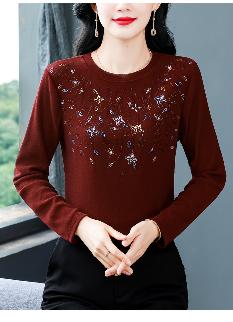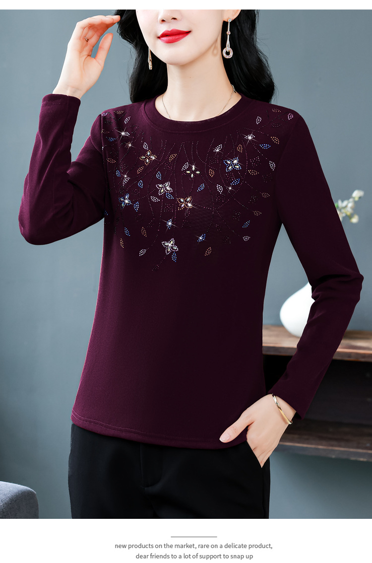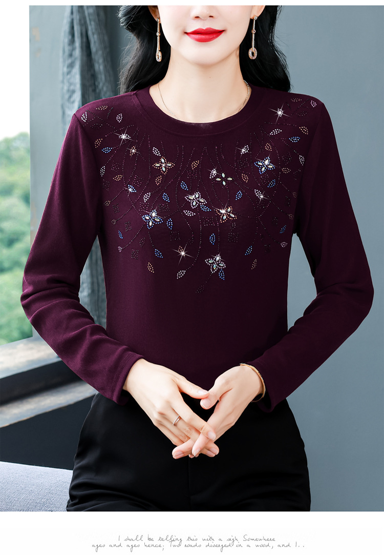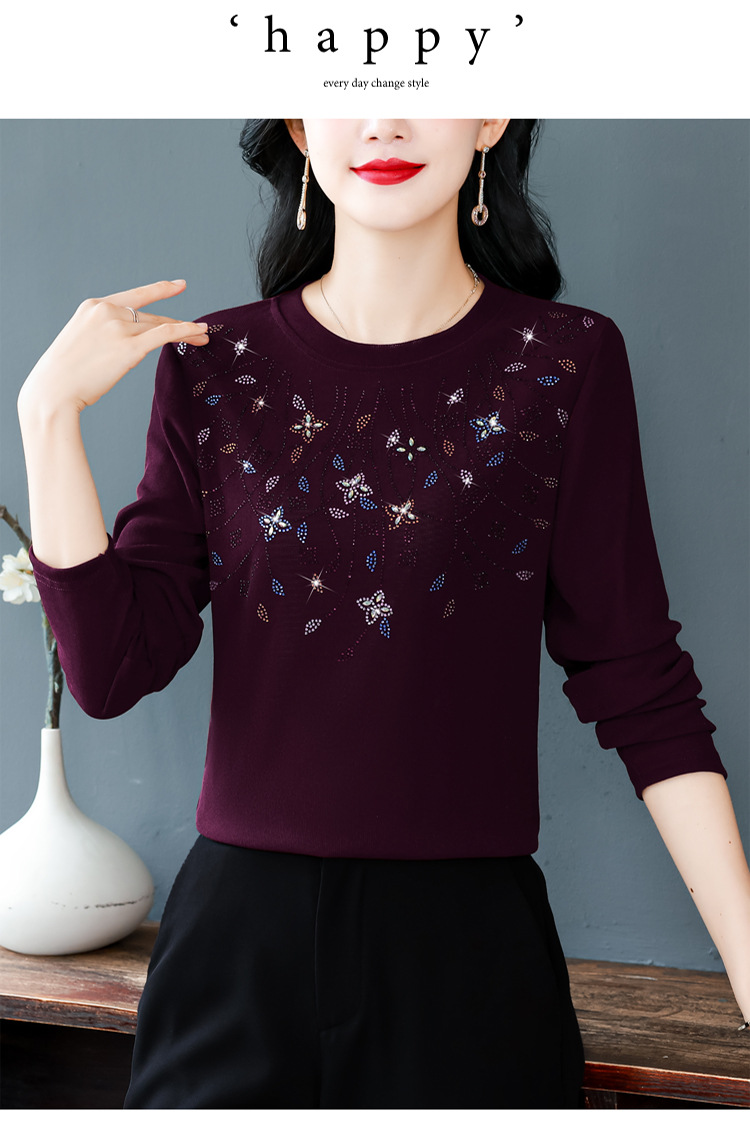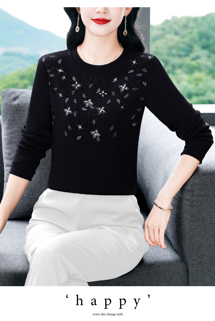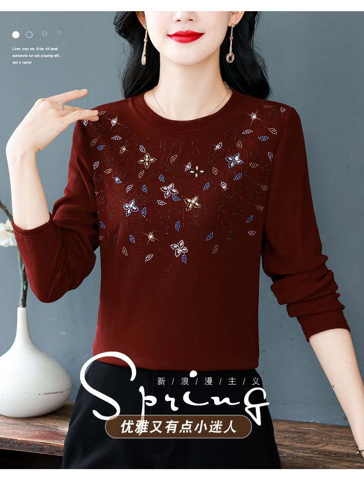 雀说新款圆领打底衫女长袖T恤气质修身显瘦烫钻大码针织上衣AL393