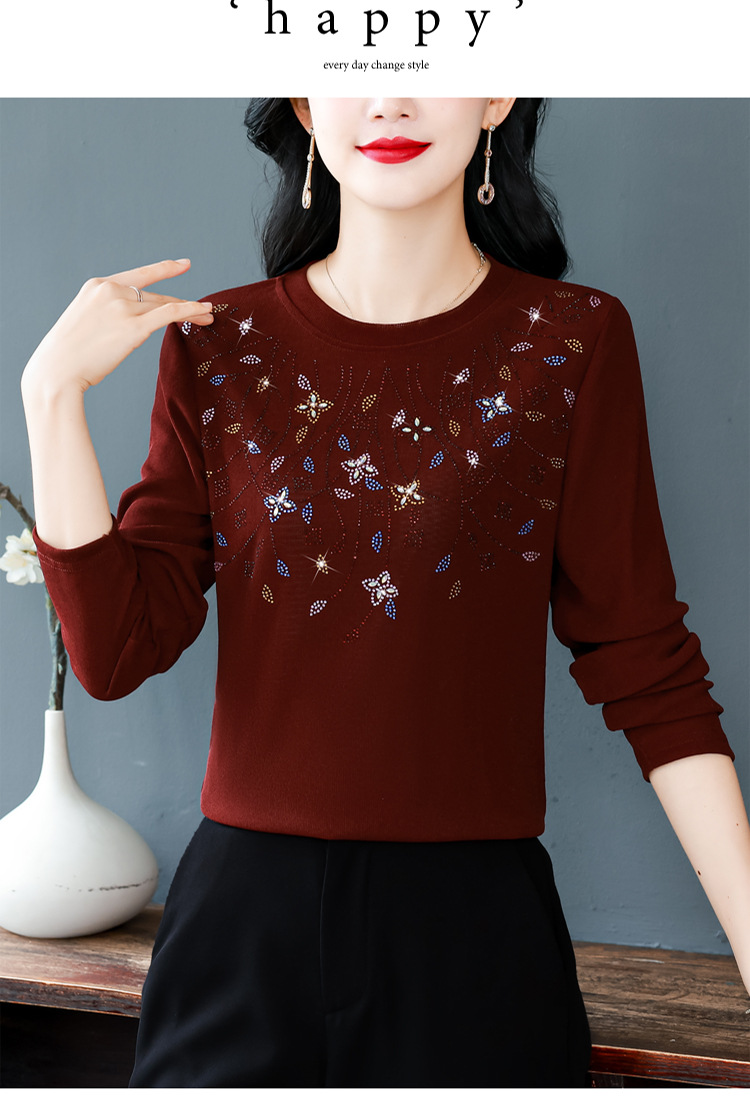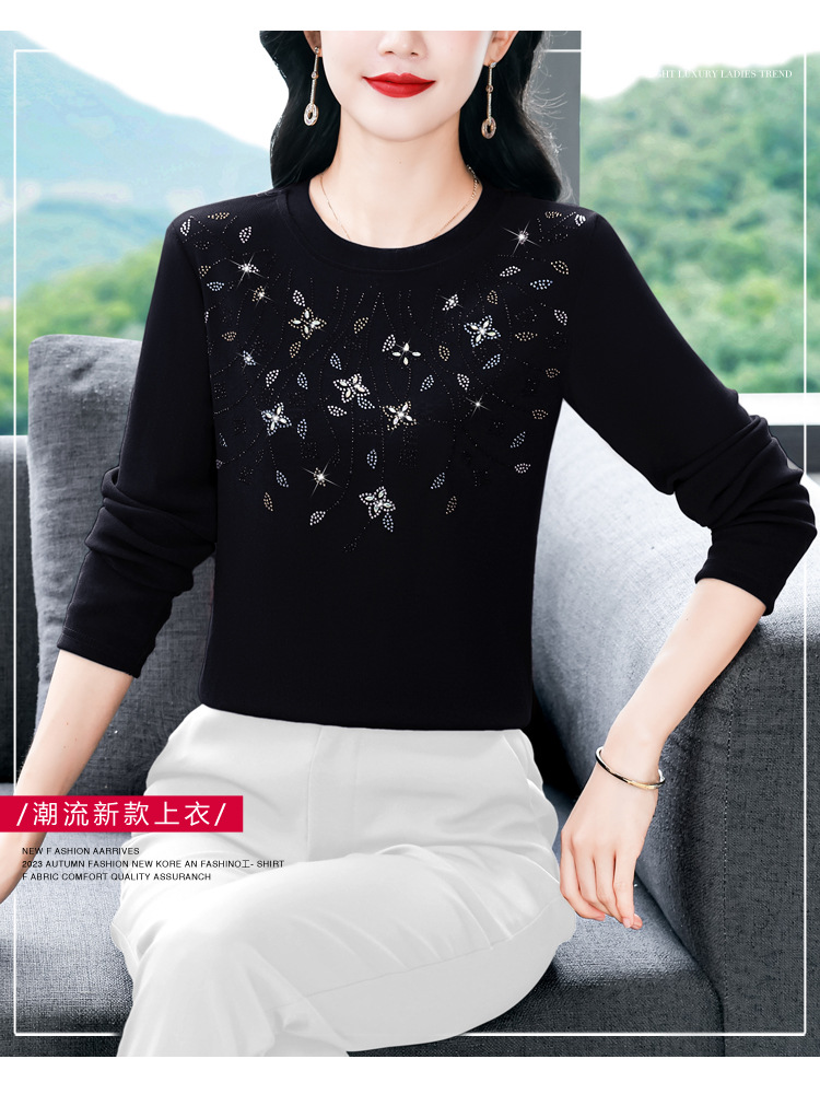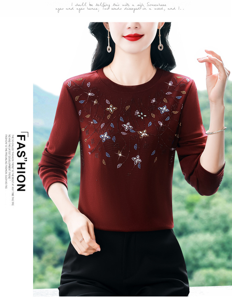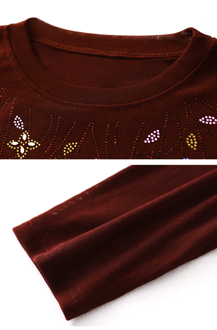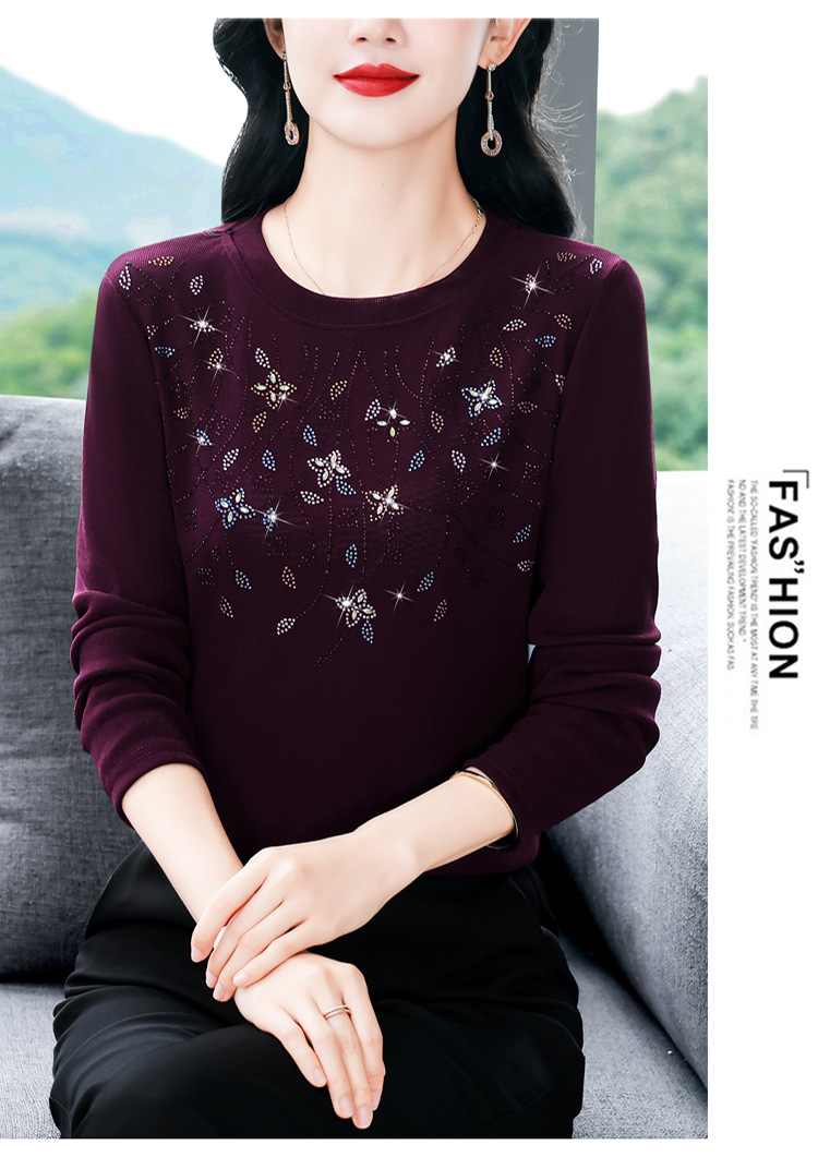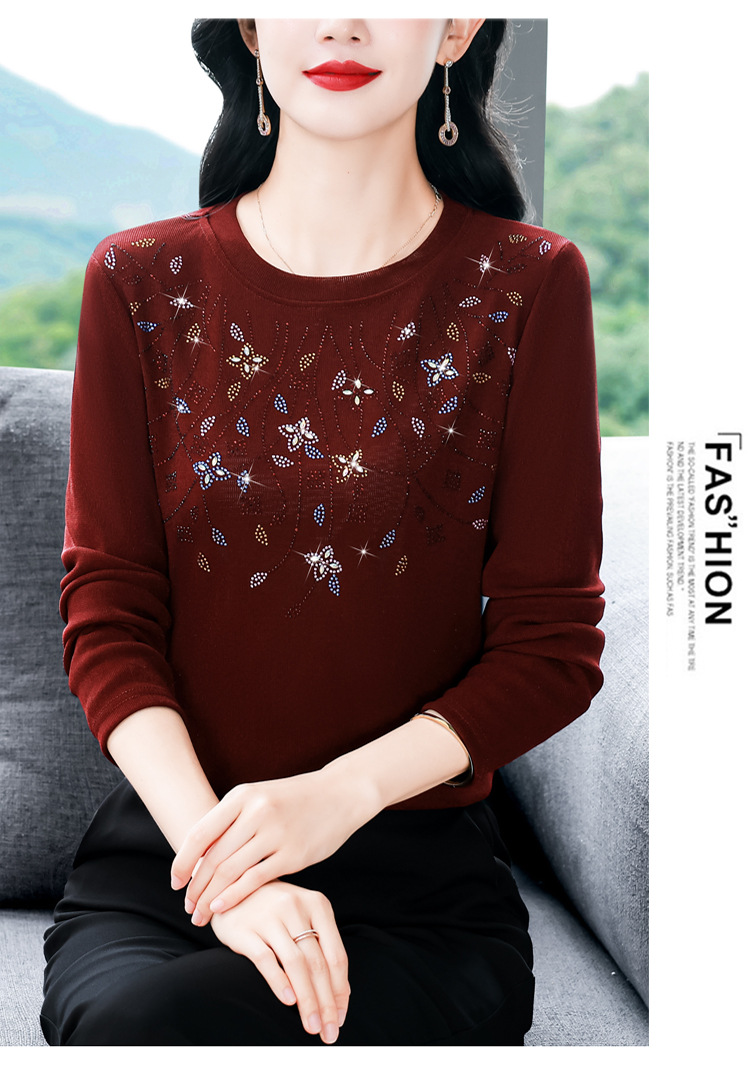 雀说新款圆领打底衫女长袖T恤气质修身显瘦烫钻大码针织上衣AL393