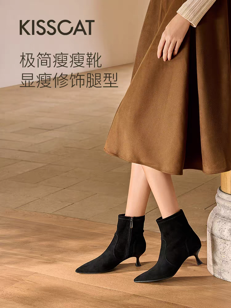 「KISSCAT接吻猫[巴黎侧影]25冬尖头细跟真皮短靴加绒时装靴瘦瘦靴」