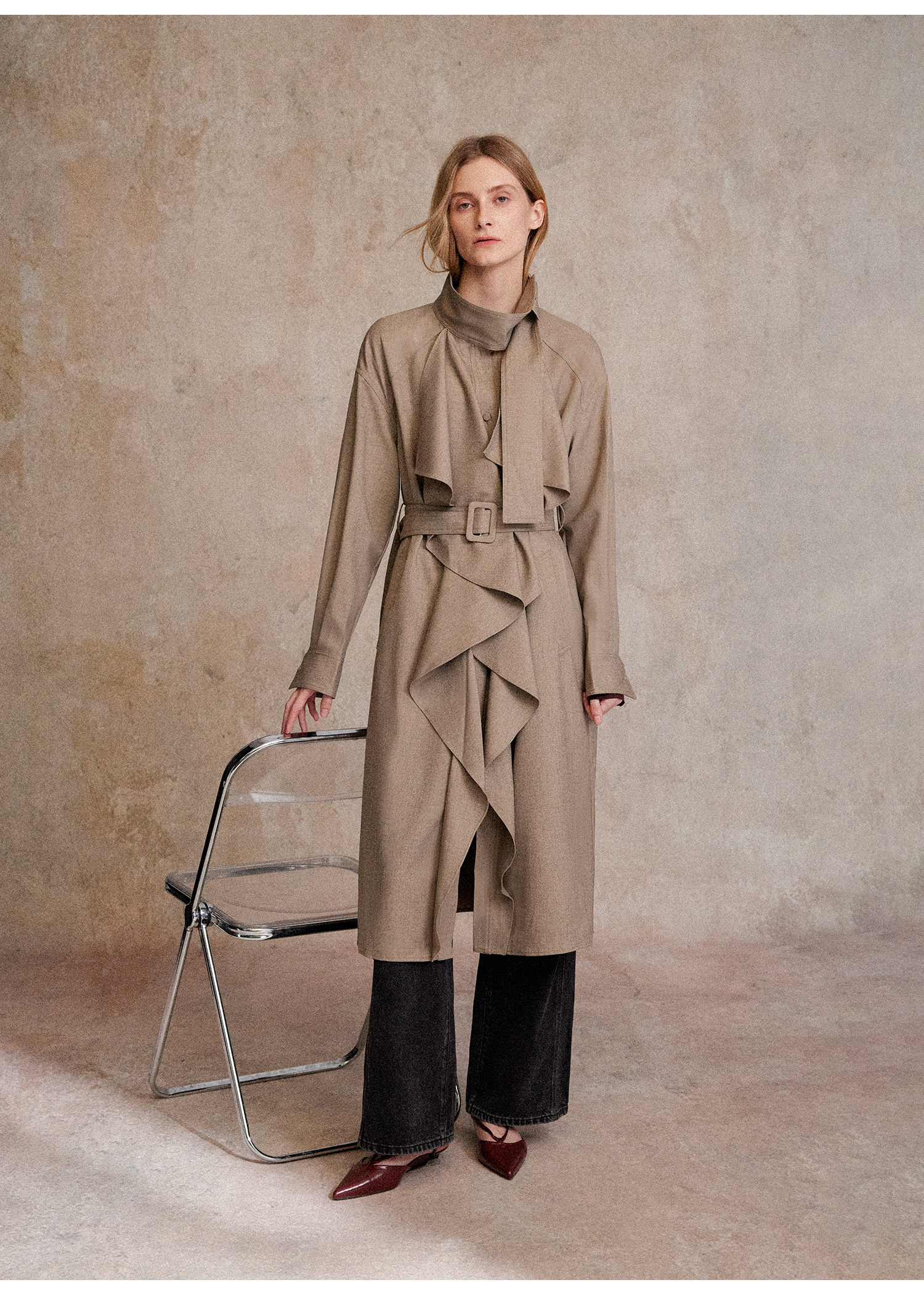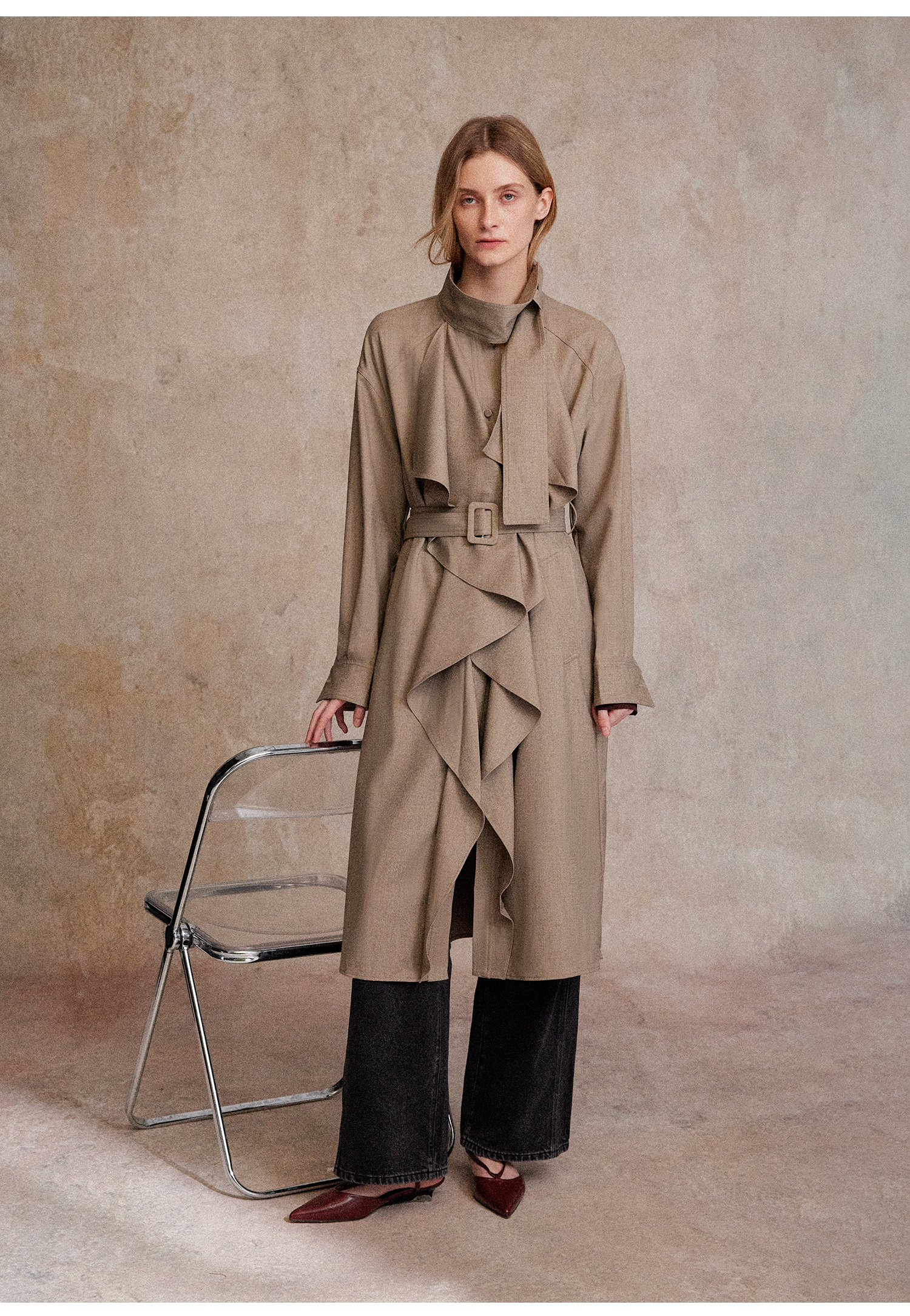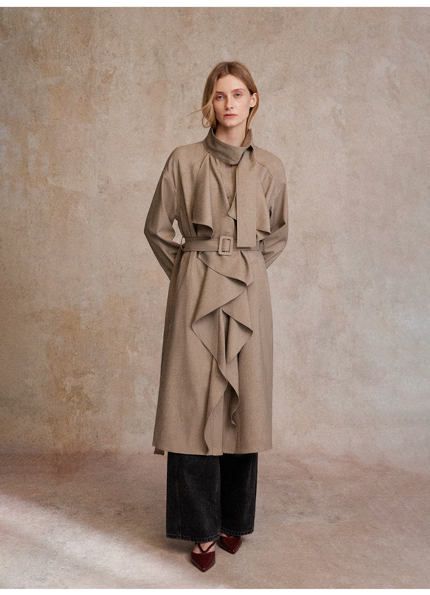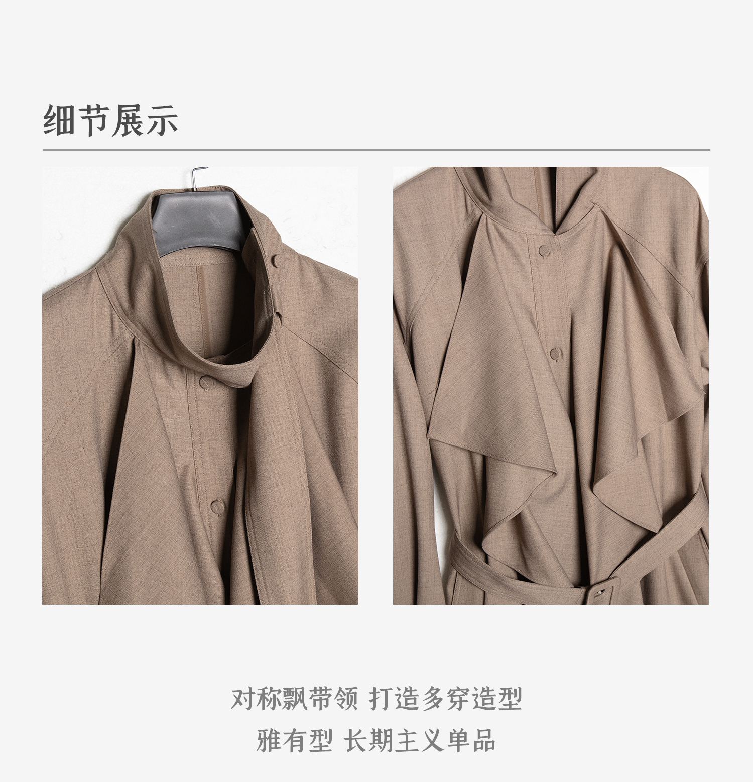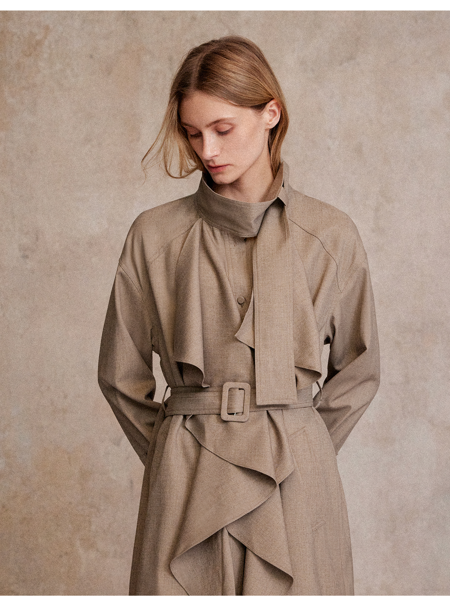 混色羊毛立领随性松弛感2穿飘带荷叶边荡领风衣FY2503058