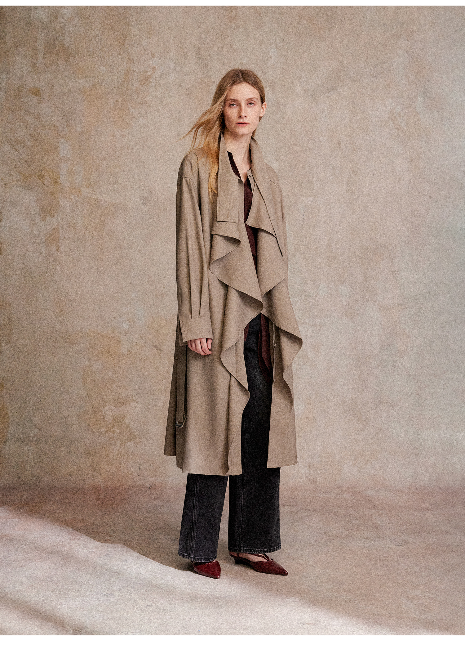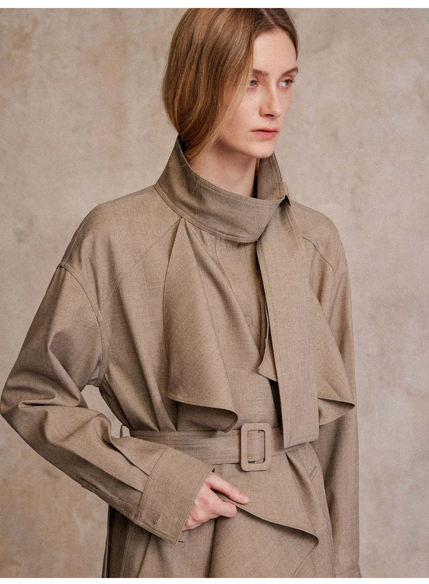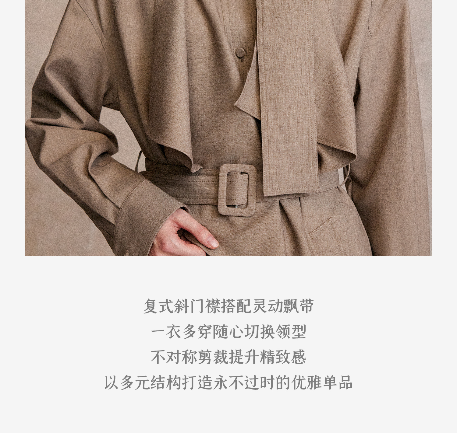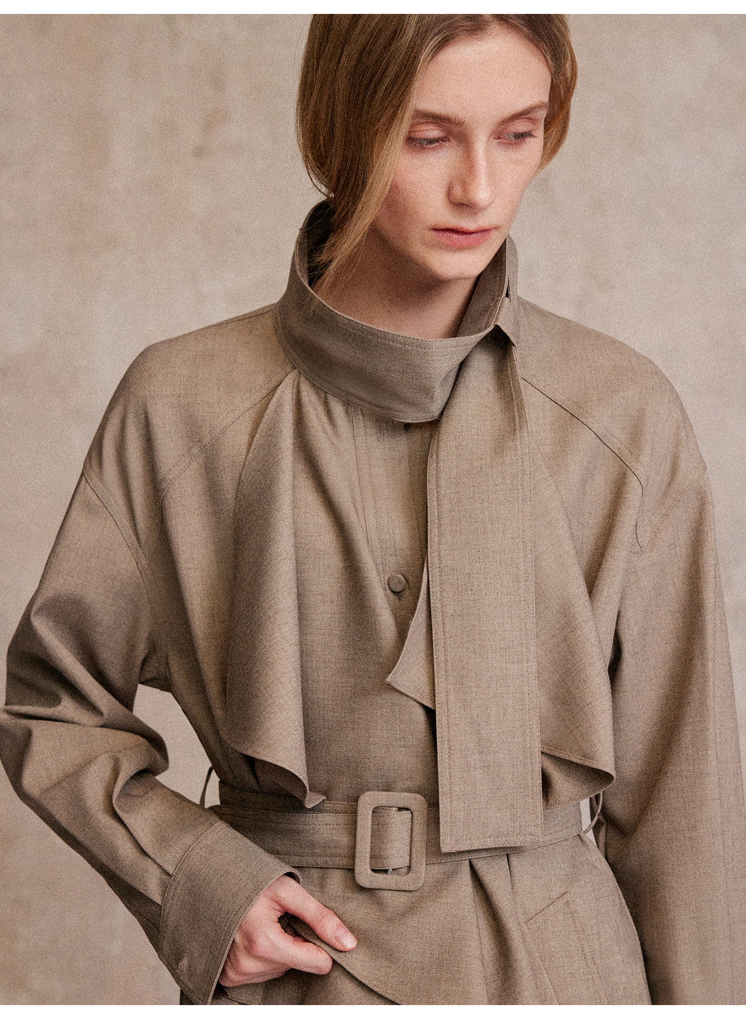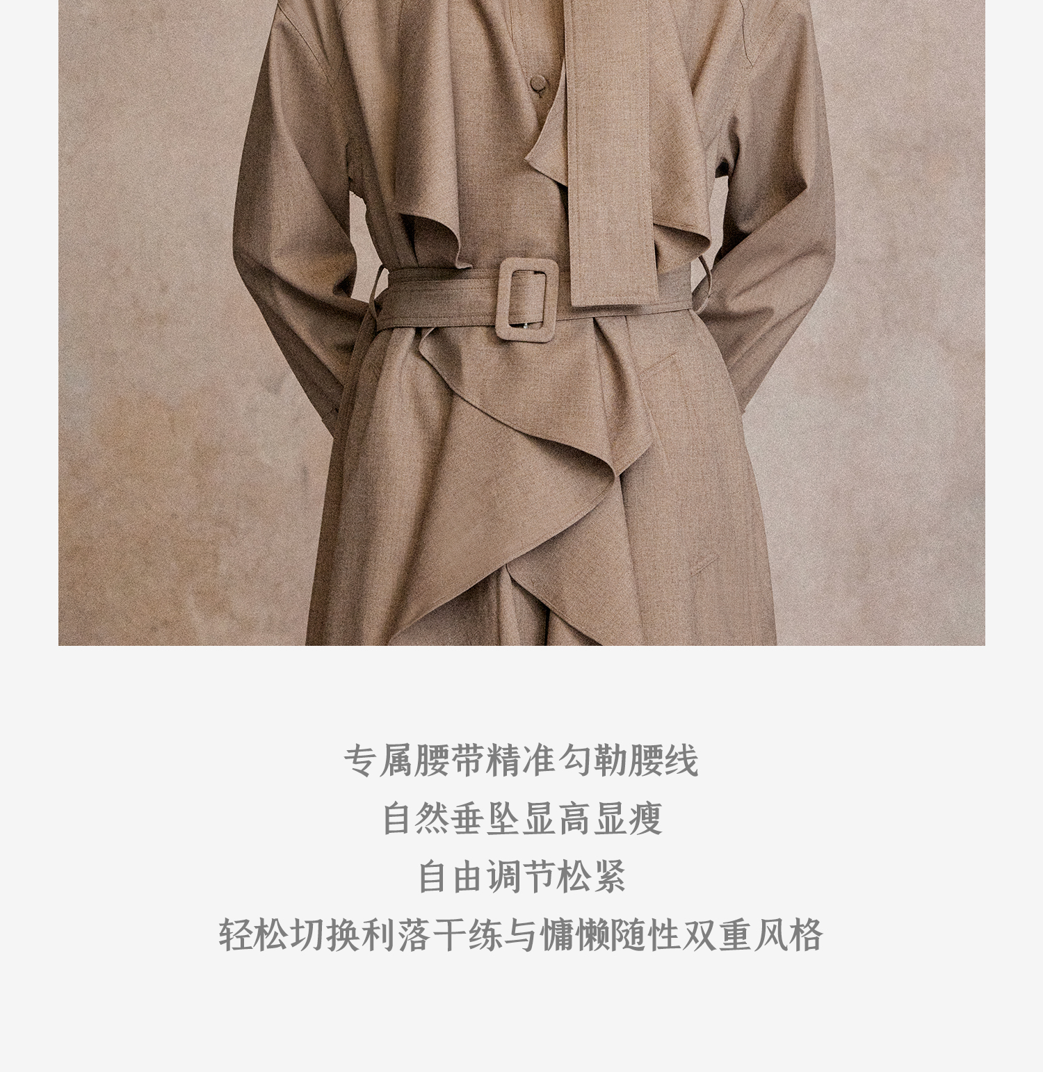 混色羊毛立领随性松弛感2穿飘带荷叶边荡领风衣FY2503058