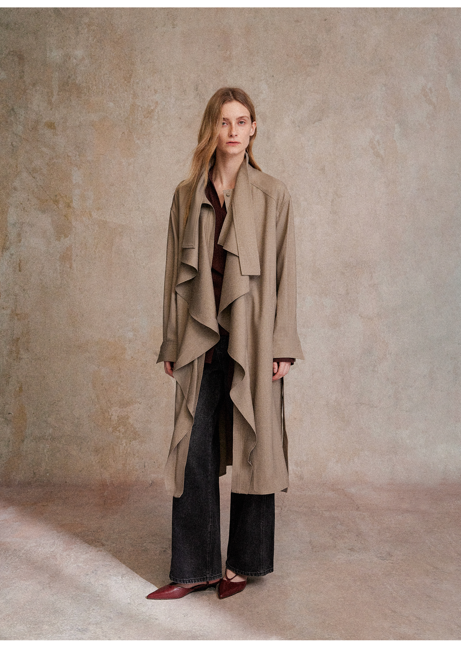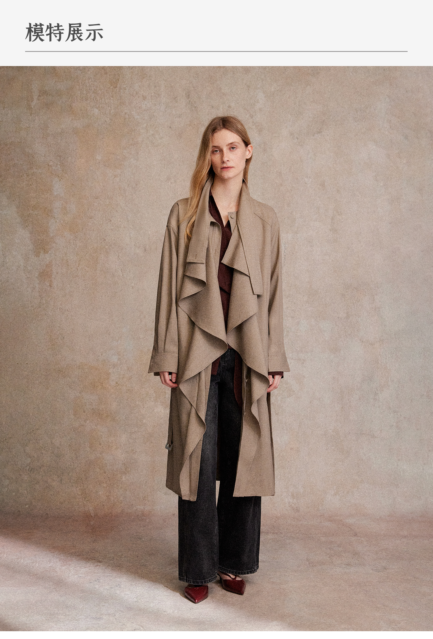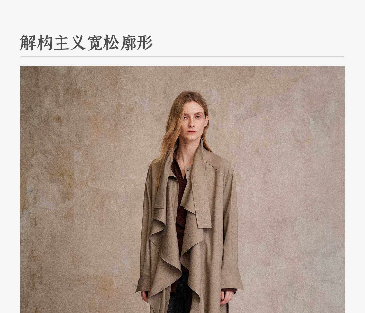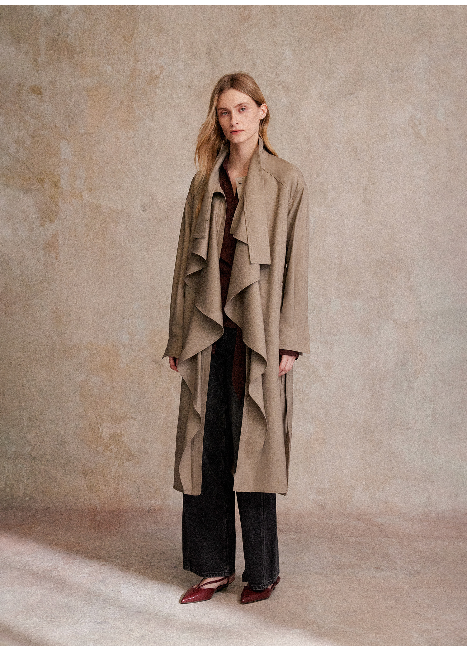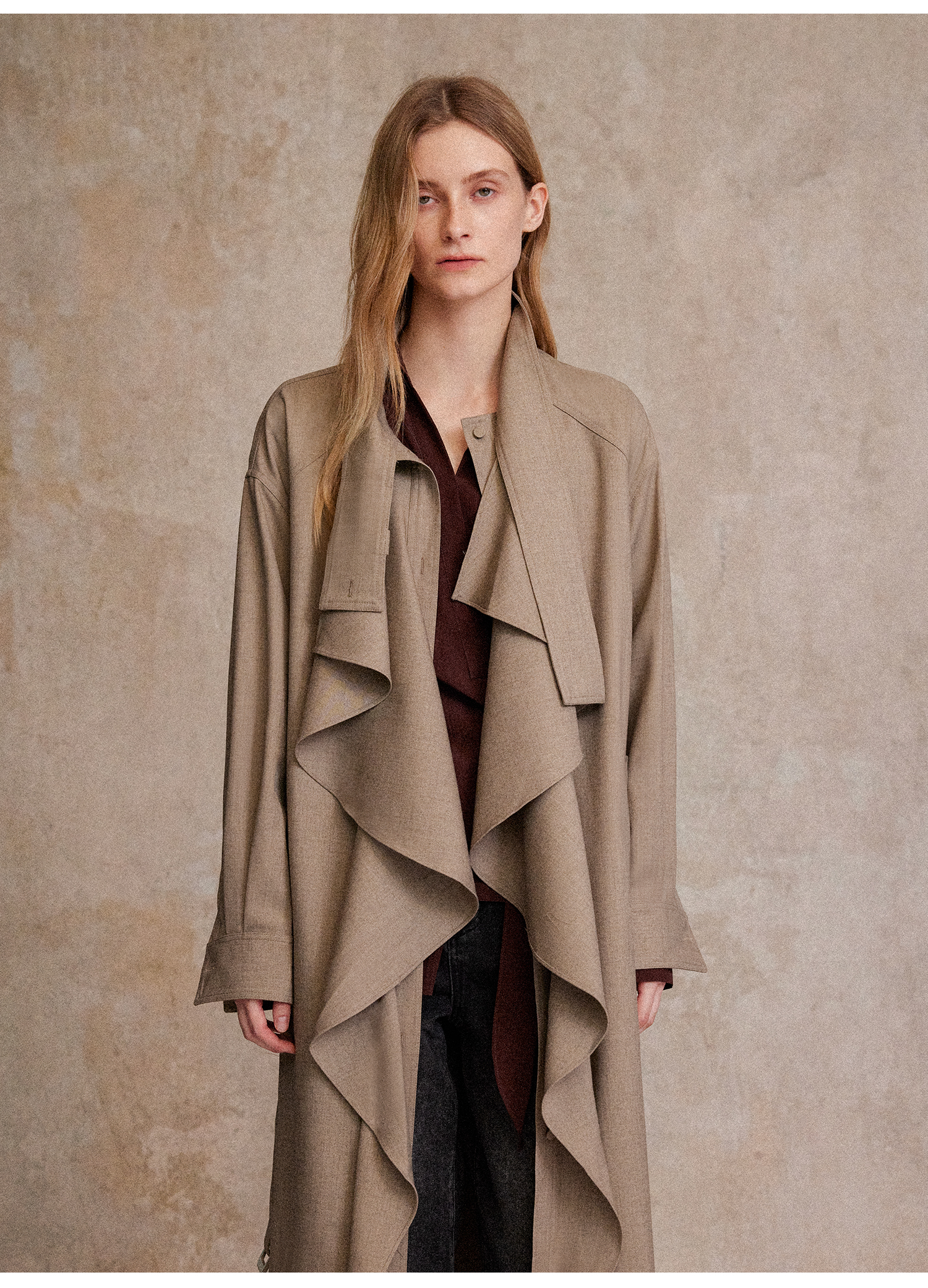 混色羊毛立领随性松弛感2穿飘带荷叶边荡领风衣FY2503058