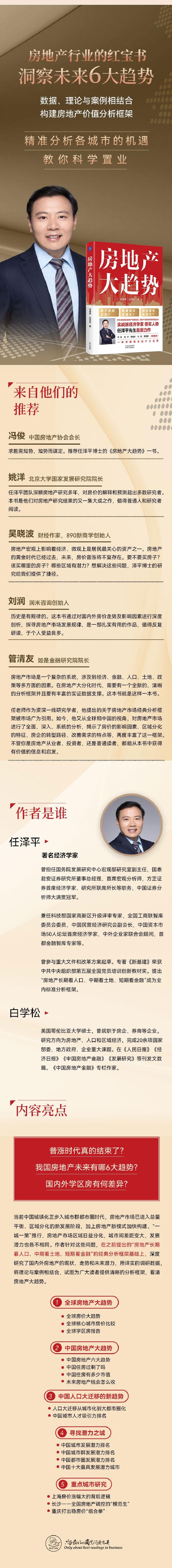 当前中国城镇化正步入城市群都市圈时代,房地产市场已进入总量平衡、区域分化的新发展阶段,加上房地产新模式加快构建、“一城一策”推行,房地产市场区域日益分化,城市间差距变大,发展潜力也各不相同。作者针对这些问题,在之前提出的“房地产长期看人口、中期看土地、短期看金融”的典分析框架基础上,深度研究了国内外房地产的现状、走势和未来潜力,用详实的调研数据,将理论与案例相结合,试图为广大读者提供清晰的分析框架,看清房地产大趋势。