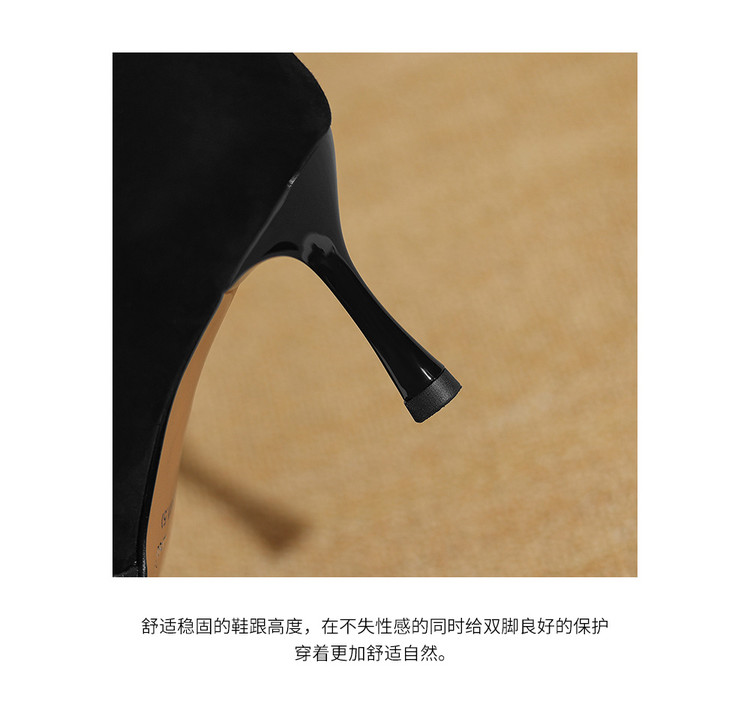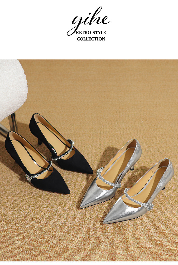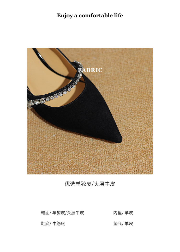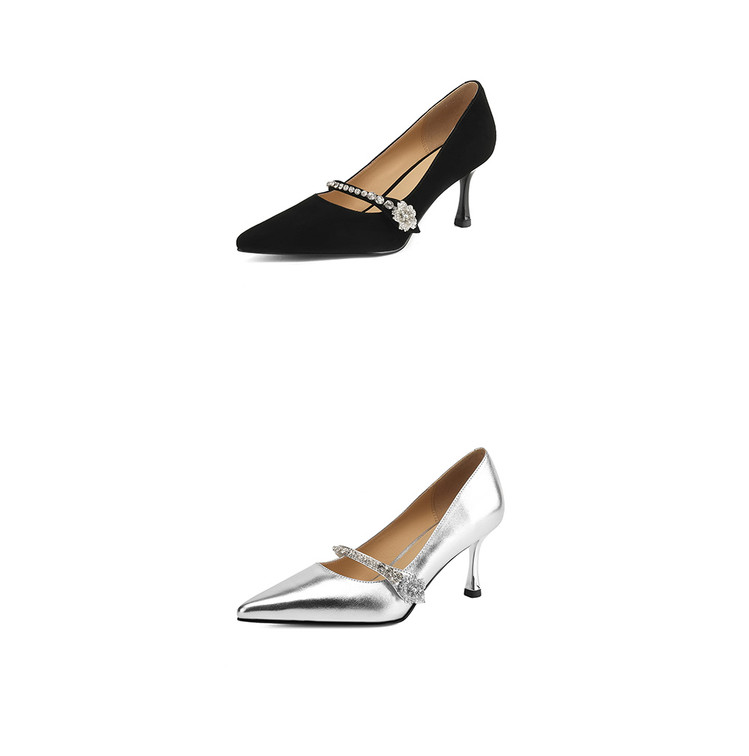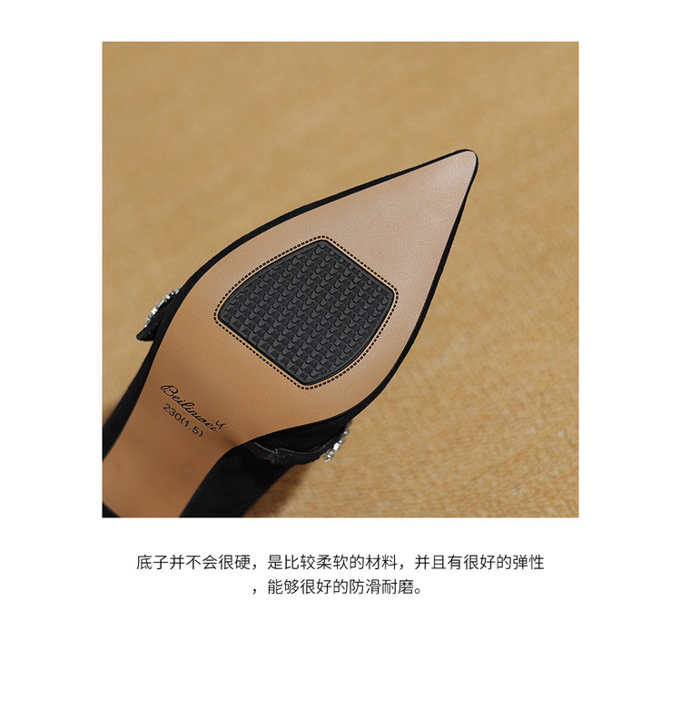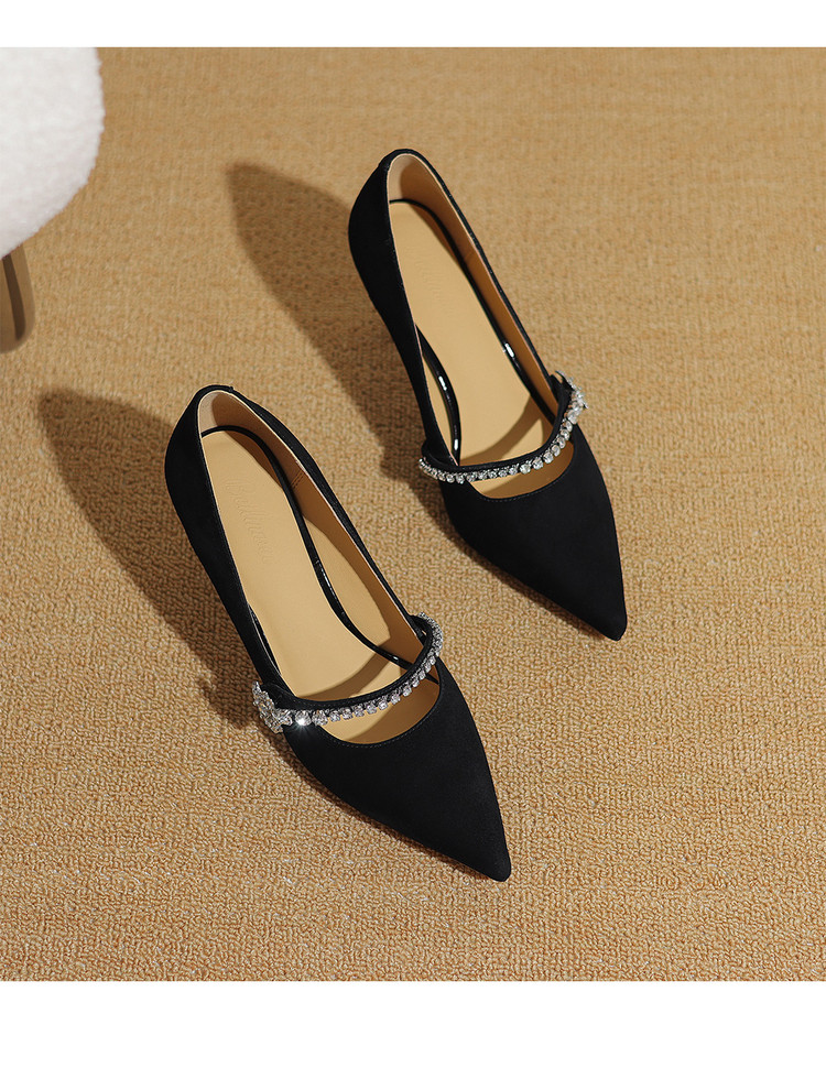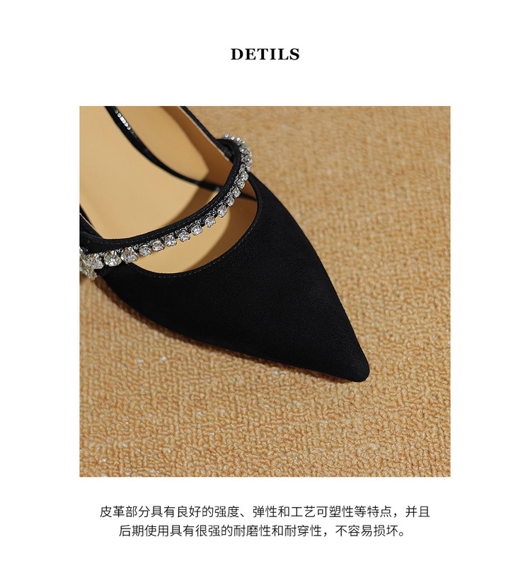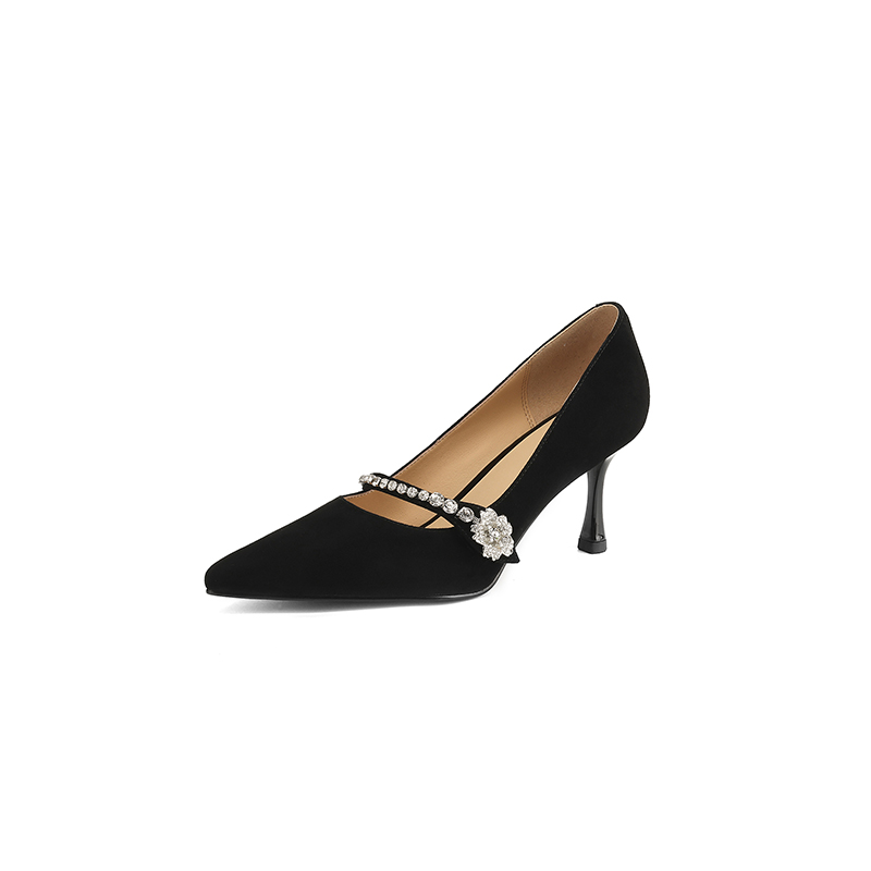 【预售5天】法式气质尖头浅口单鞋女新款真皮细跟时尚水钻黑色通勤高跟鞋ZF&25020