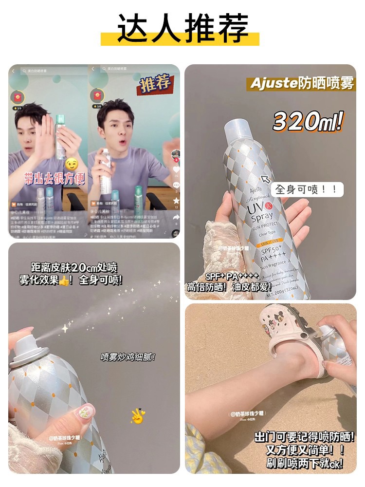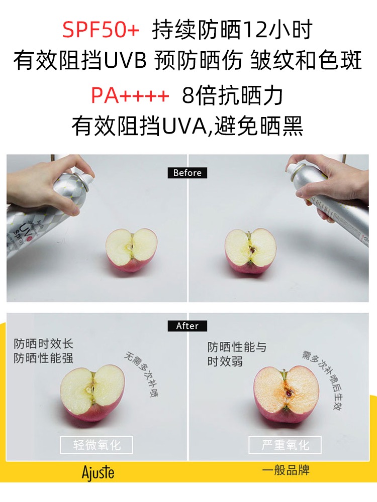 👑日本AJUSTE全身防晒喷雾320ML 👍零感防晒,3秒速成膜,透明无色不假白,干爽不油腻💦 📢喷头细腻均匀,360度死角防护💥 🍃外防晒,内养肤,7中天然植物提取精华防晒+滋养🧼 🔆防晒指数SPF50+PA++++,为日本至高标准,且时效长达12小时🔆
