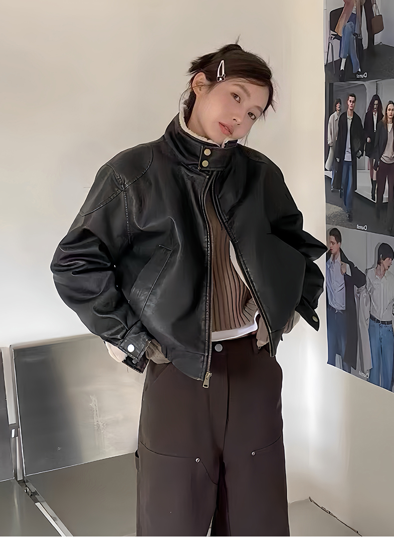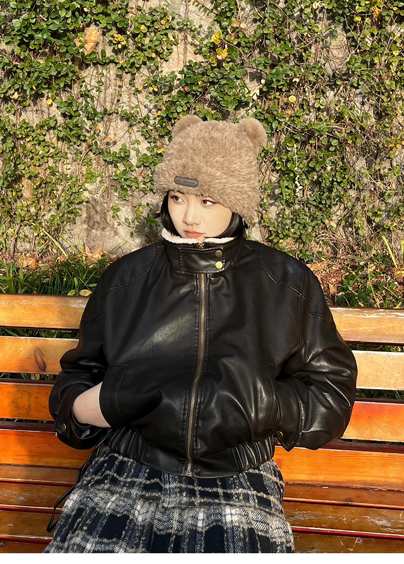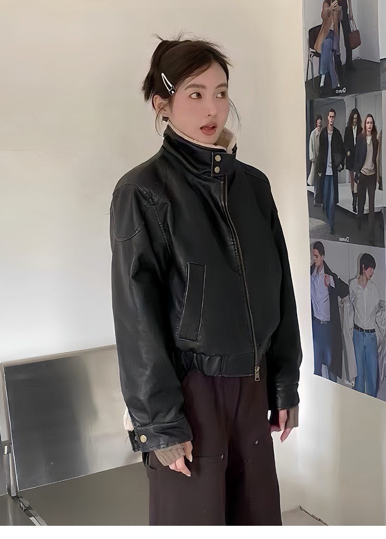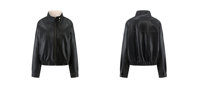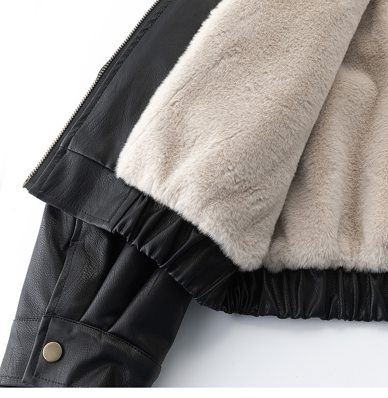 天猫同步【高奢/仿貂毛】拉夏贝尔/La Chapelle立领内里加绒PU夹克女保暖机车风时髦皮衣外套