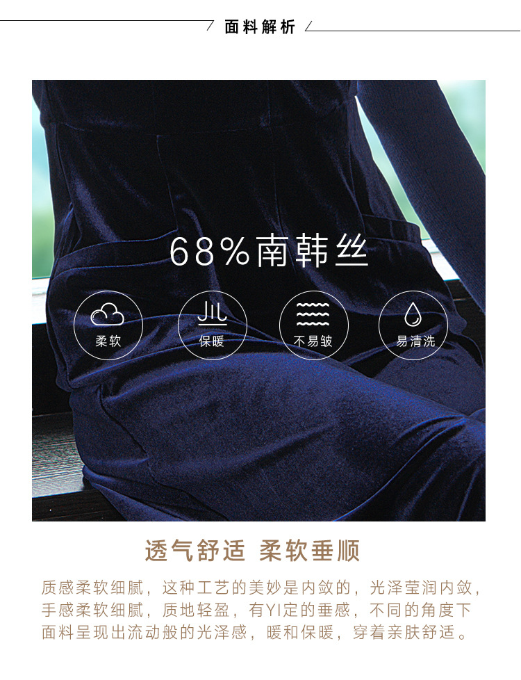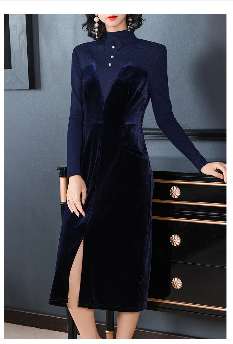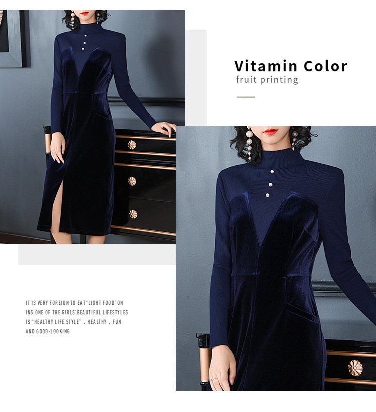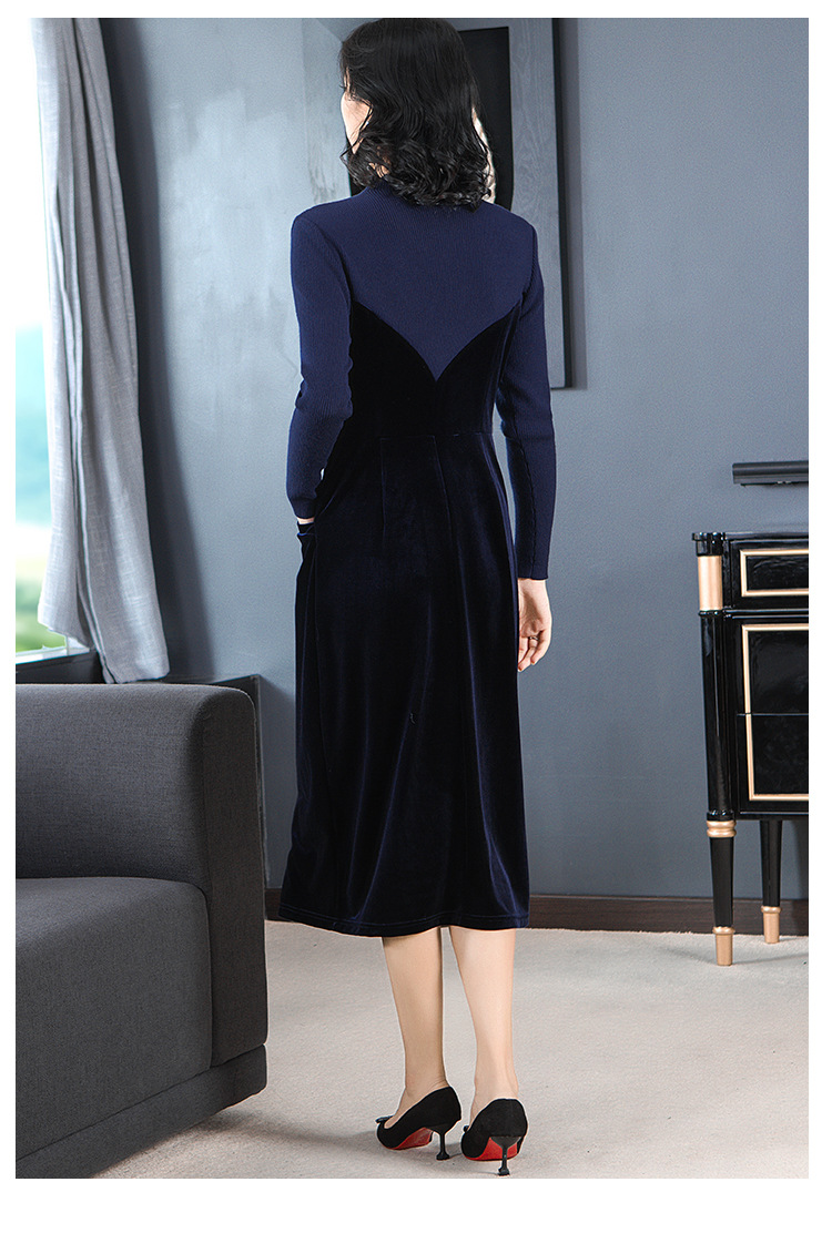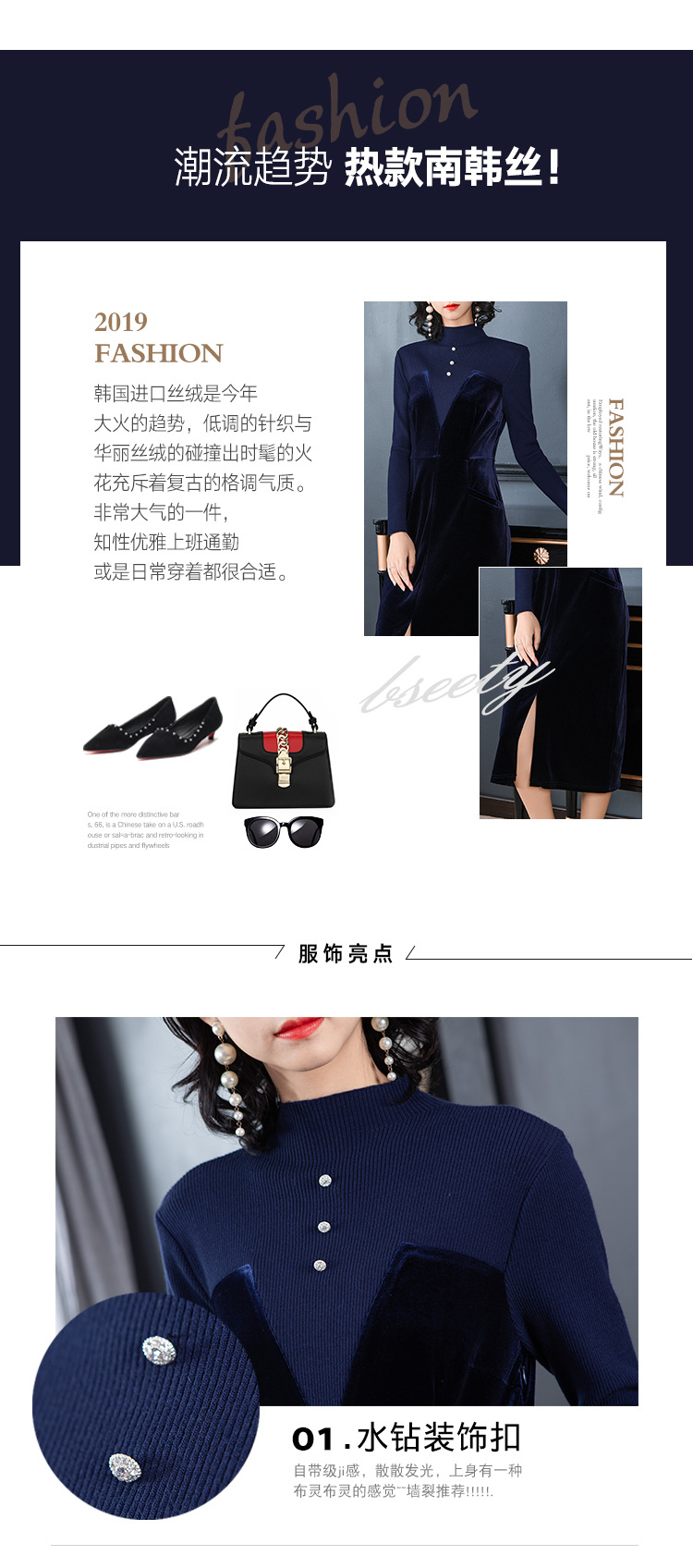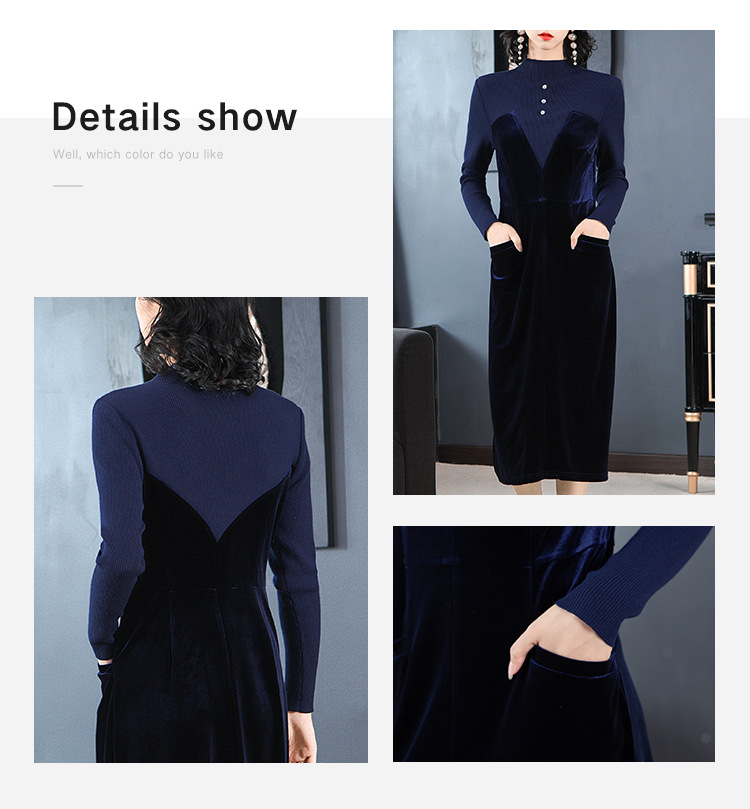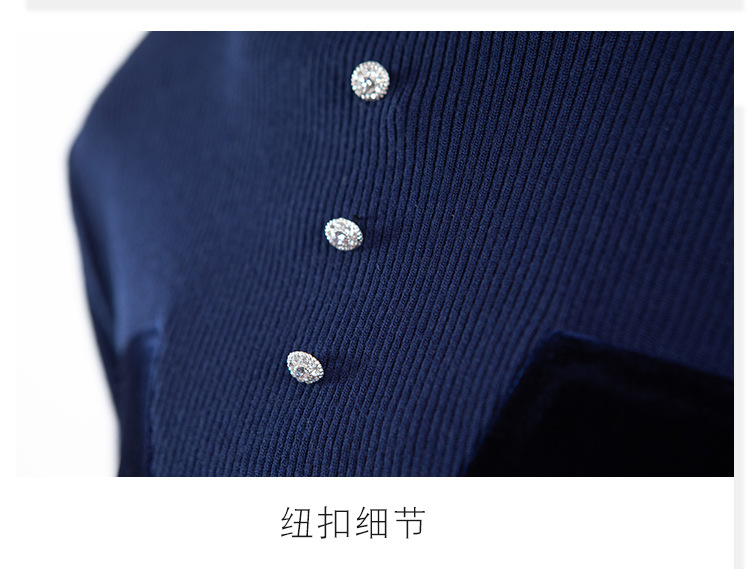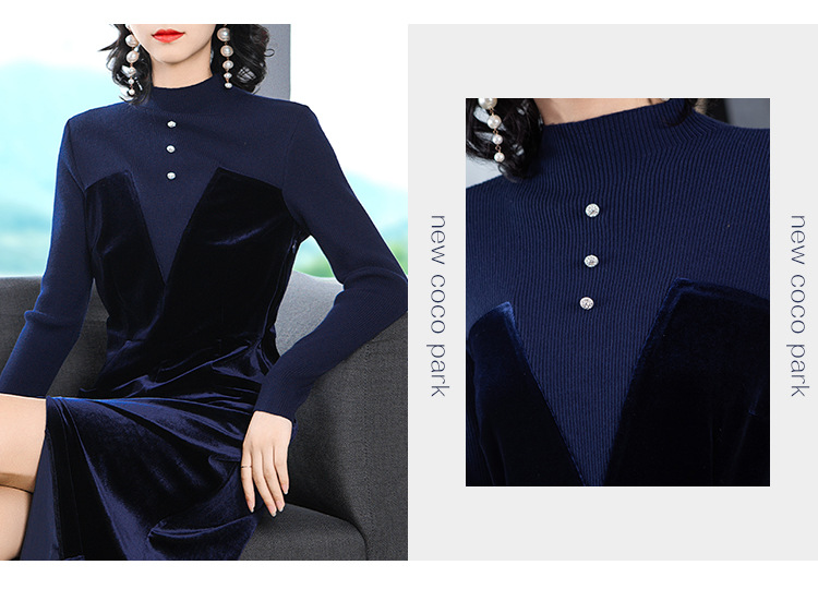 NYT-WW9336秋冬新款修身半高领钉钻纯色羊毛拼丝绒洋气高端打底连衣裙