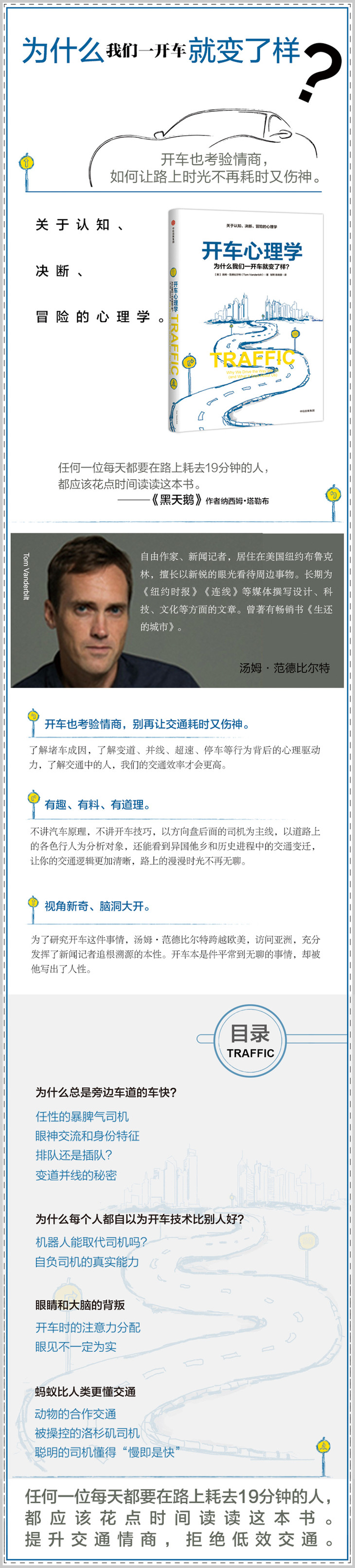 为了研究开车这件事情,汤姆•范德比尔特跨越欧美,访问亚洲,充分发挥了新闻记者追根溯源的本性。开车本是件平常到无聊的事情,却被他写出了人性。汤姆•范德比尔特擅长以新锐的眼光看待周边事物,长期为《纽约时报》《连线》等媒体撰写设计、科技、文化等方面的文章,并著有畅销书《生还的城市》。