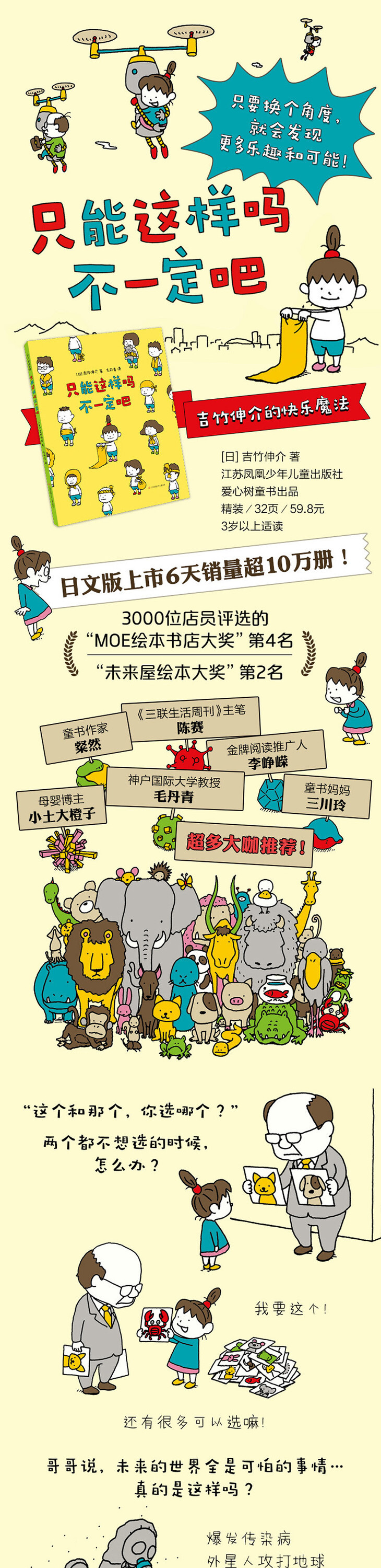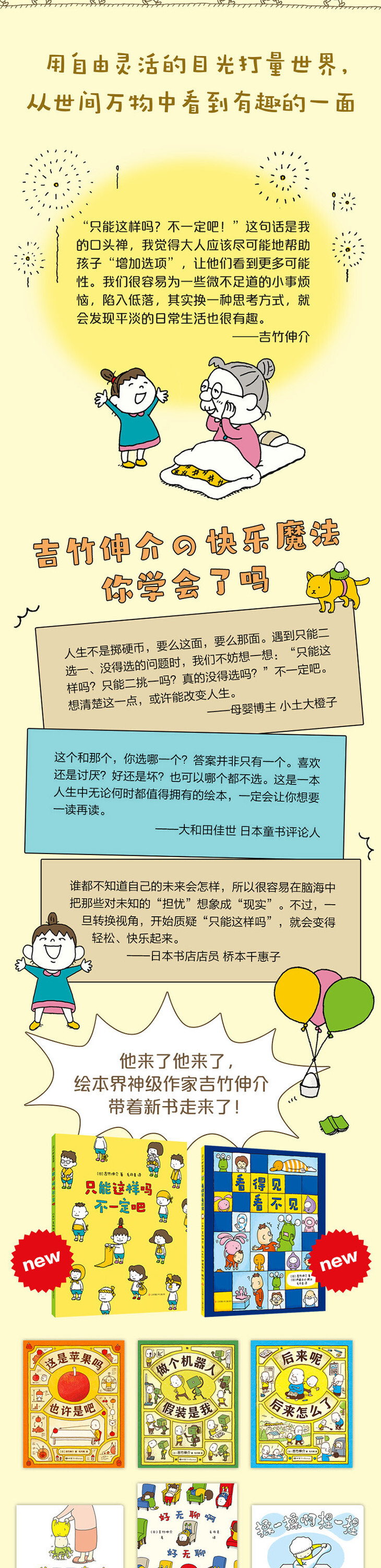 ★ “只能这样吗?不一定吧!”这句话是我的口头禅,我觉得大人应该尽可能地帮助孩子“增·加选项”,让他们看到更多可能性。我们很容易为一些微不足道的小事烦恼,陷入低落,其实换一种思考方式,就会发现平淡的日常生活也很有趣。这是我在绘本里想要表达的,也是我自救的方法。——吉竹伸介