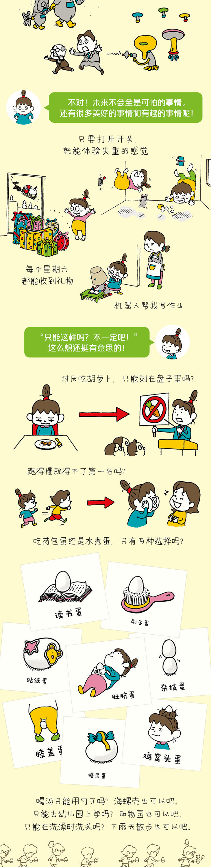 喝汤只能用勺子吗?海螺壳也可以吧。只能去幼儿园上学吗?动物园也可以吧。只能洗澡的时候洗头吗?下雨天散步也可以吧。跑得慢就得不了第-一名吗?做鬼脸比赛得第-一名也可以吧。只能这样吗?不一定吧!换个角度,就会发现更多乐趣和可能!