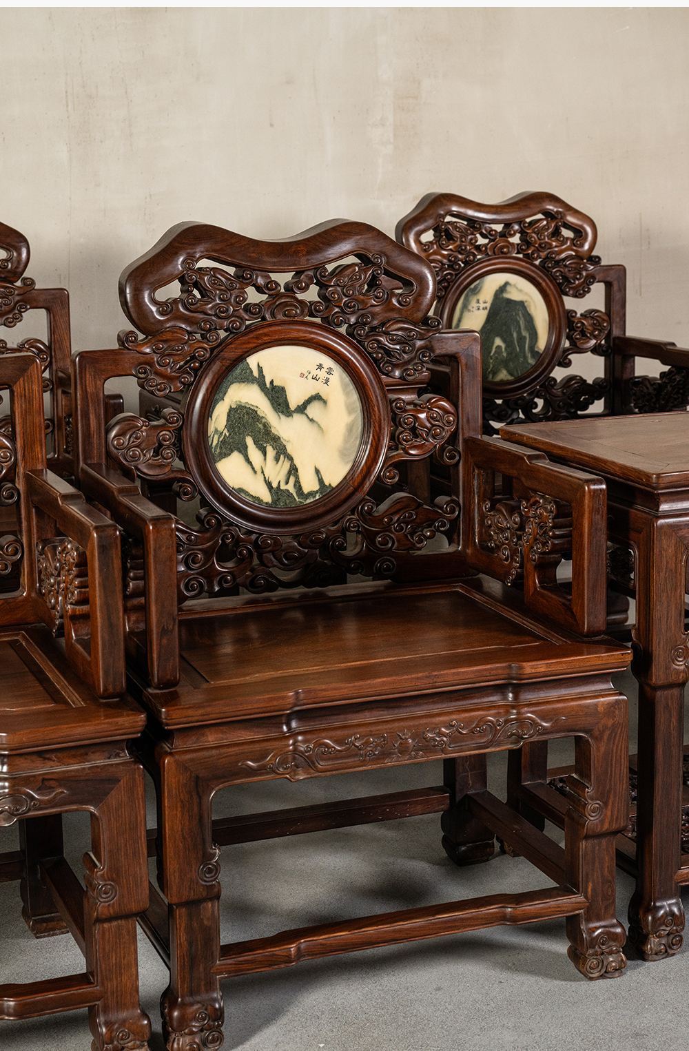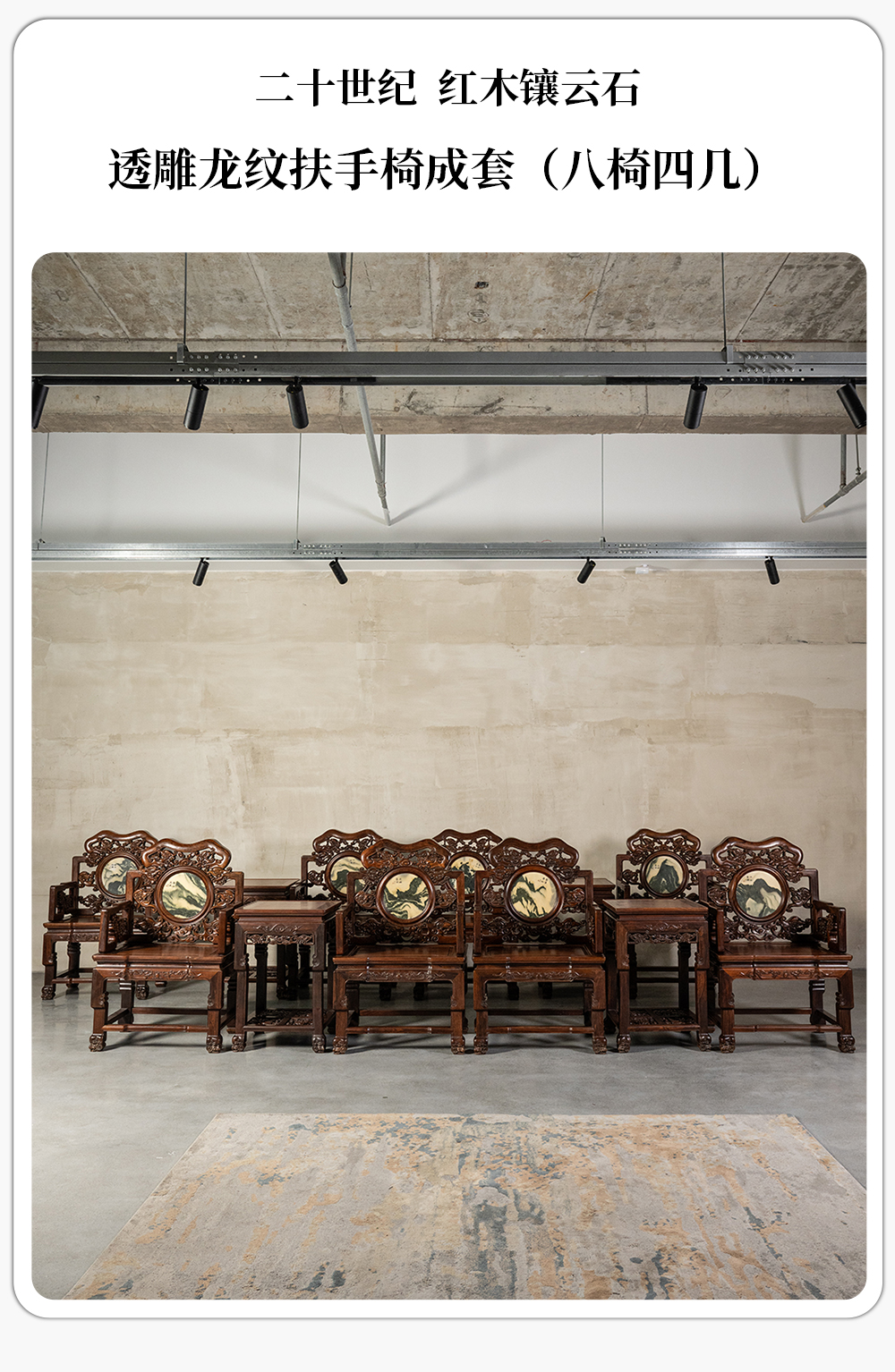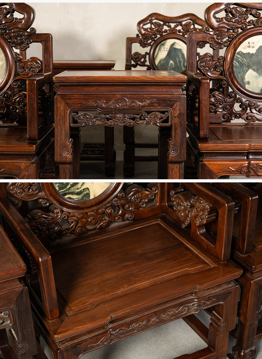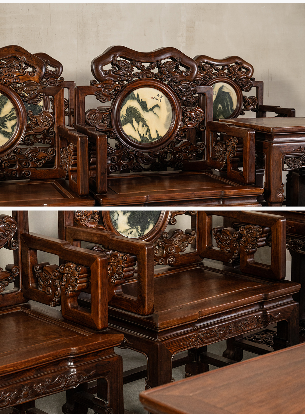 二十世纪 红木镶云石透雕龙纹扶手椅成套(八椅四几)