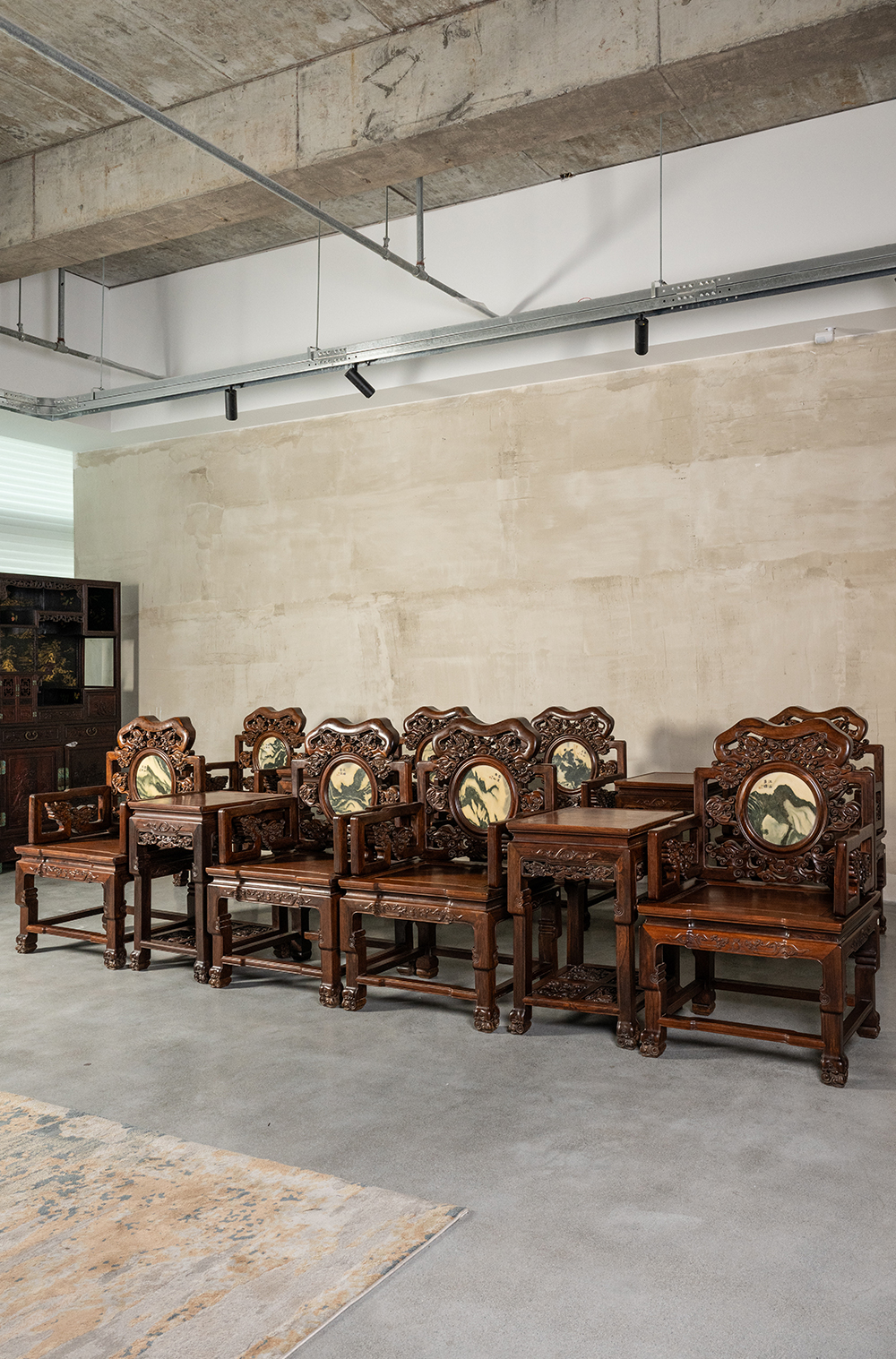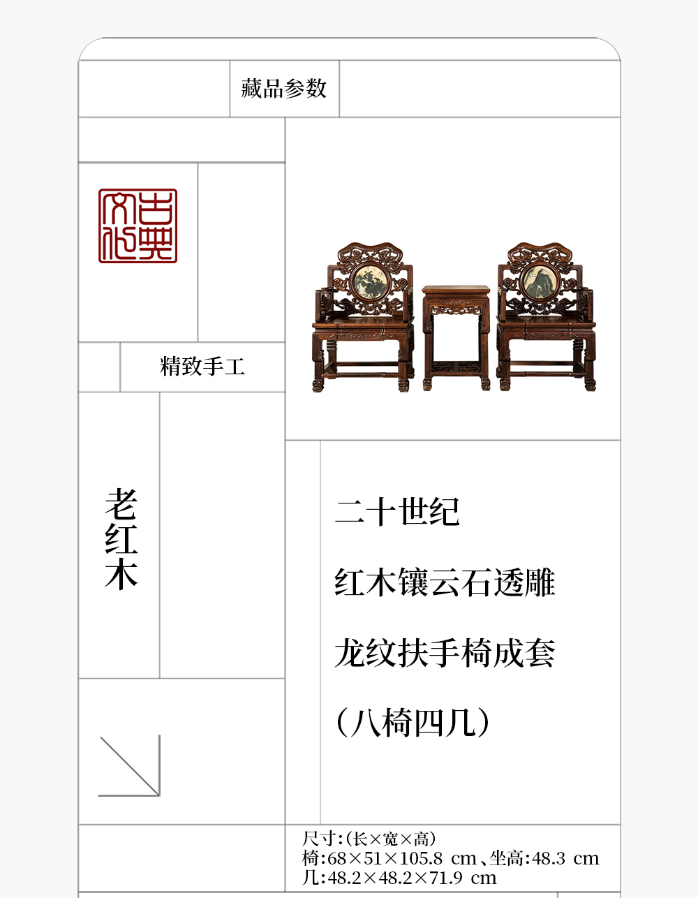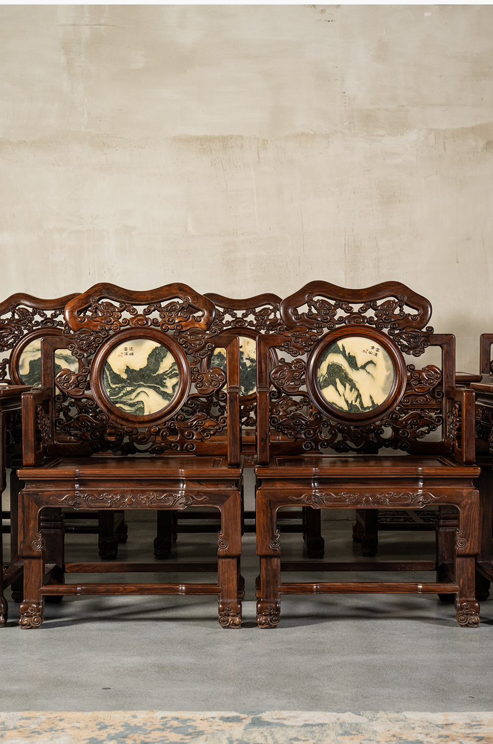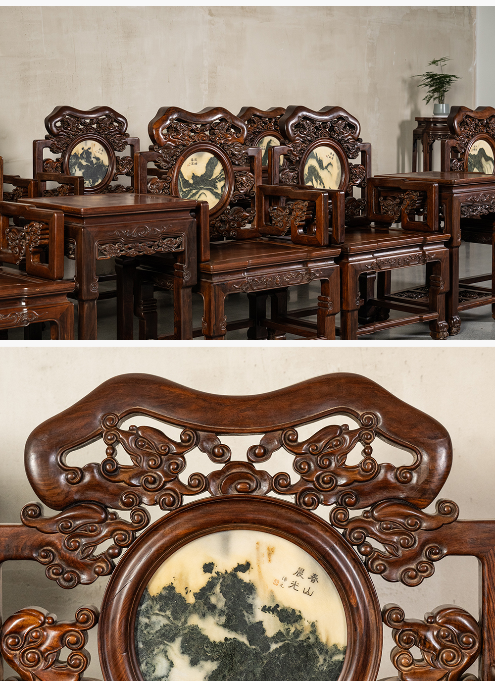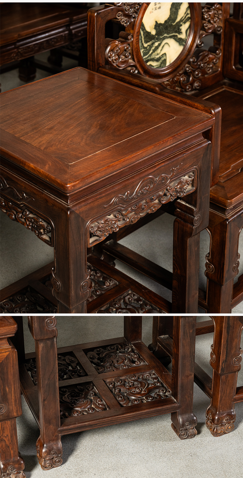 二十世纪 红木镶云石透雕龙纹扶手椅成套(八椅四几)