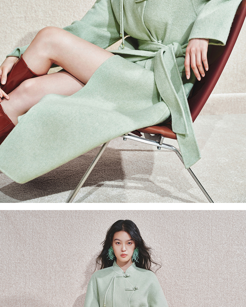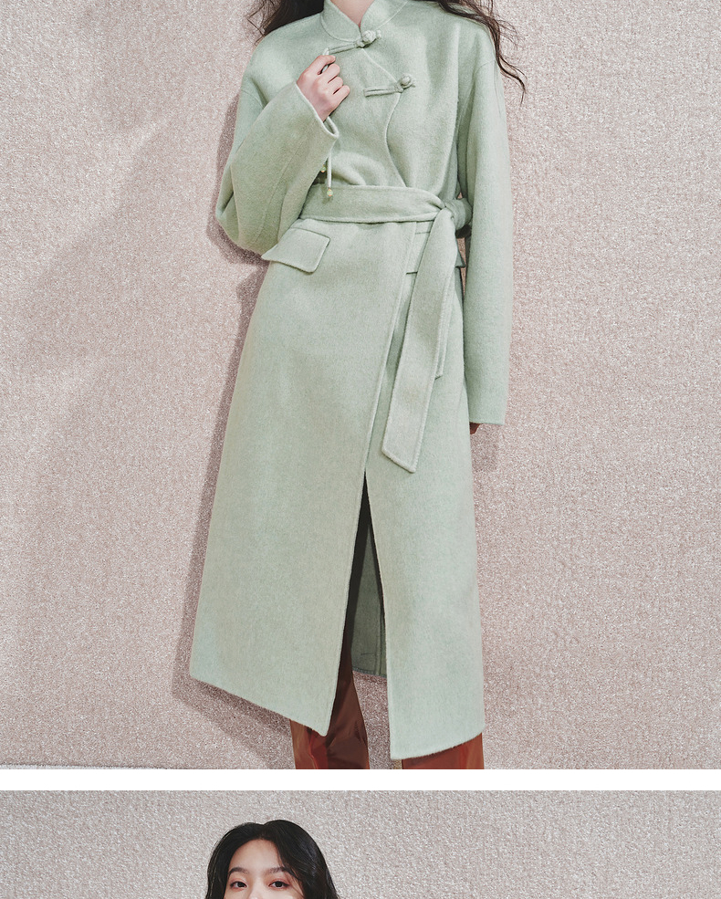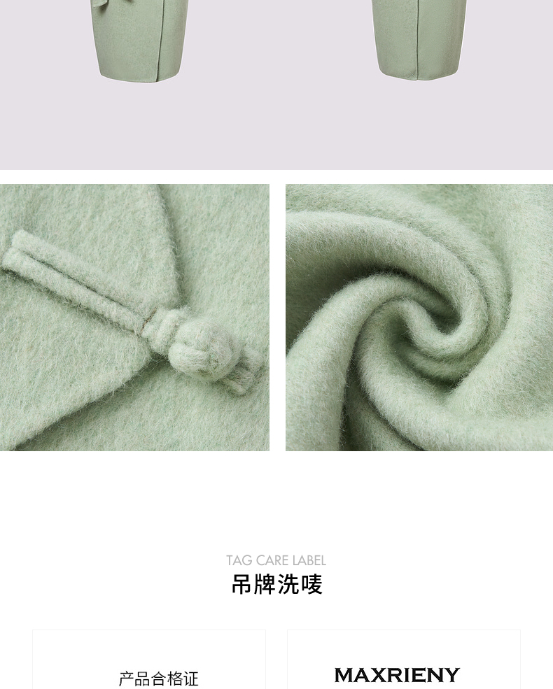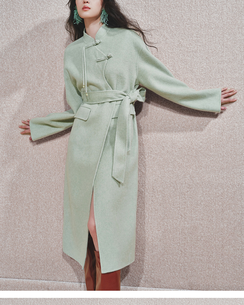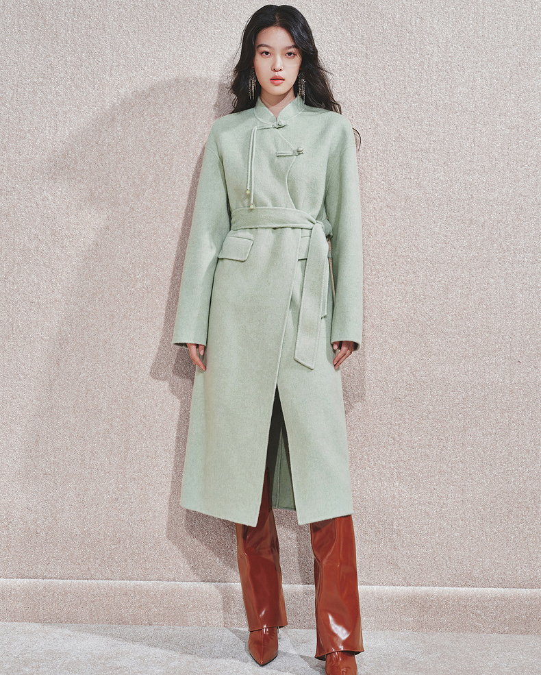 【商场同款】MAXRIENY豆绿流苏盘扣羊毛大衣女24冬保暖外套中长款(货号:MC85CT510)