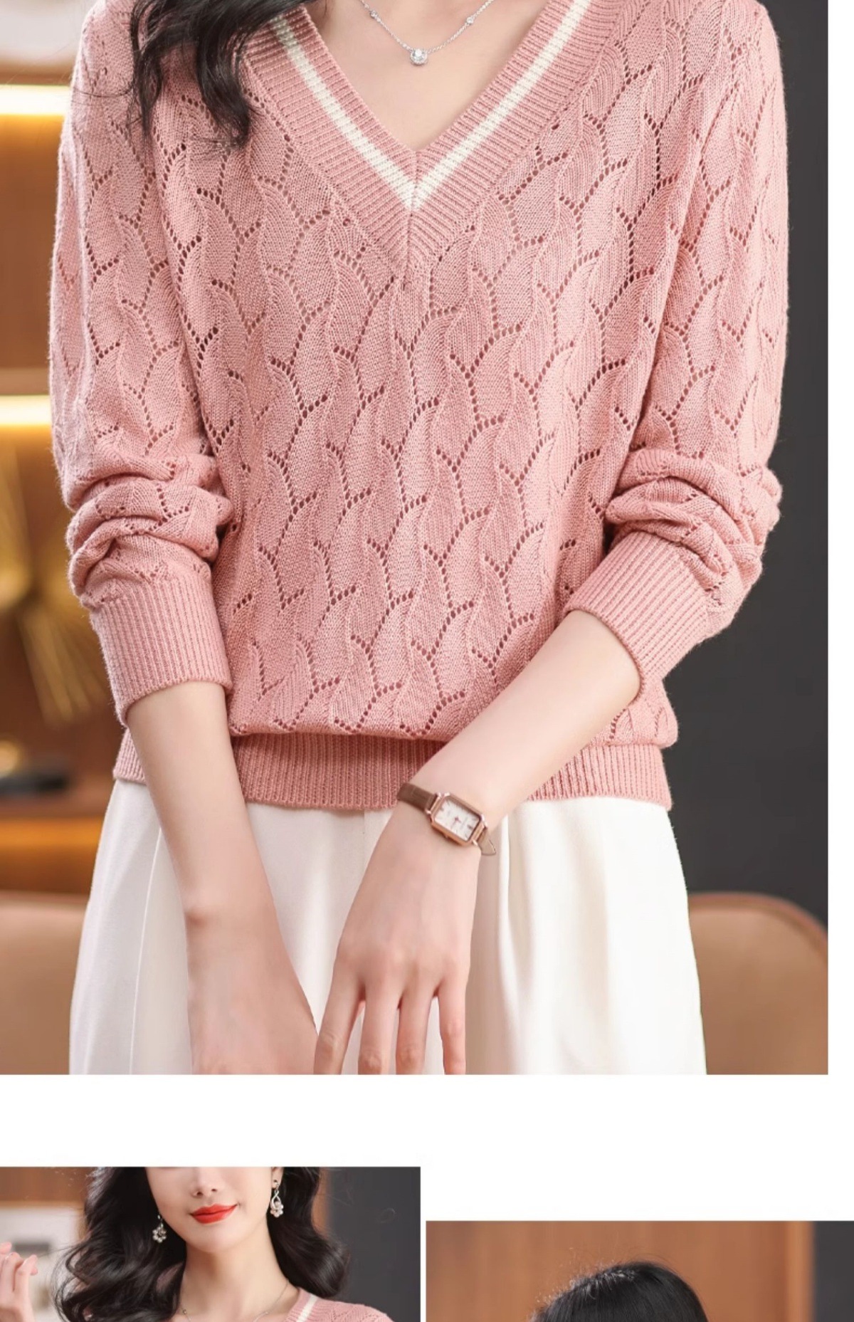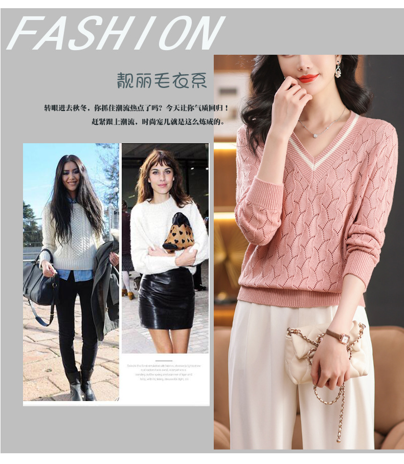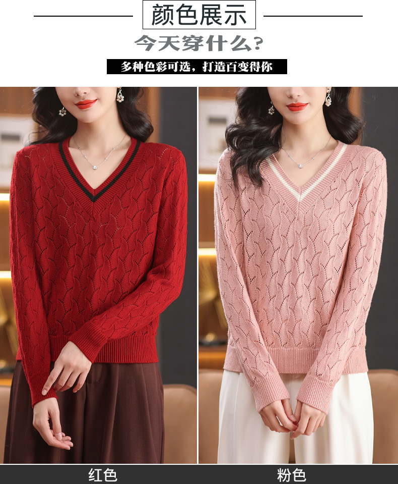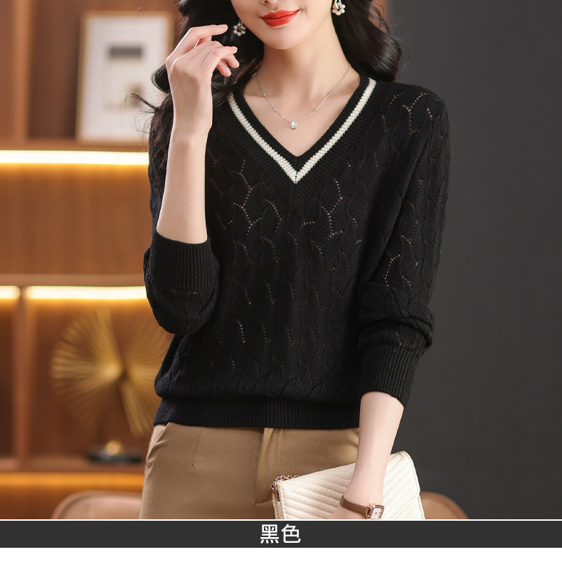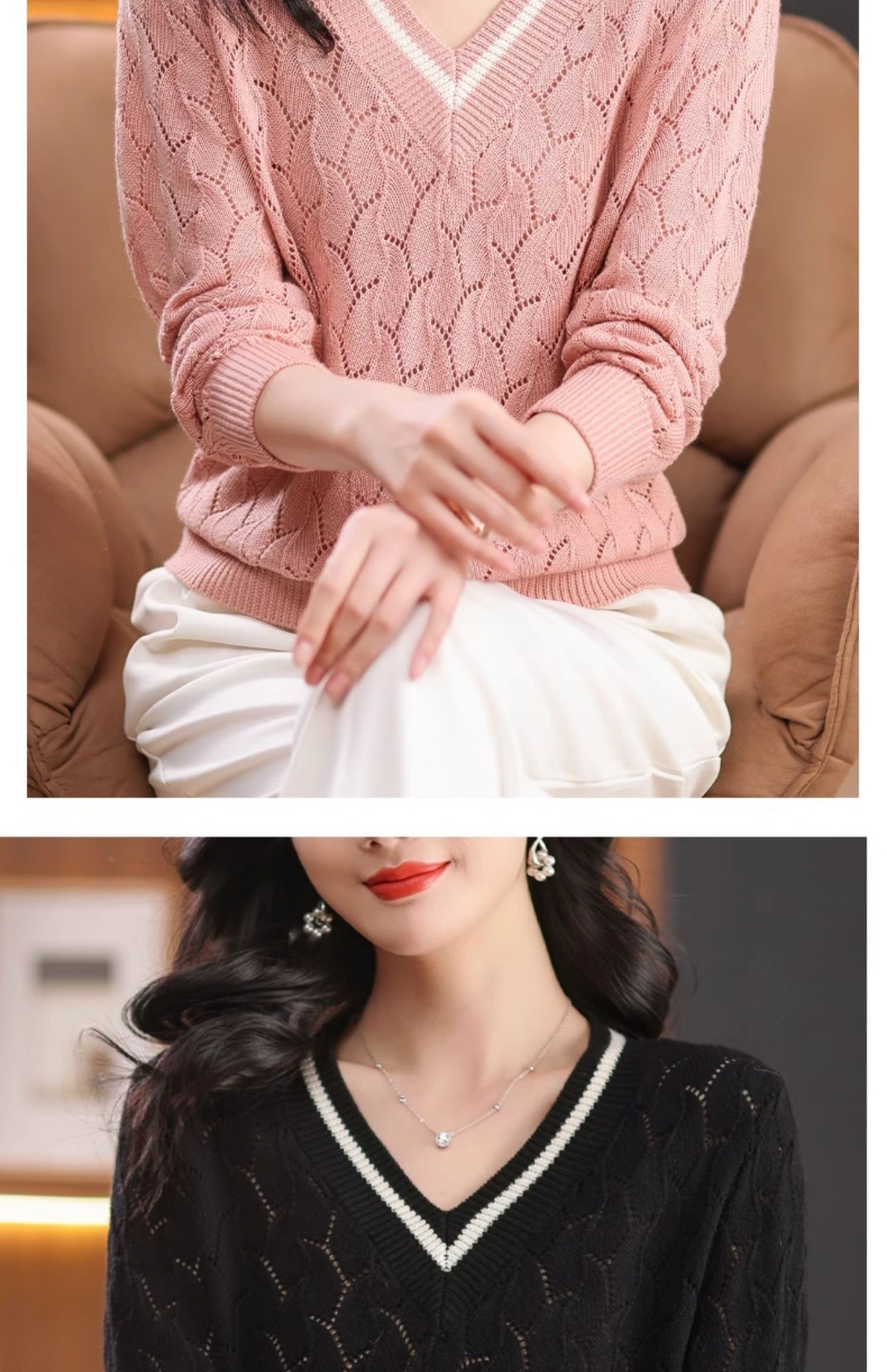 CC-102-8773春秋镂空女上衣宽松拼色简约时尚V领套头螺纹百搭毛衣打底针织衫