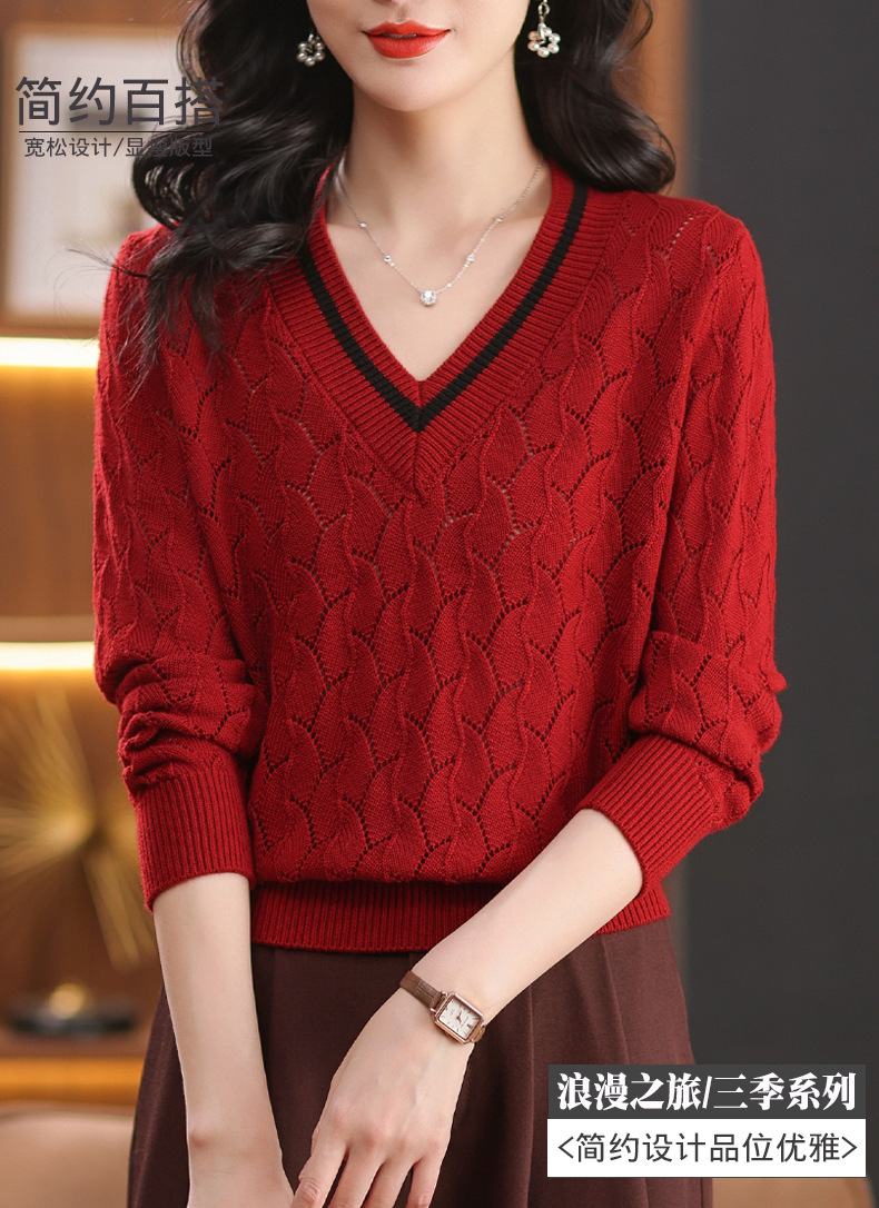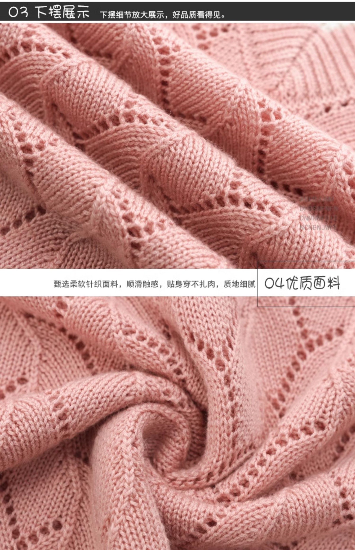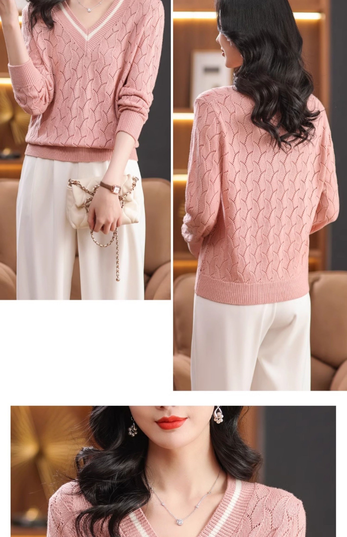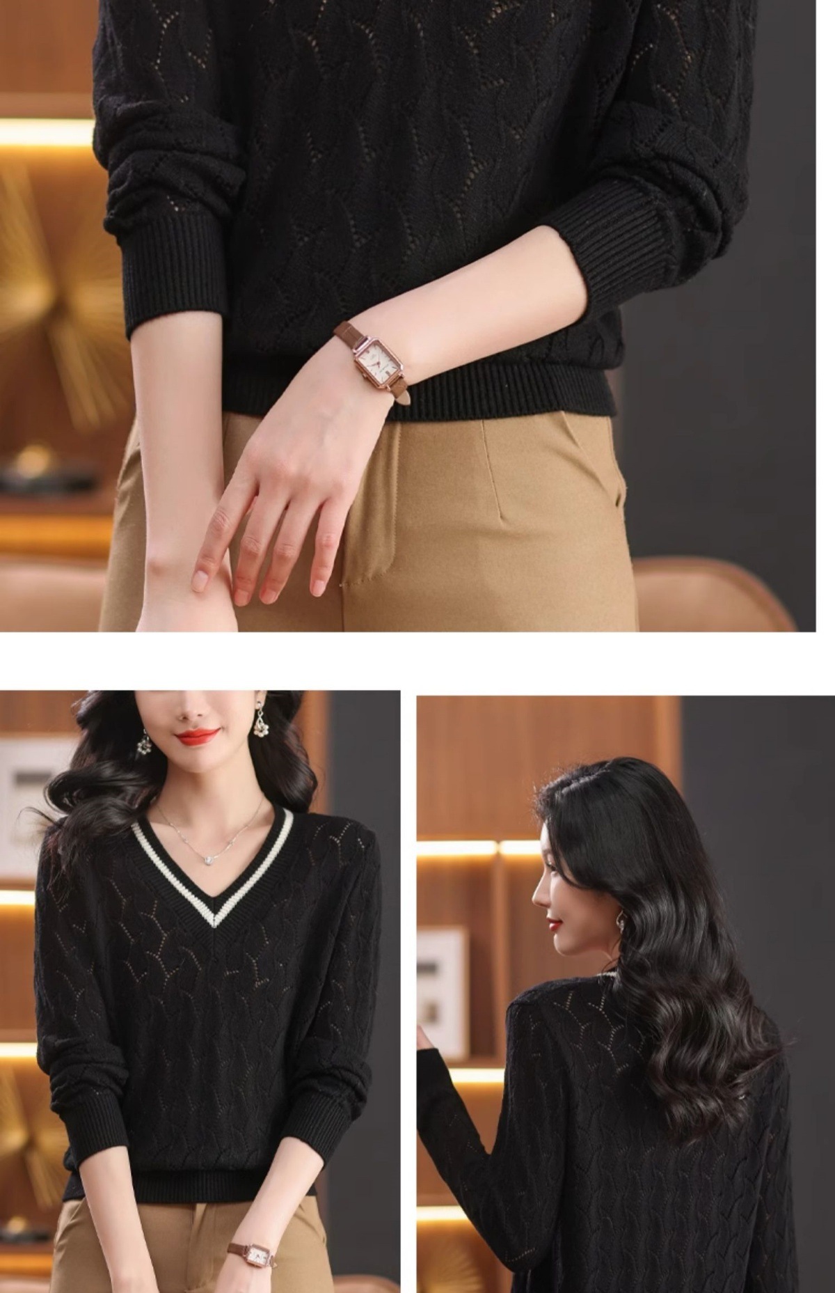 CC-102-8773春秋镂空女上衣宽松拼色简约时尚V领套头螺纹百搭毛衣打底针织衫
