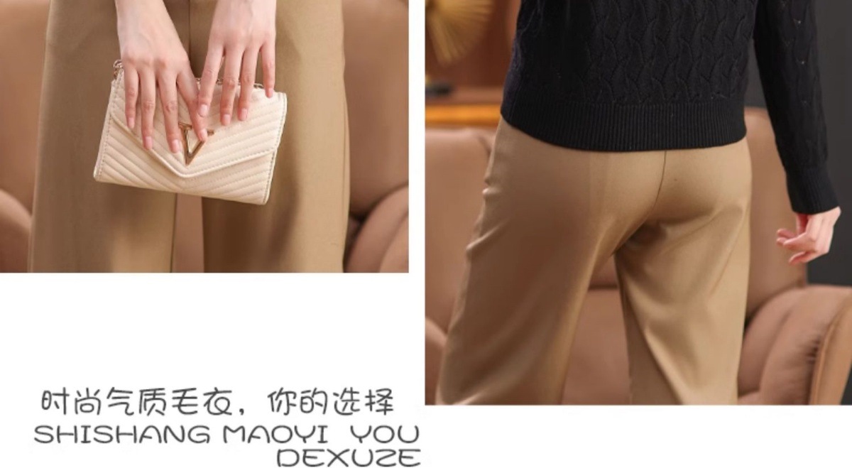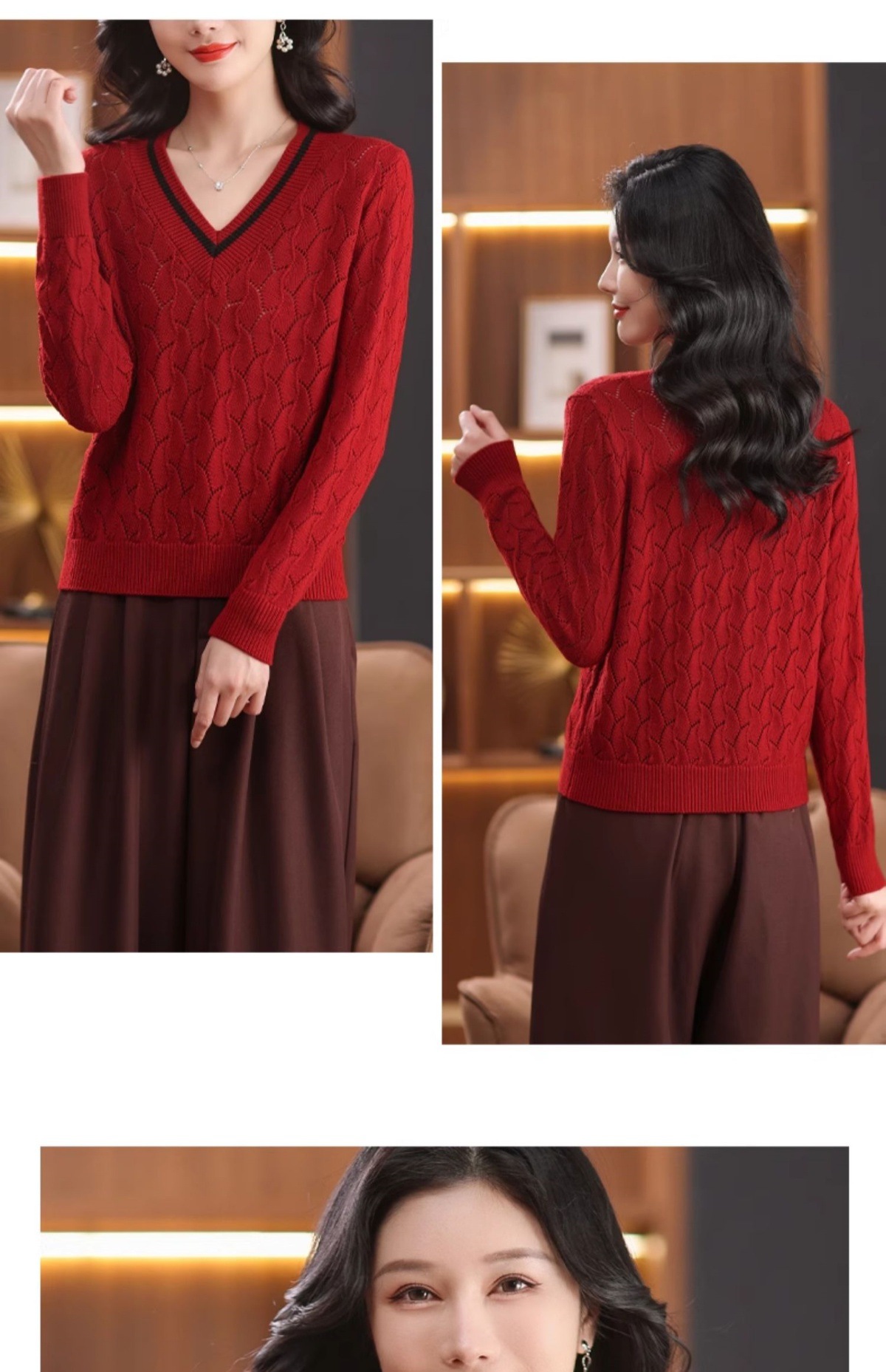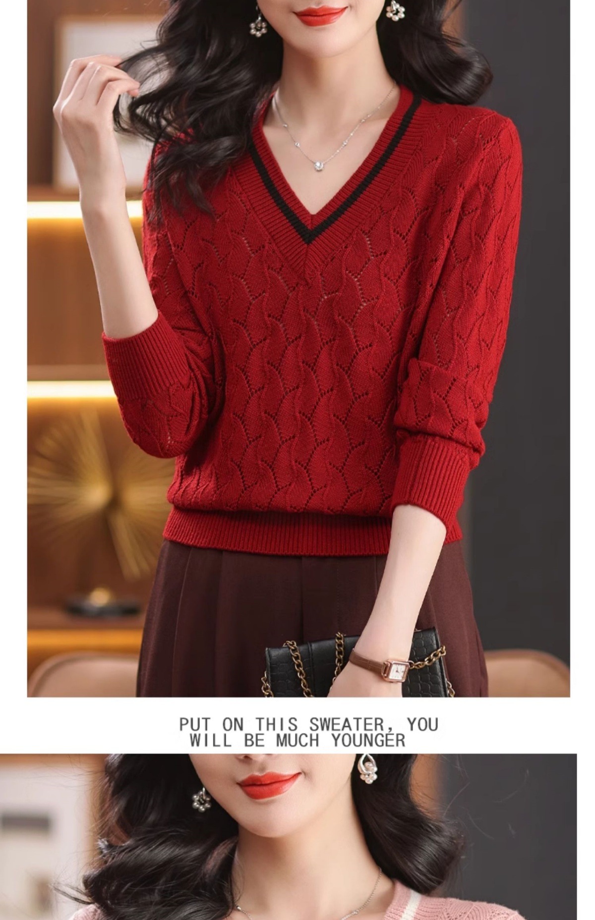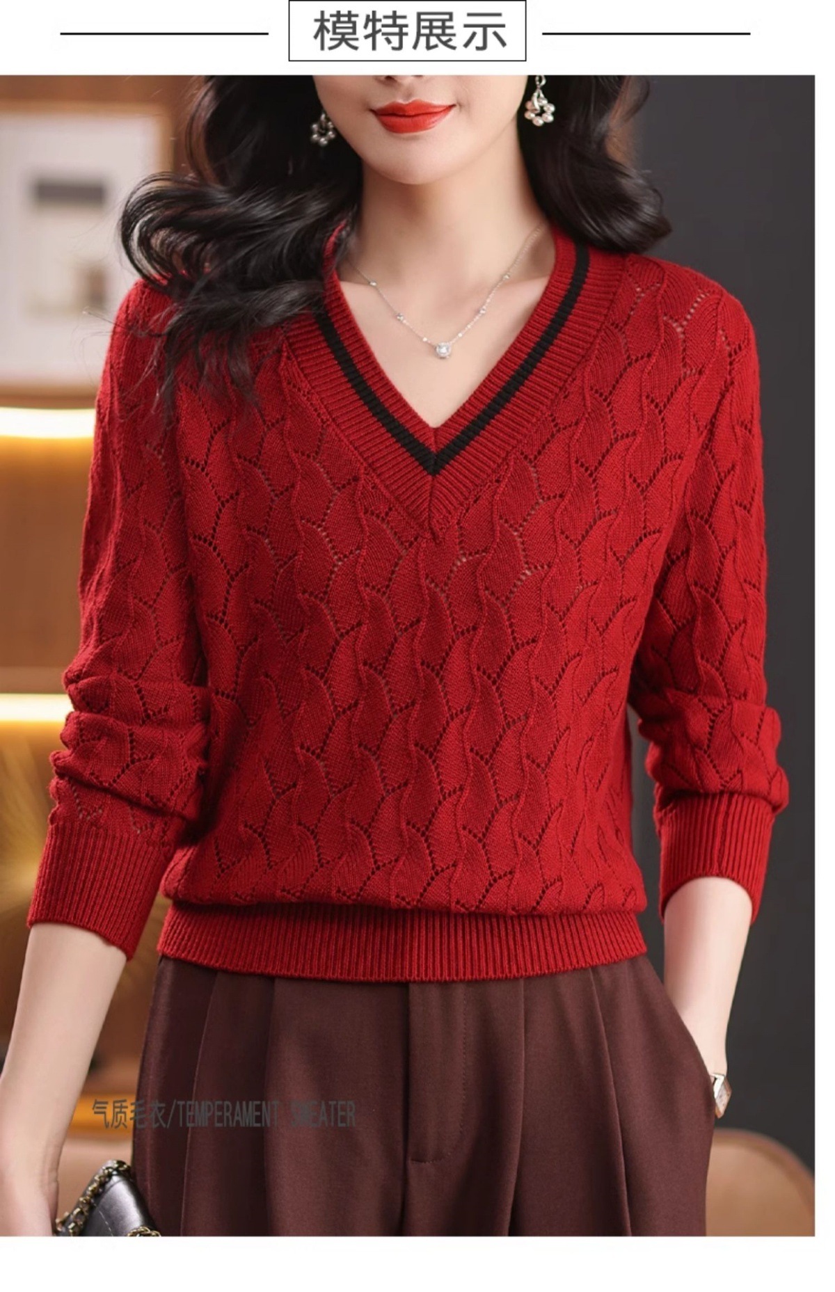 CC-102-8773春秋镂空女上衣宽松拼色简约时尚V领套头螺纹百搭毛衣打底针织衫