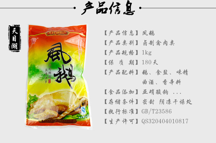 溧阳市天目湖肉类制品有限公司地处4A级旅游度假区天目湖畔,紧靠104国道和新常溧线,交通十分便利。本公司拥有国内先进的成套流水设备,全封闭无菌车间,采用天目湖源头水(国家二级水质),严格按照国家食品卫生标准生产,并采用先进的检测方法对生产工艺进行全过程全方位的质量控制。溧阳市天目湖肉类制品有限公司是江苏省农业科技型企业,常州市农业产业化经营龙头企业,荣获常州市质量管理奖和溧阳市卫生模范单位,多个产品被评为常州名优农产品。 公司生产的“天目湖”香肠及其他肉制品、禽类、鱼类、土特产、休闲食品等六个系列80多个品种,采用传统生产工艺结合现代技术加工而成,选料考究,主辅料搭配合理,成品色泽鲜亮,口感鲜美,适宜蒸、煮、爆、炒、炸等不同方法烹饪,老少皆宜。 产品已远销北京、上海、广东、安徽、苏州、杭州等大中城市,深受消费者的喜爱。