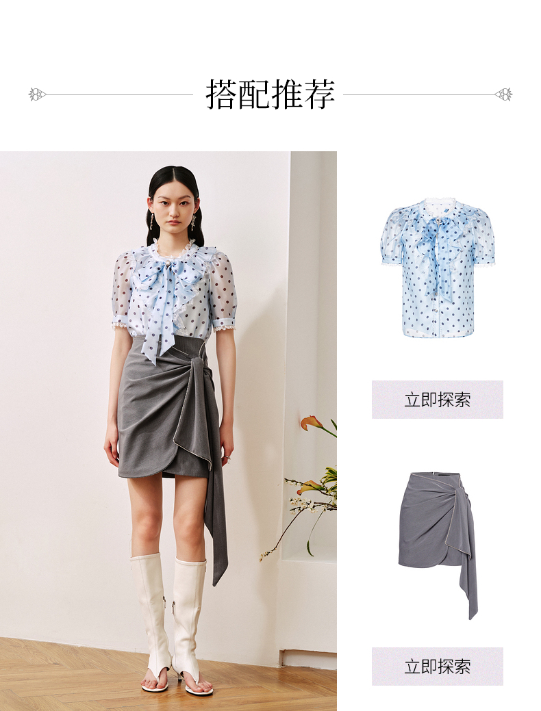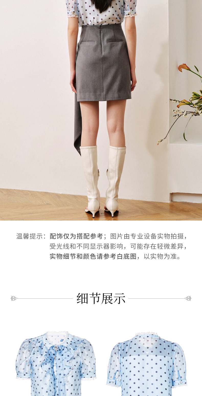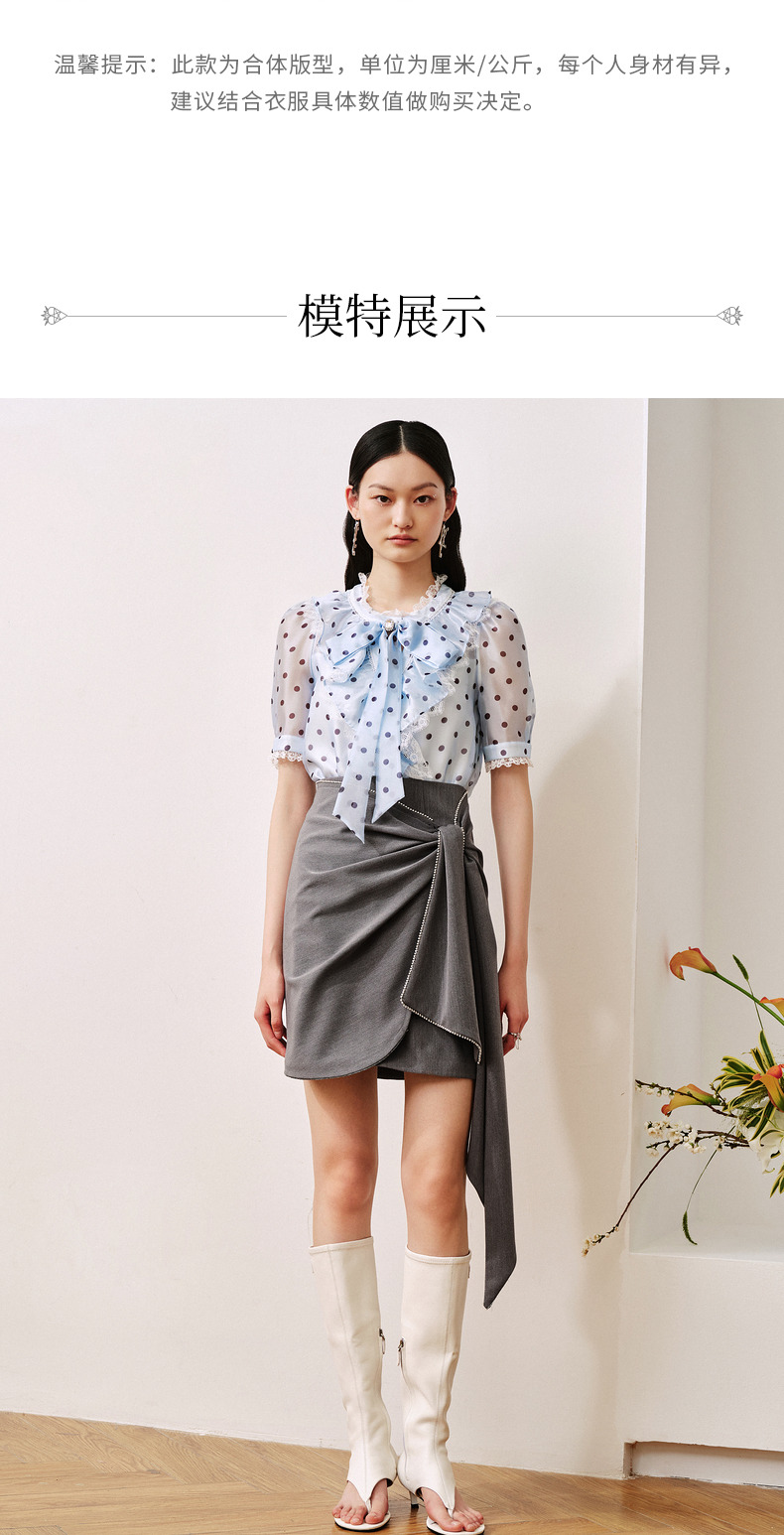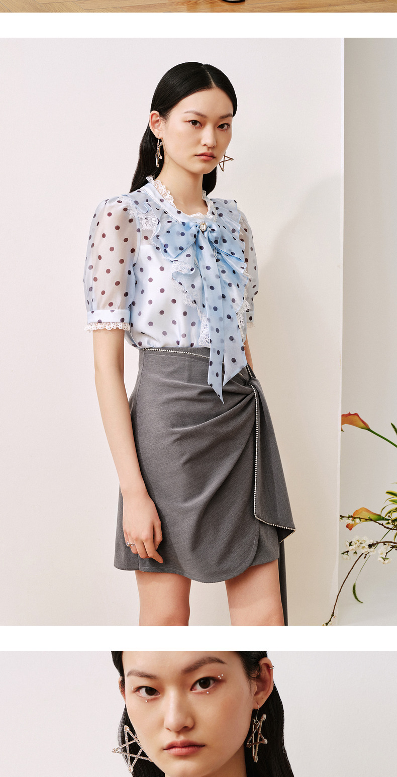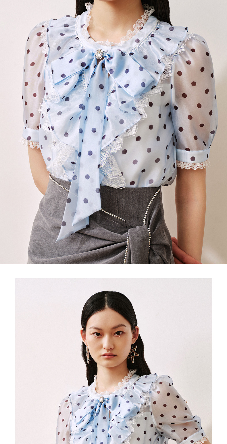 MAXRIENY复古宫廷风蓝波点雪纺衫通勤泡泡袖上衣(货号:MC88TP508)