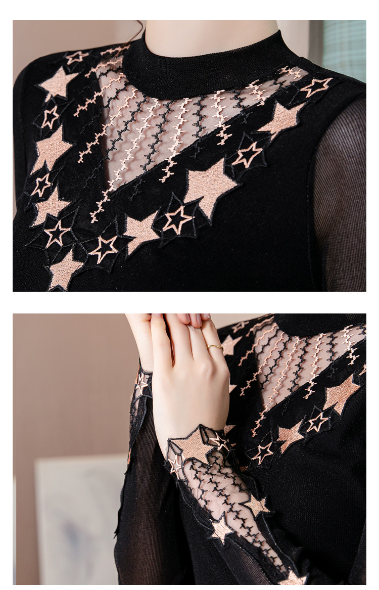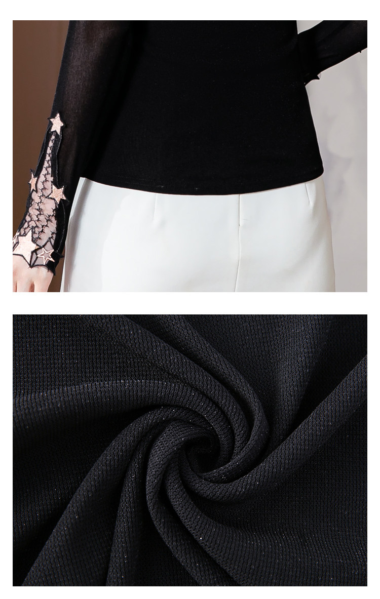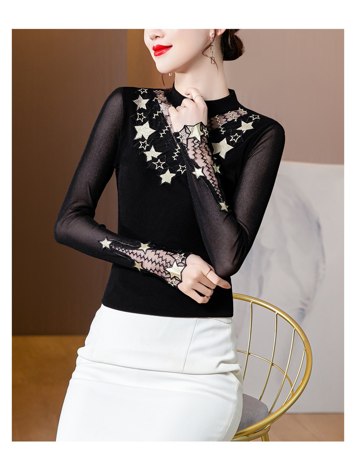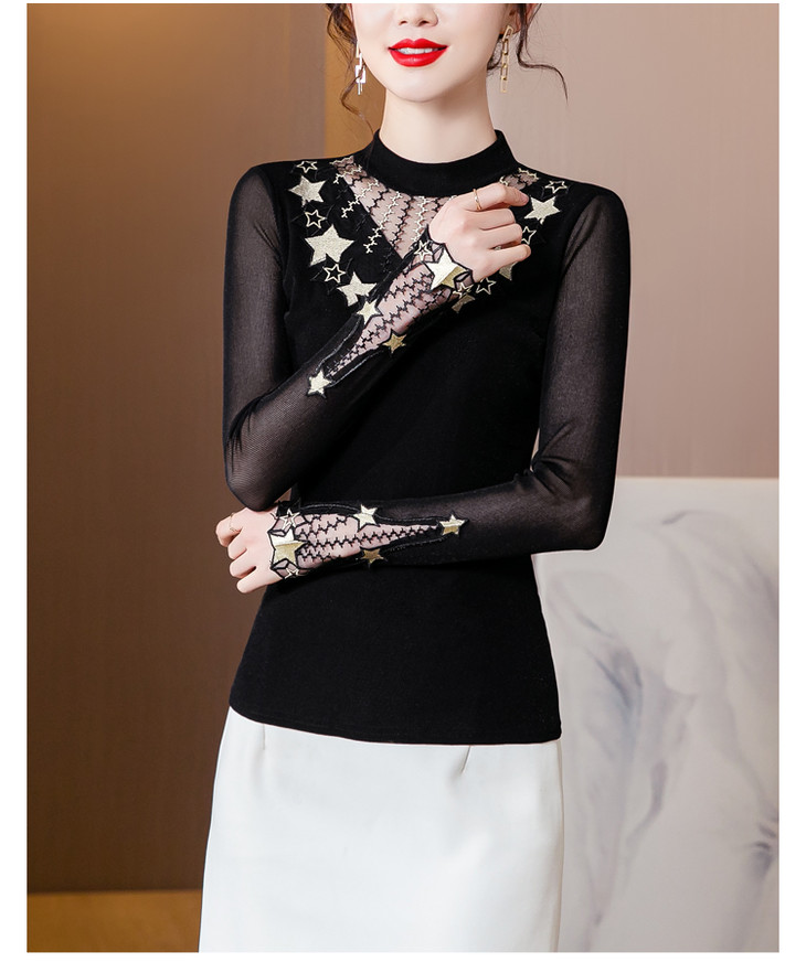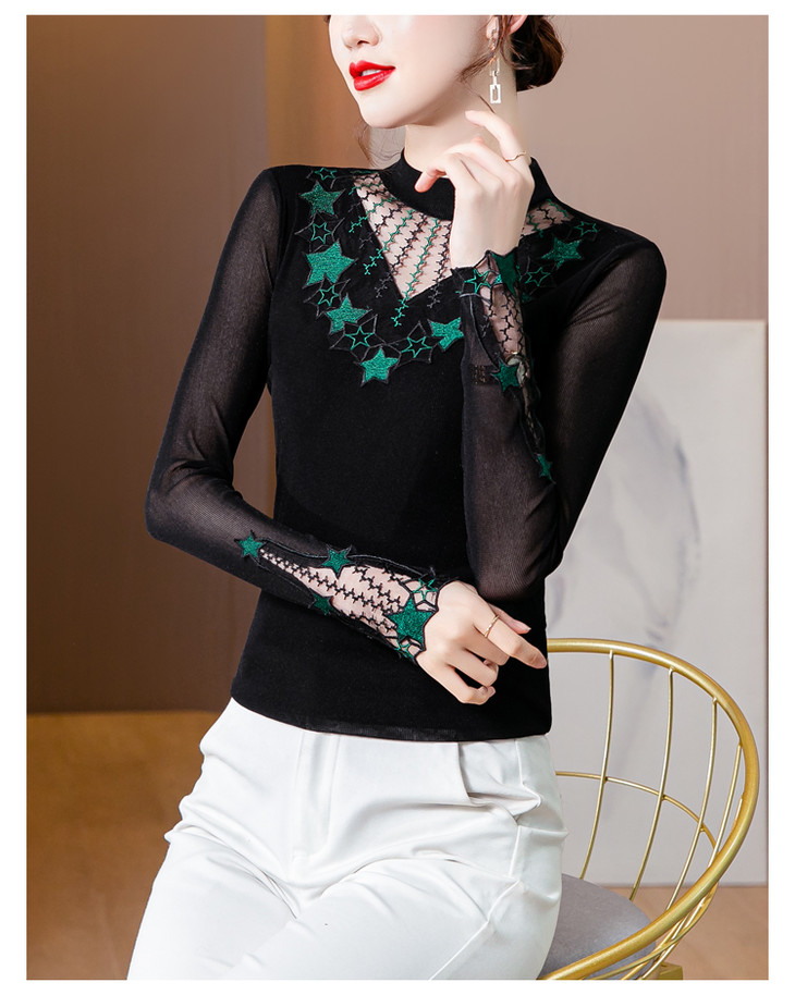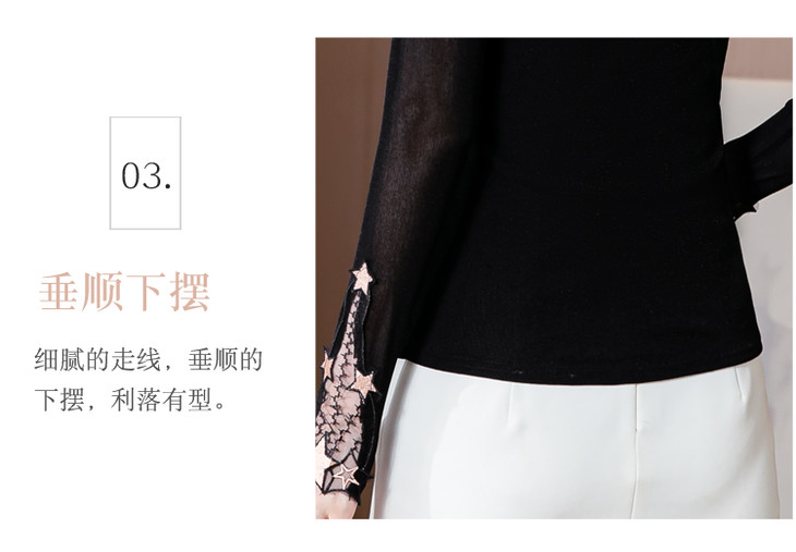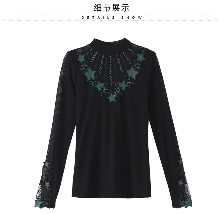 KQL 705G1706新款修身显瘦大码半高领蕾丝长袖网纱T恤