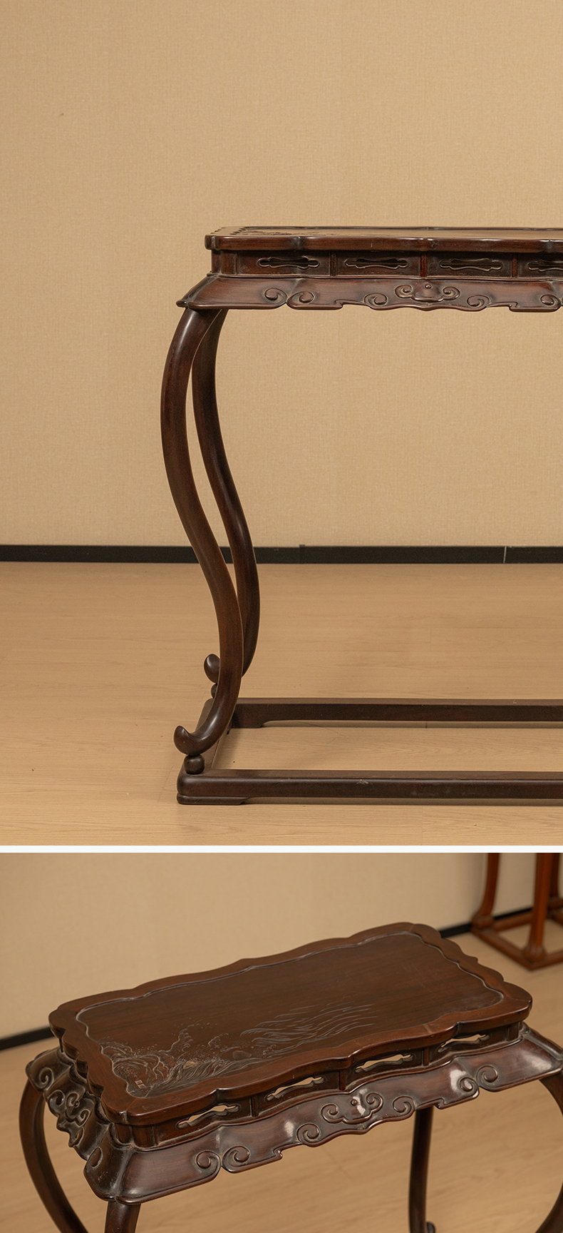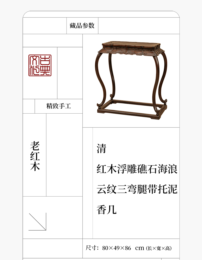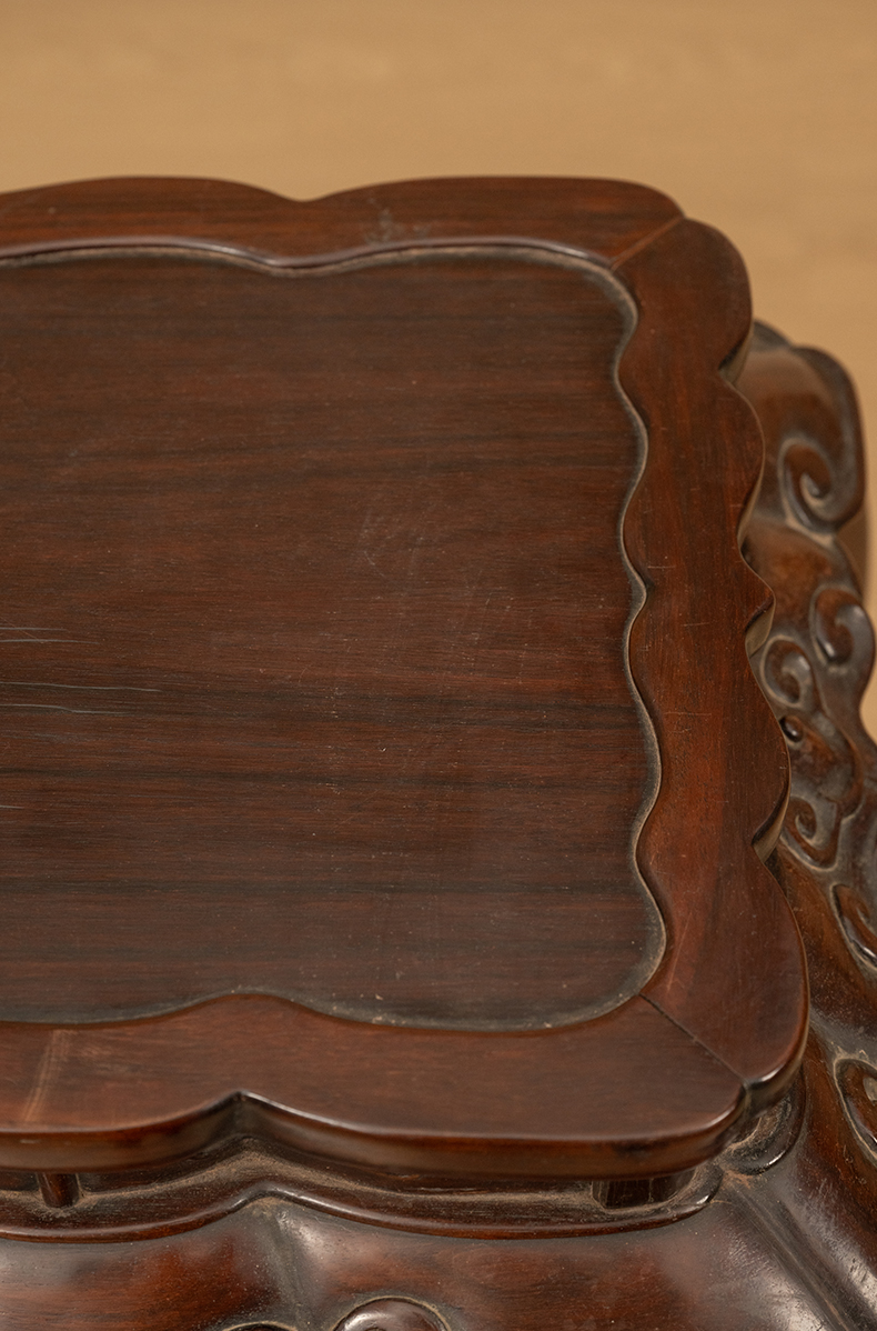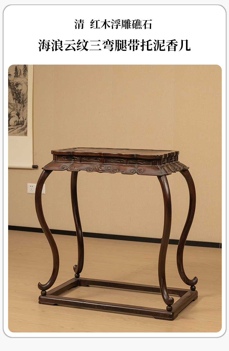 清 红木浮雕礁石海浪云纹三弯腿带托泥香几