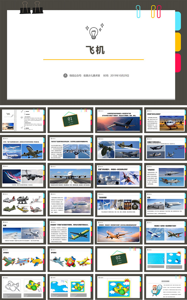 通过参考飞机的素材图片,感受飞机的造型变化,描绘出飞机不同的造型,运用马克笔(水彩笔)涂上鲜艳的色彩,分析画面的色彩对比,丰富细节,在深入刻画的时候注意色彩的变化,用邻近色、对比色进行描绘,通过色相和纯度的差别进行区分,增强生动感和空间感。