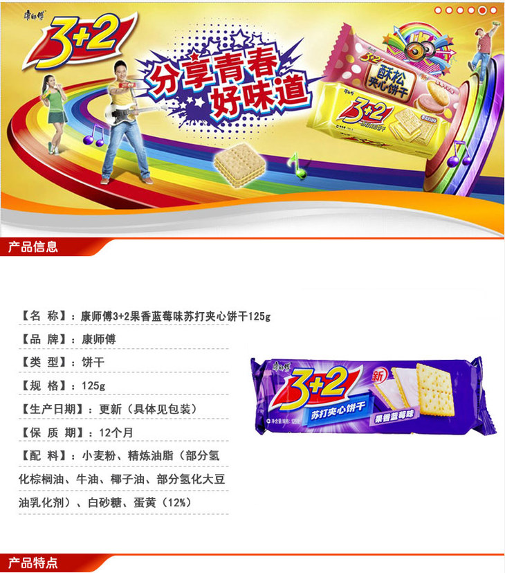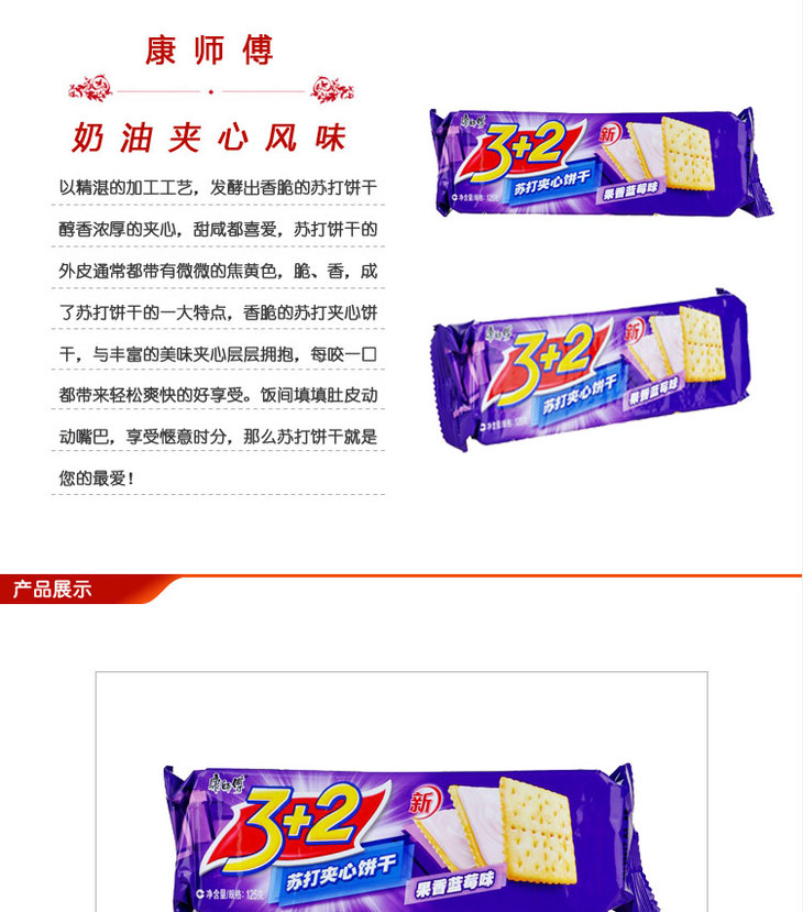 【百汇到家】康师傅3+2苏打鲜果蓝莓味饼干125g