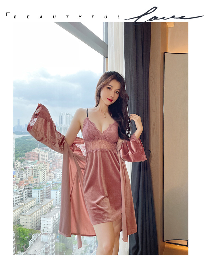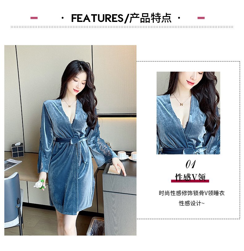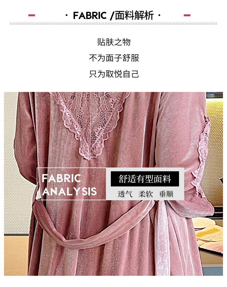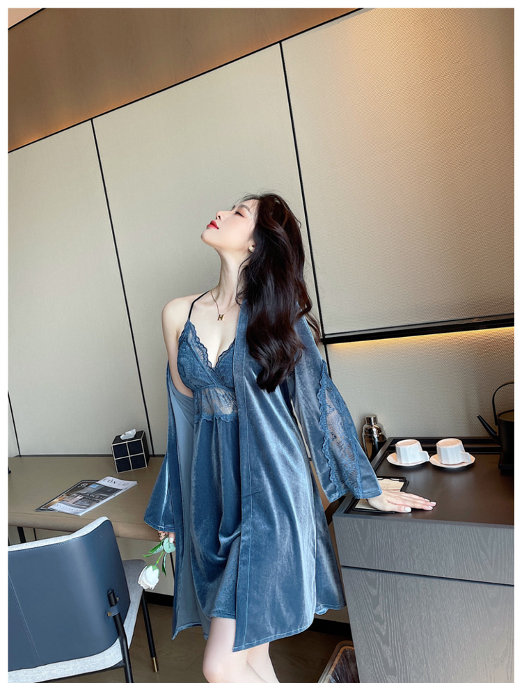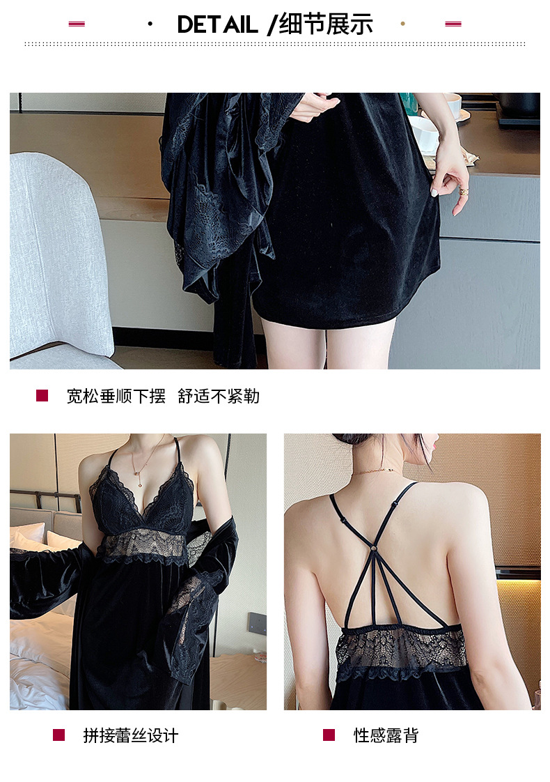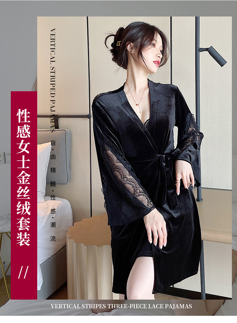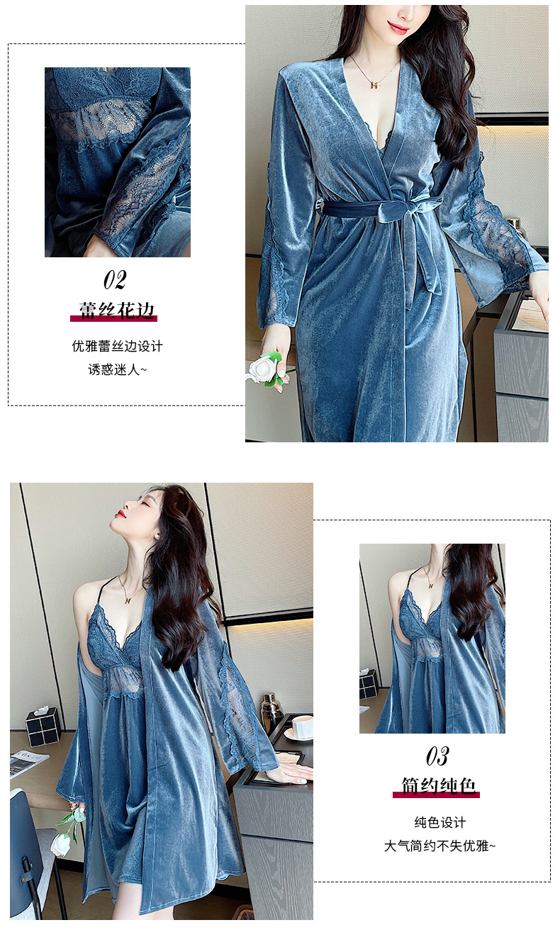 秋冬季新款睡衣金丝绒性感吊带睡裙睡袍两件套蕾丝长袖睡衣女 QYSY2601